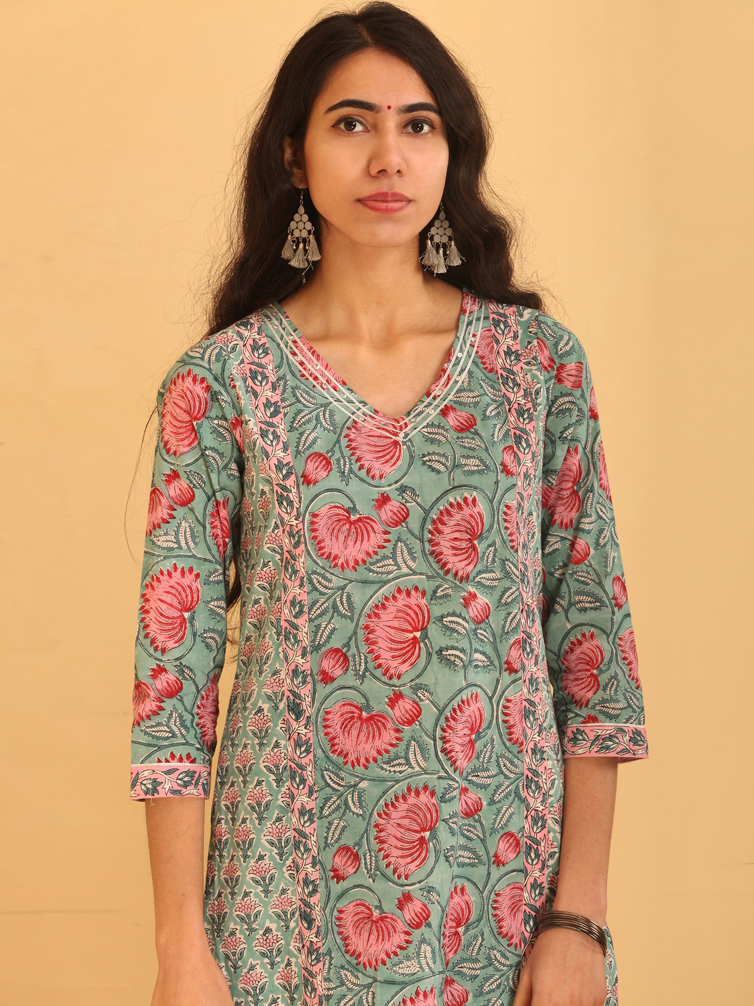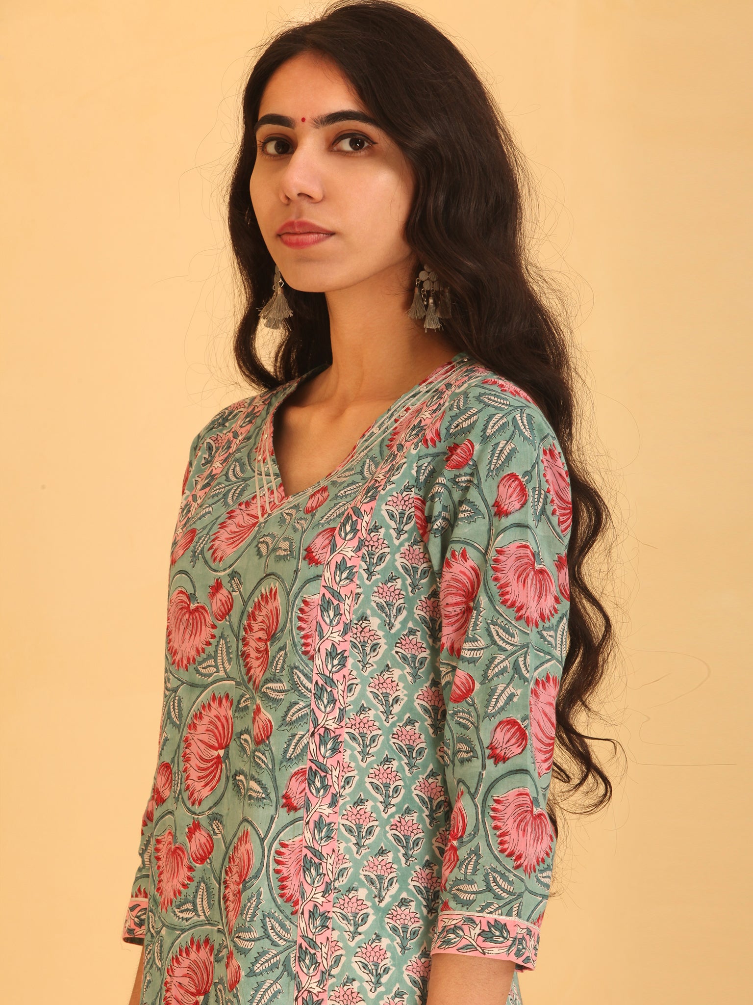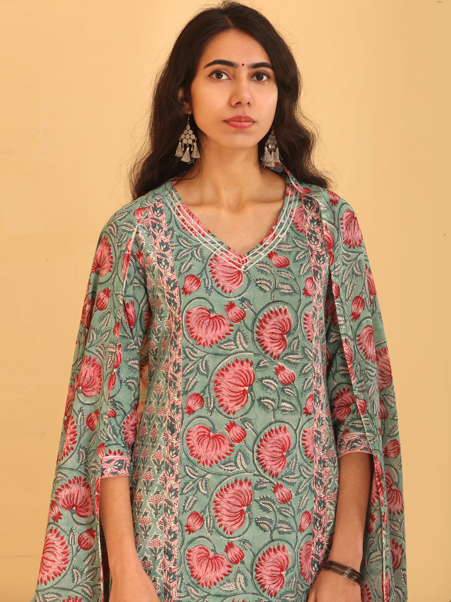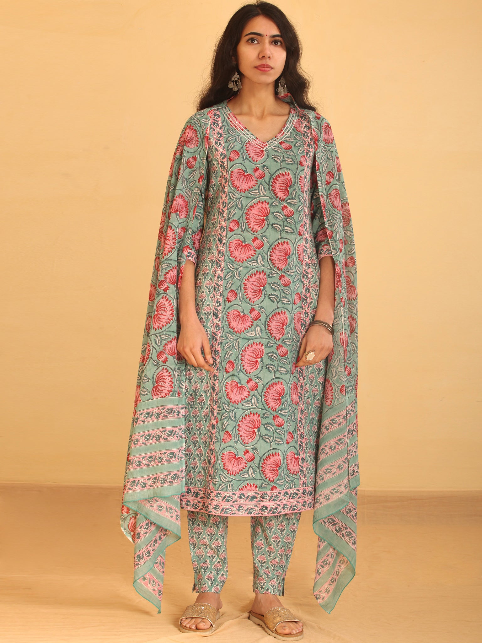 Product: This set contains Handcrafted Sanganeri Premium Cotton Kurta, 100% Cotton Pants and Cotton Dupatta.