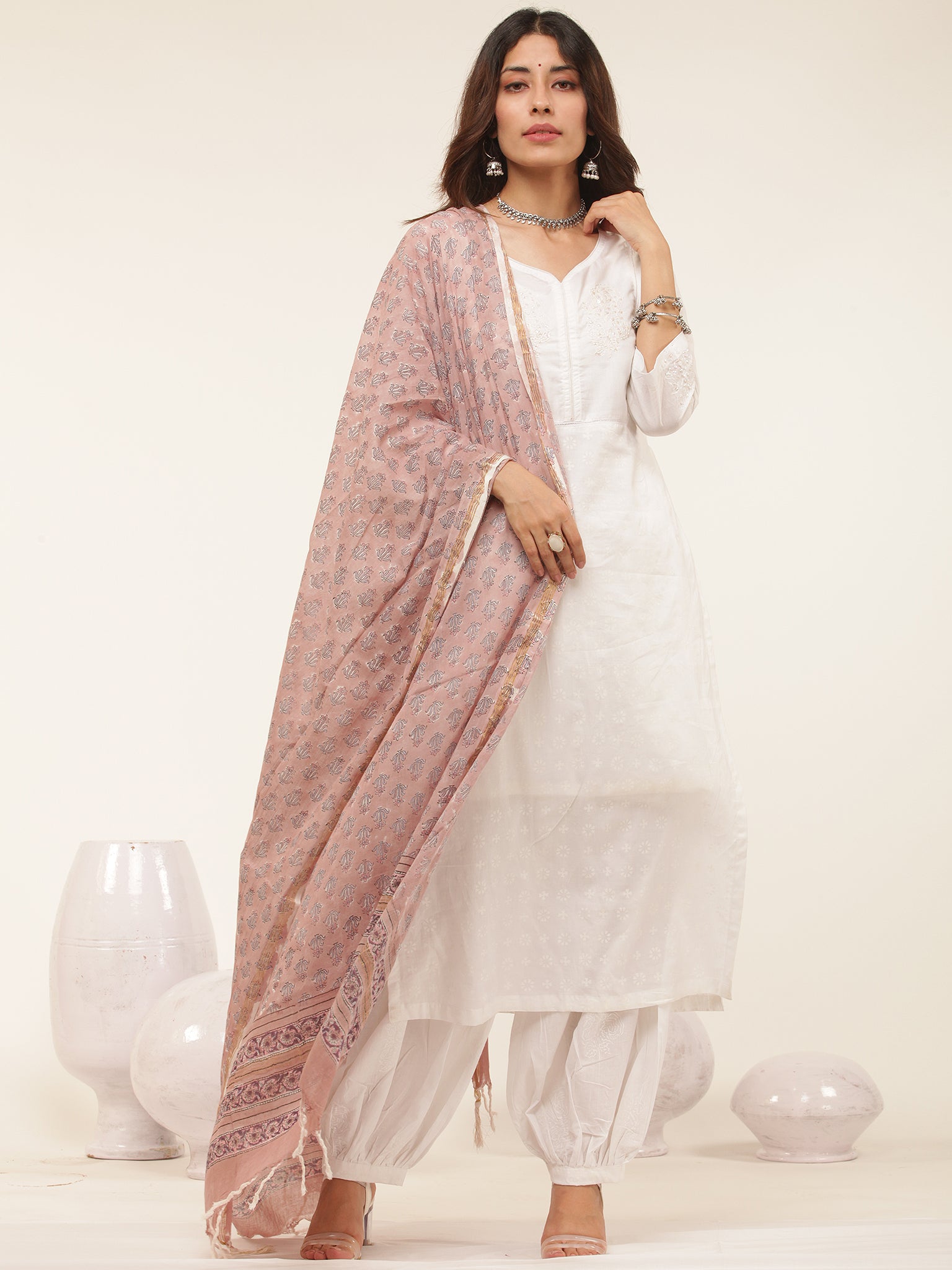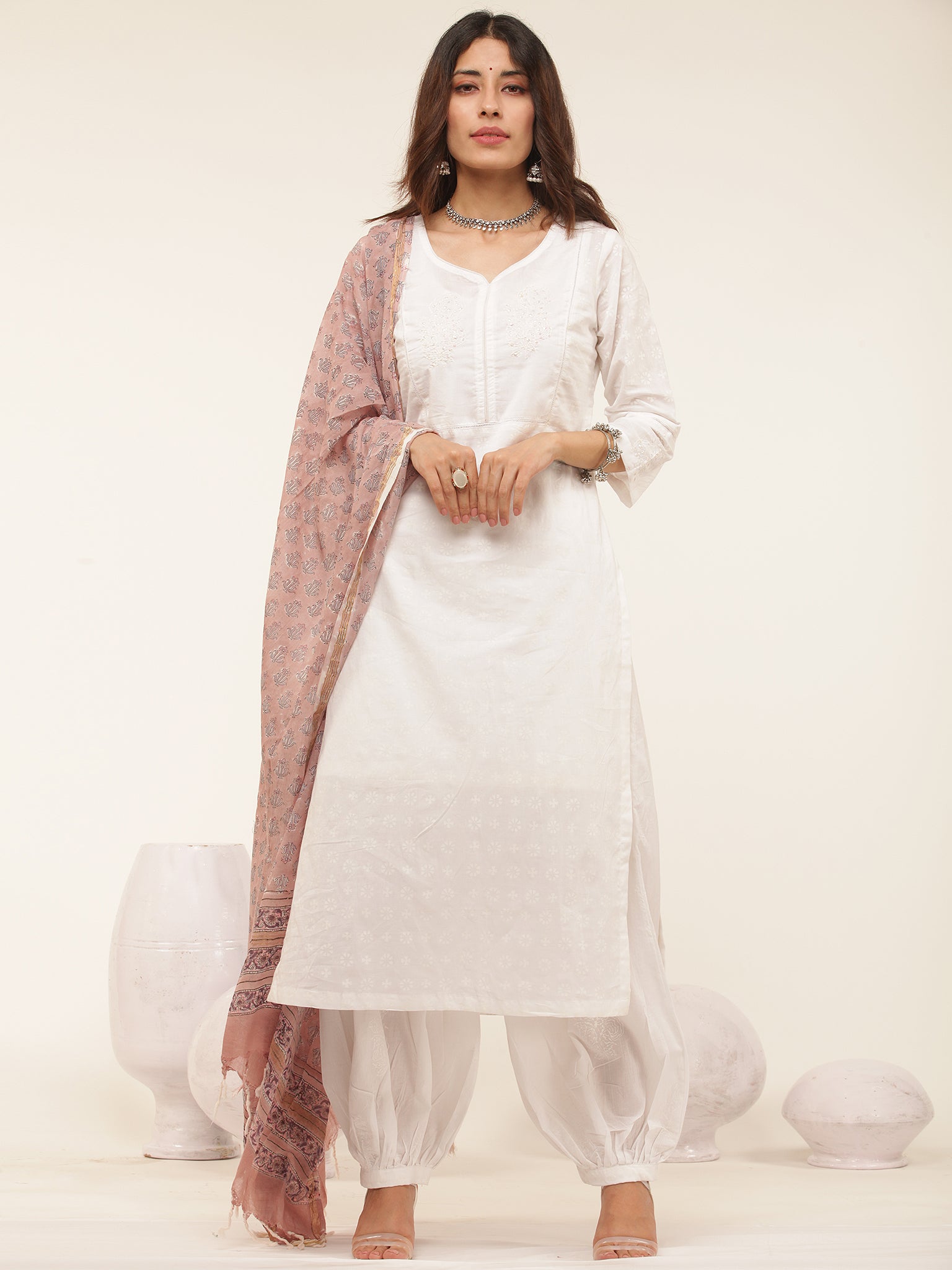 Product: This set contains Handcrafted Sanganeri Premium Cotton White Kurta, 100% Cotton Salwar Pants and Cotton Dupatta.
