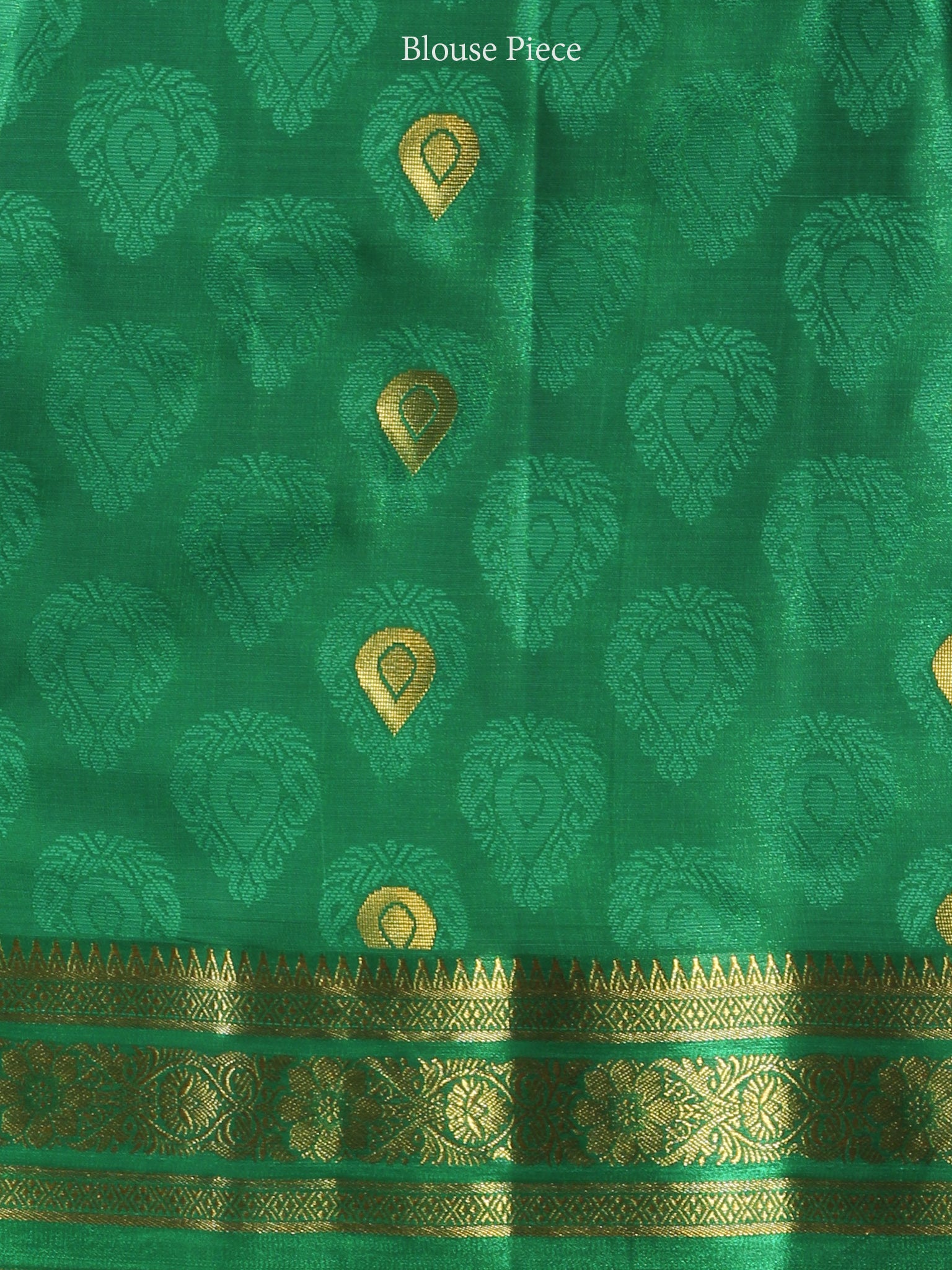 The model is wearing a blouse from our in-house wardrobe. For blouse piece with this Saree, check the last image.