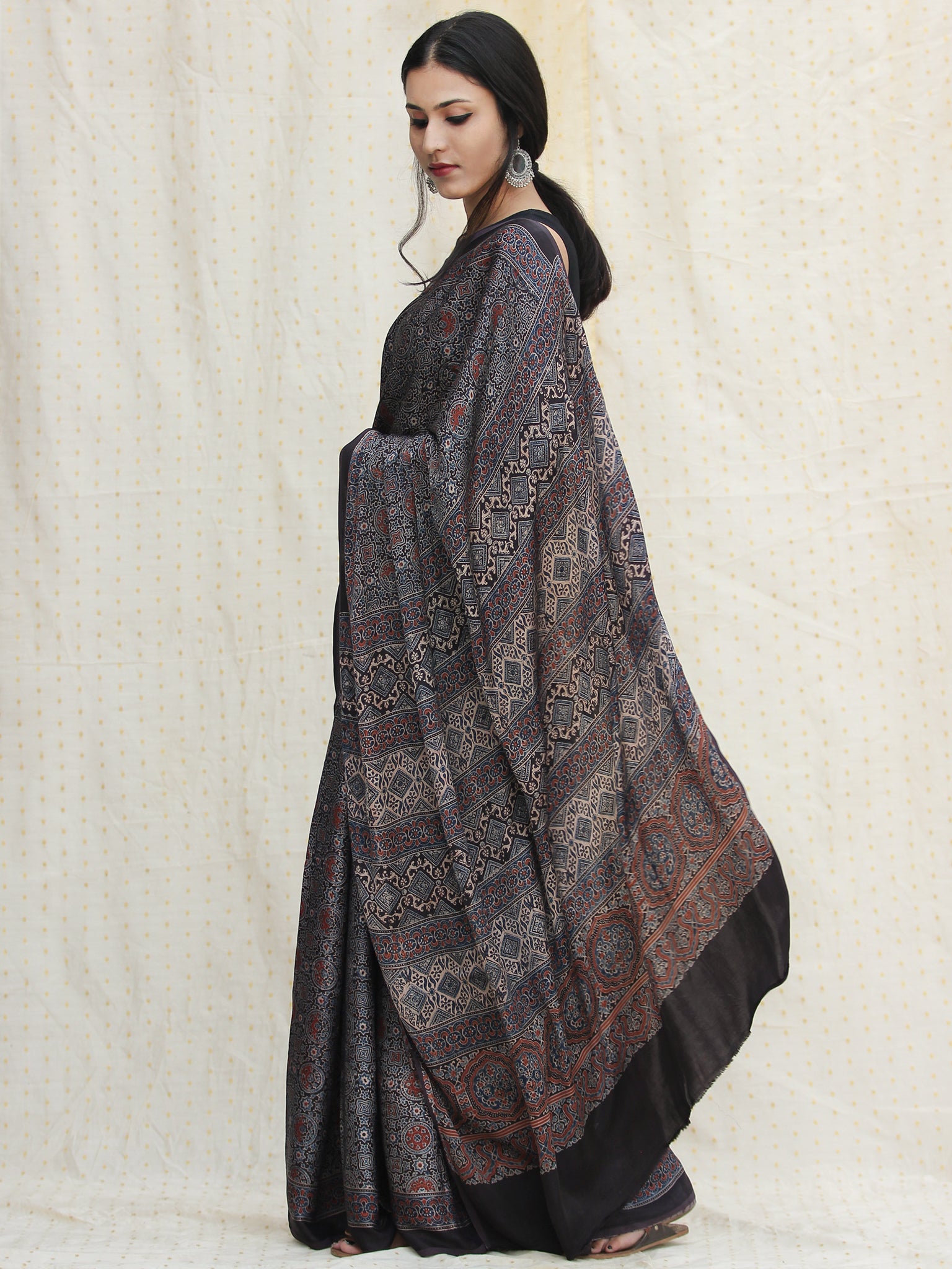 Indigo Charcoal Black Red Ajrakh Hand Block Printed Modal Silk Saree - S031704122