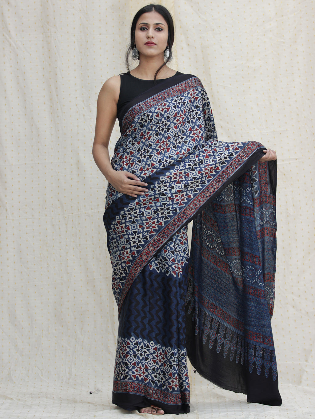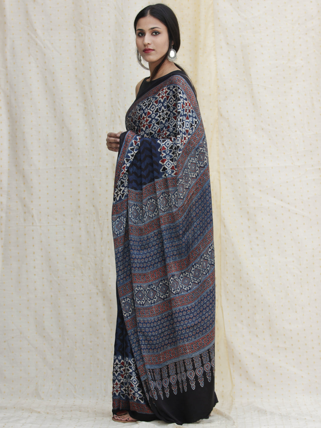 Indigo Ivory Black Red Ajrakh Hand Block Printed Modal Silk Saree - S031704125