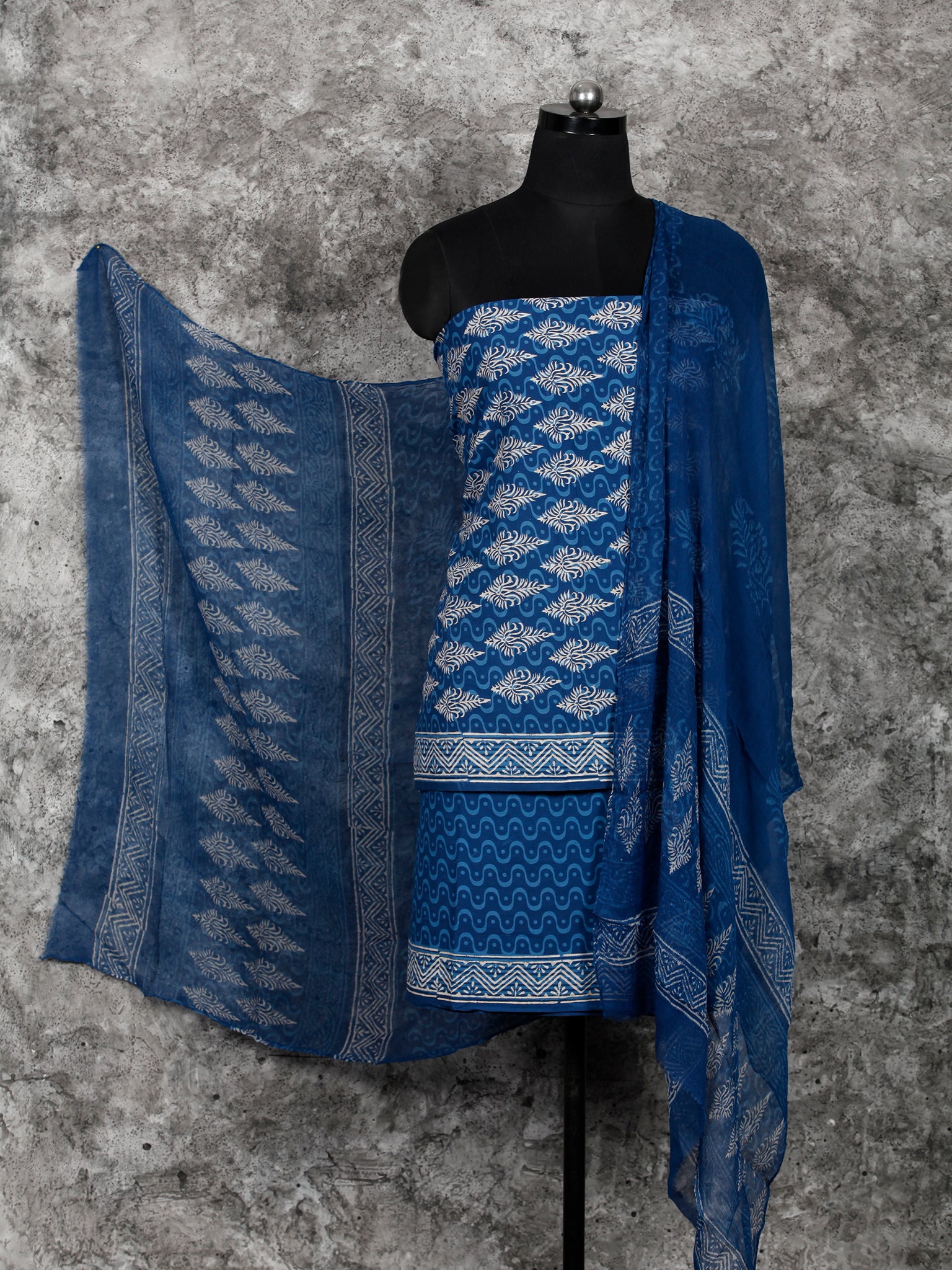 PRODUCT: Fabric is Hand Block printed & dyed in natural vegetable colors by Artisans in Bagru, Rajasthan. Set of three. Cotton Suit/Kurta & Salwar & Chiffon Dupatta