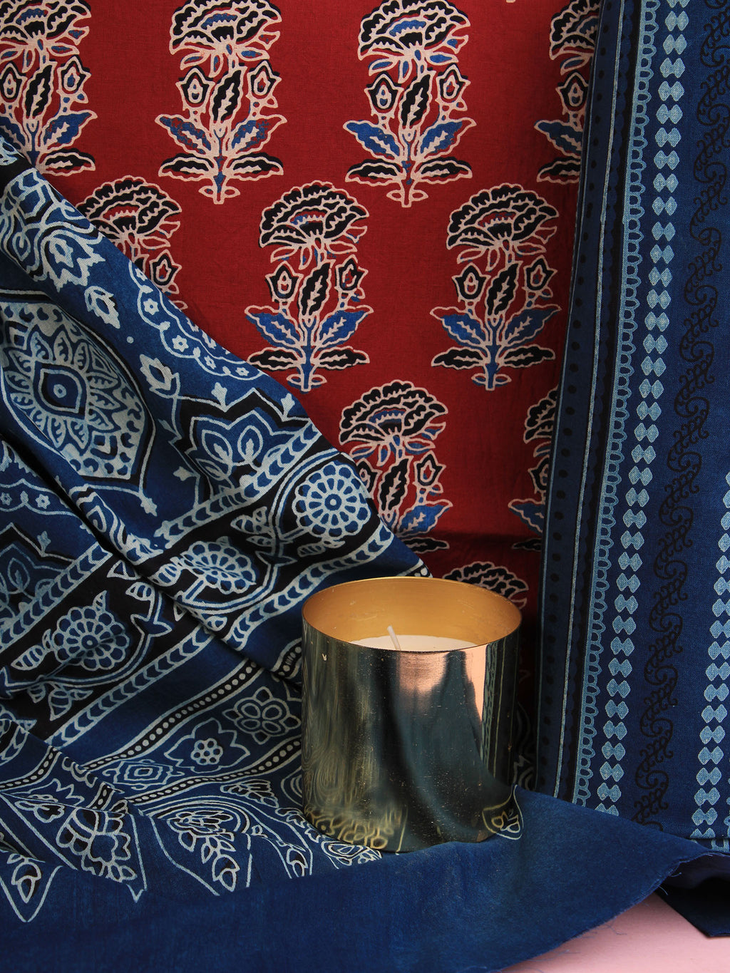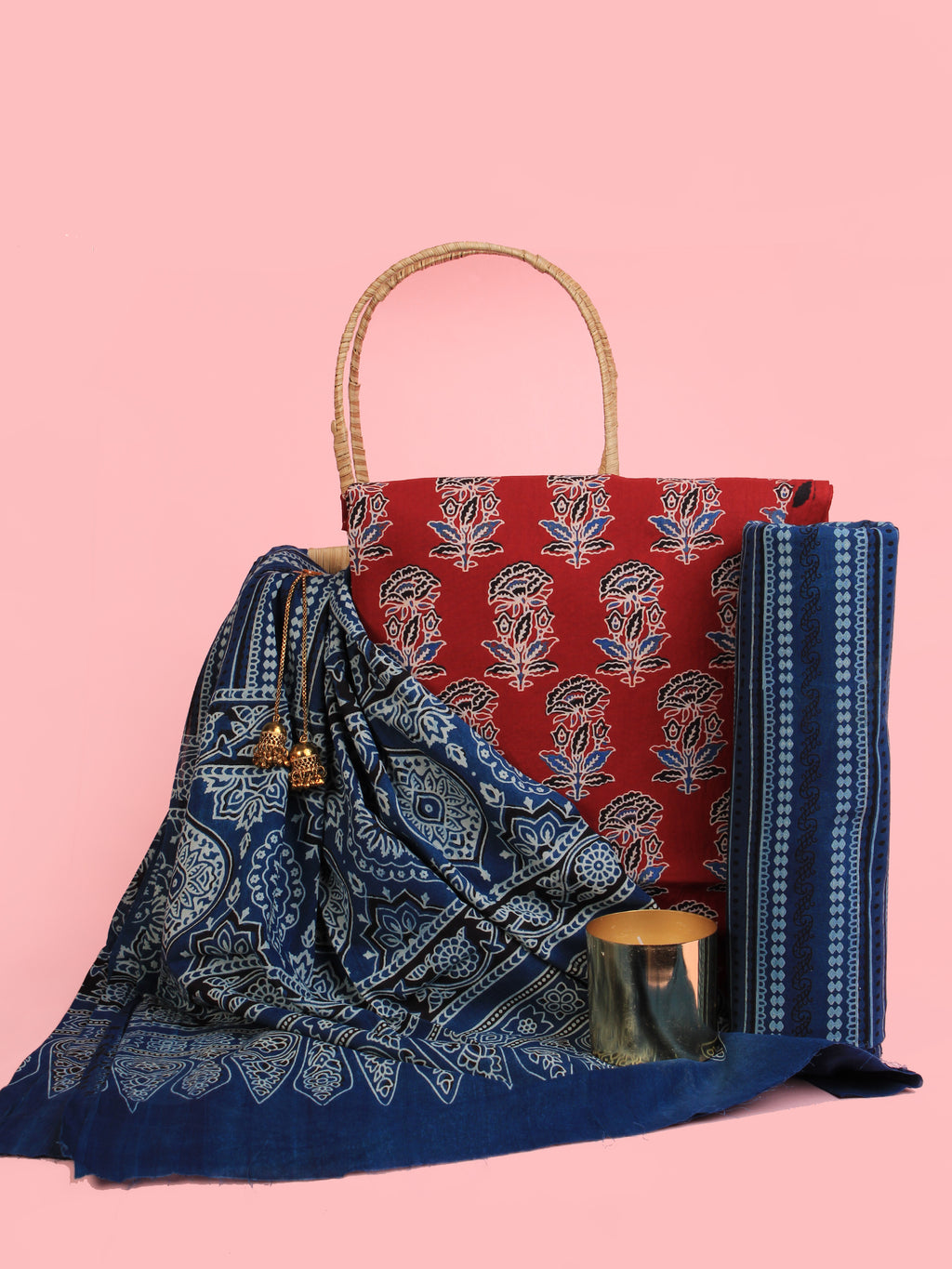 PRODUCT: Fabric is Hand Block printed by Artisans in Bagru, Rajasthan. Set of three. Cotton Suit/Kurta & Salwar & Dupatta