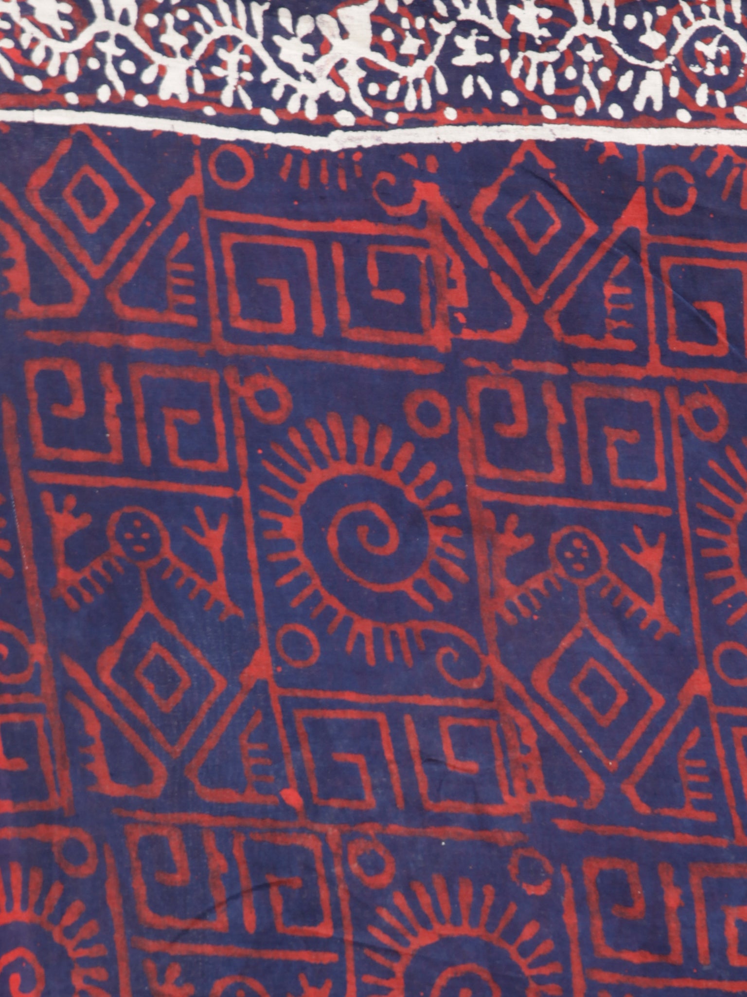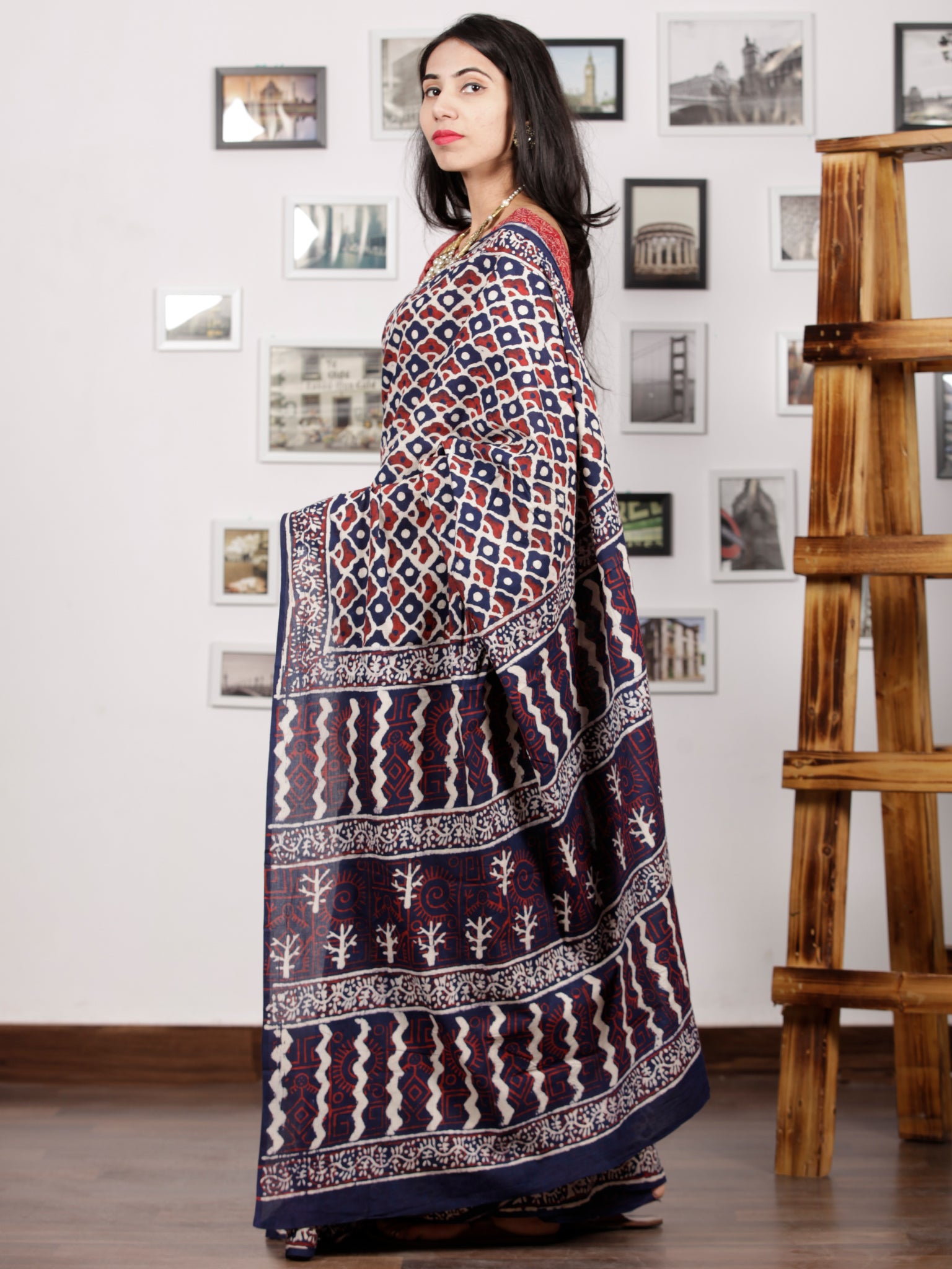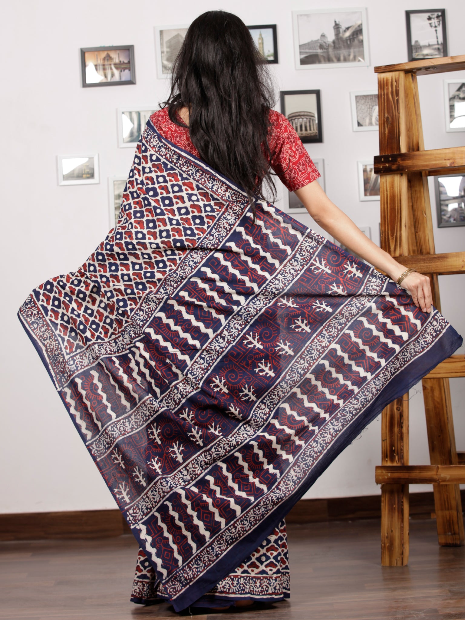 Indigo Red White Hand Block Printed Cotton Mul Saree - S031703002