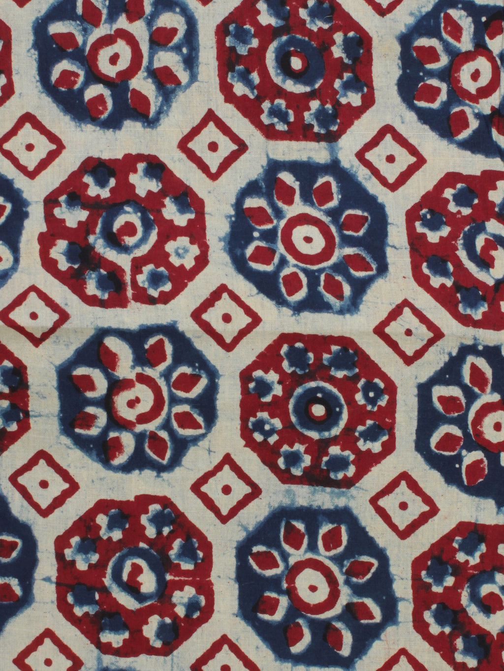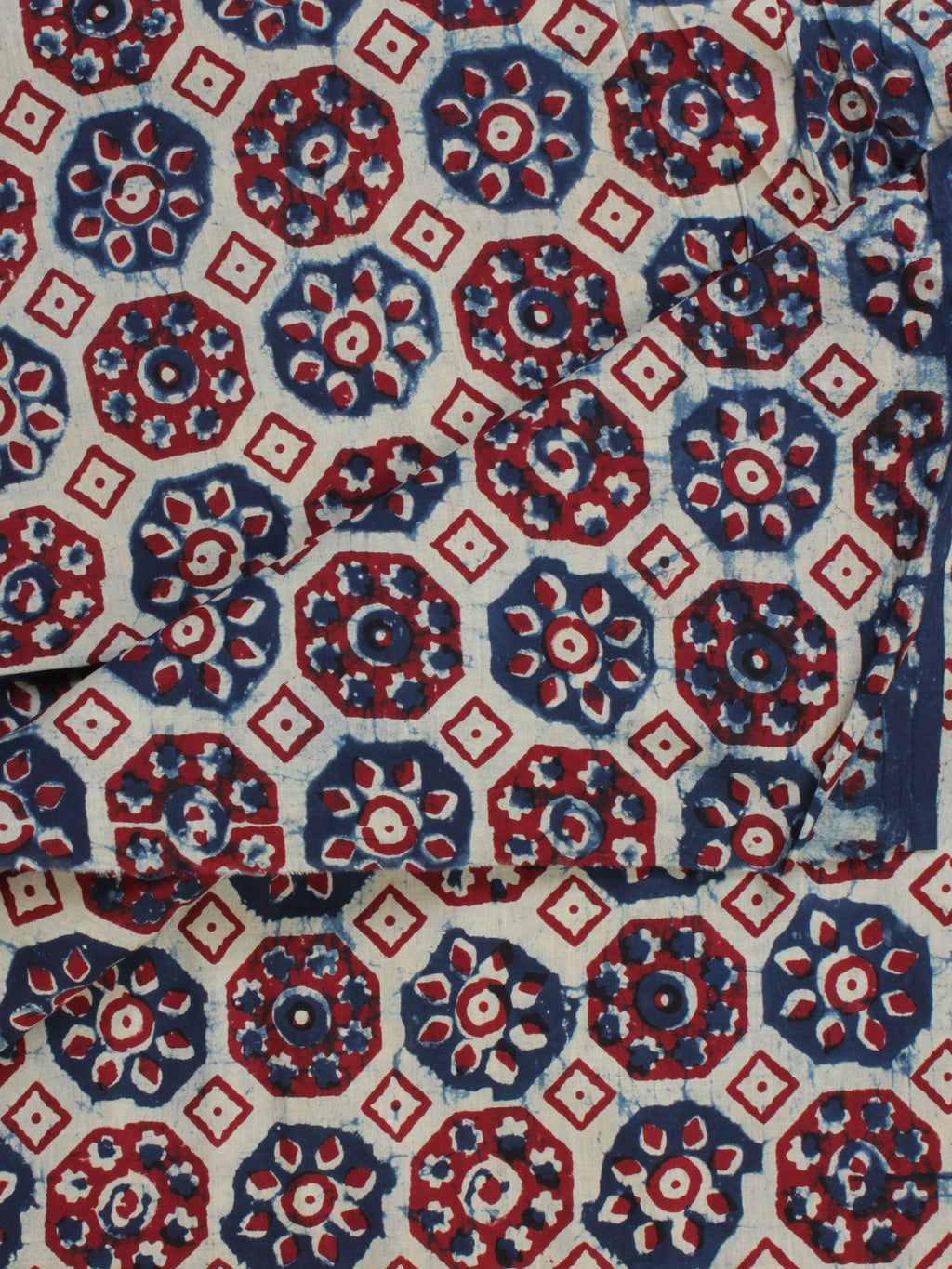 Ivory Indigo Red Ajrakh Hand Block Printed Cotton Fabric Per Meter - F003F2125