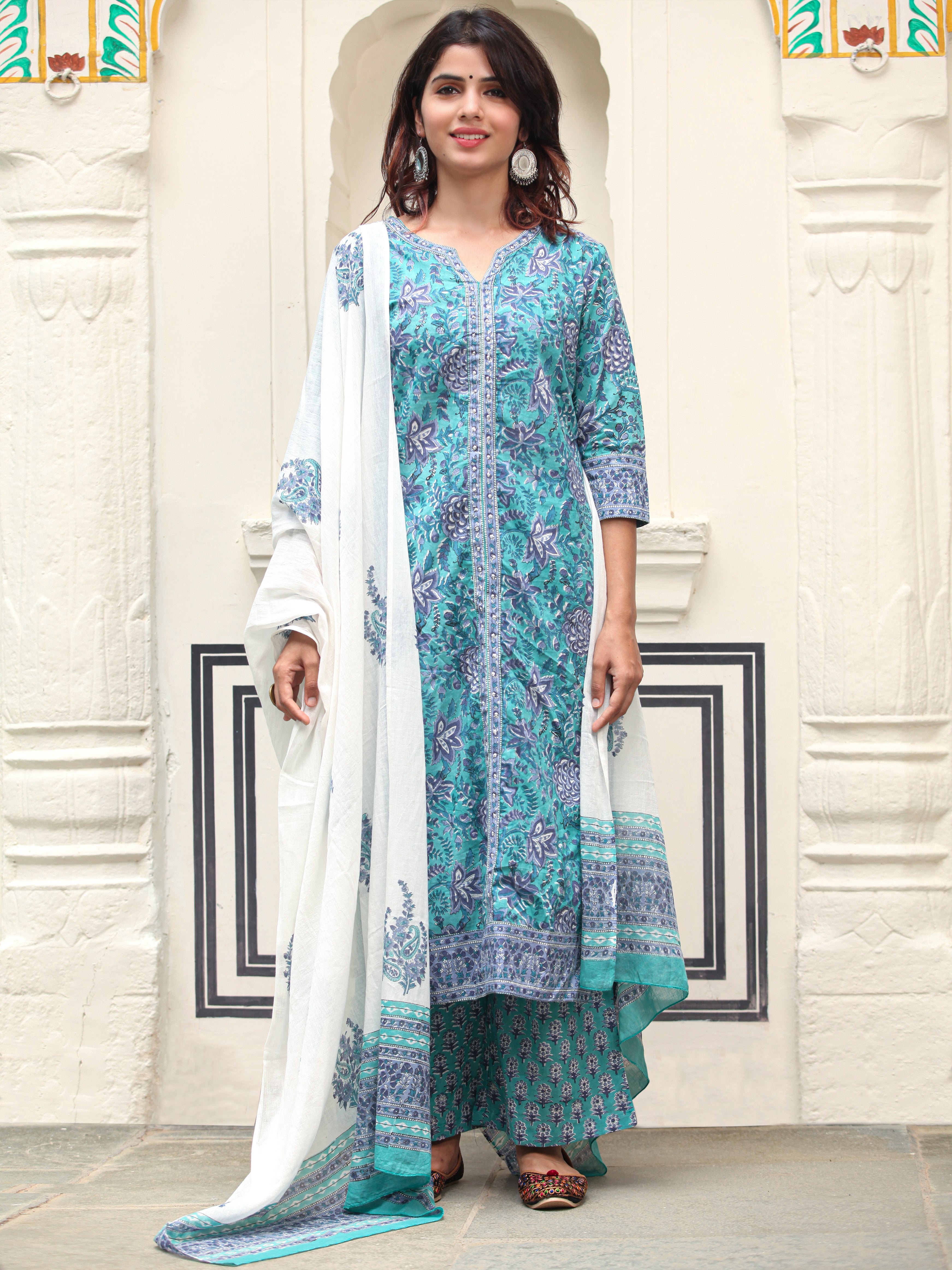 Product: This set contains Handcrafted Sanganeri Premium Cotton Kurta, 100% Cotton Pants and Cotton Dupatta.