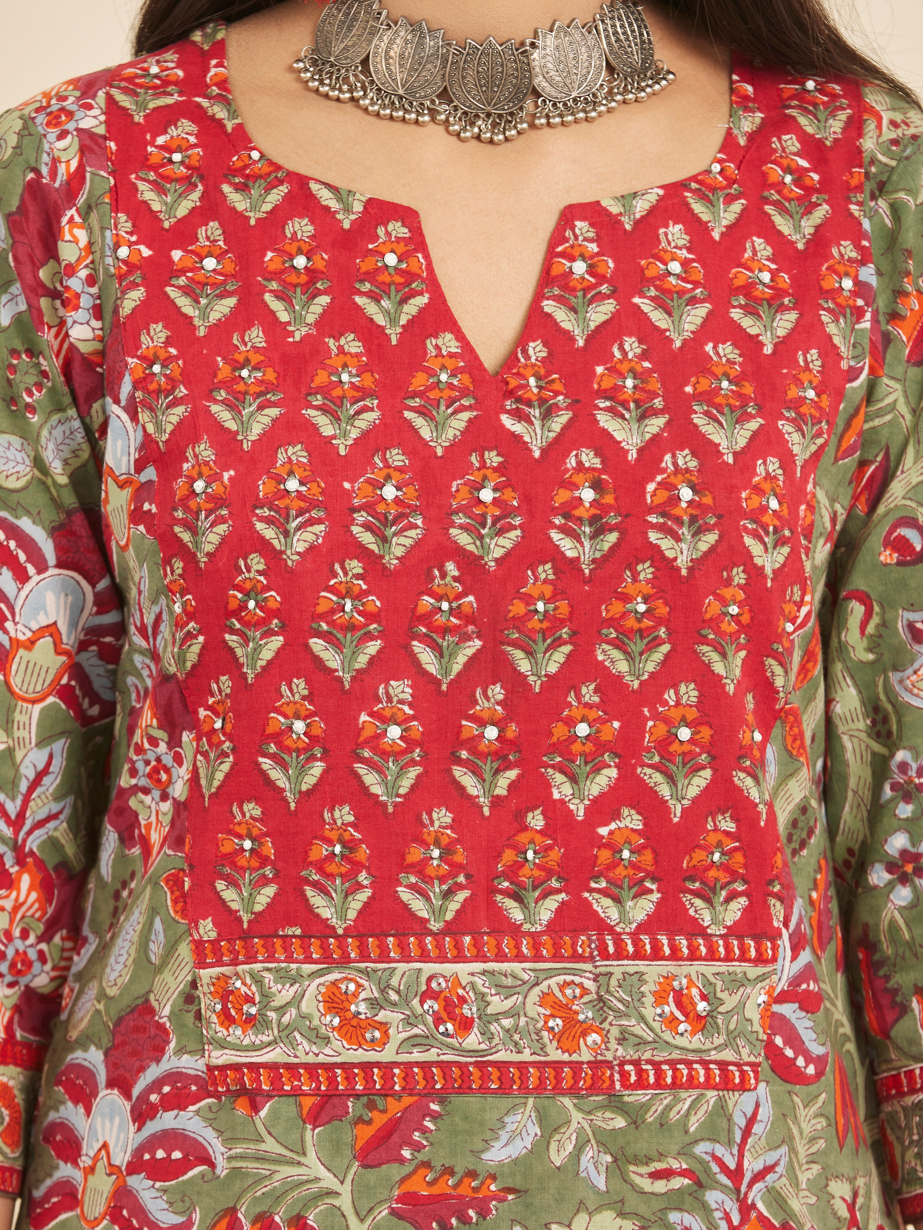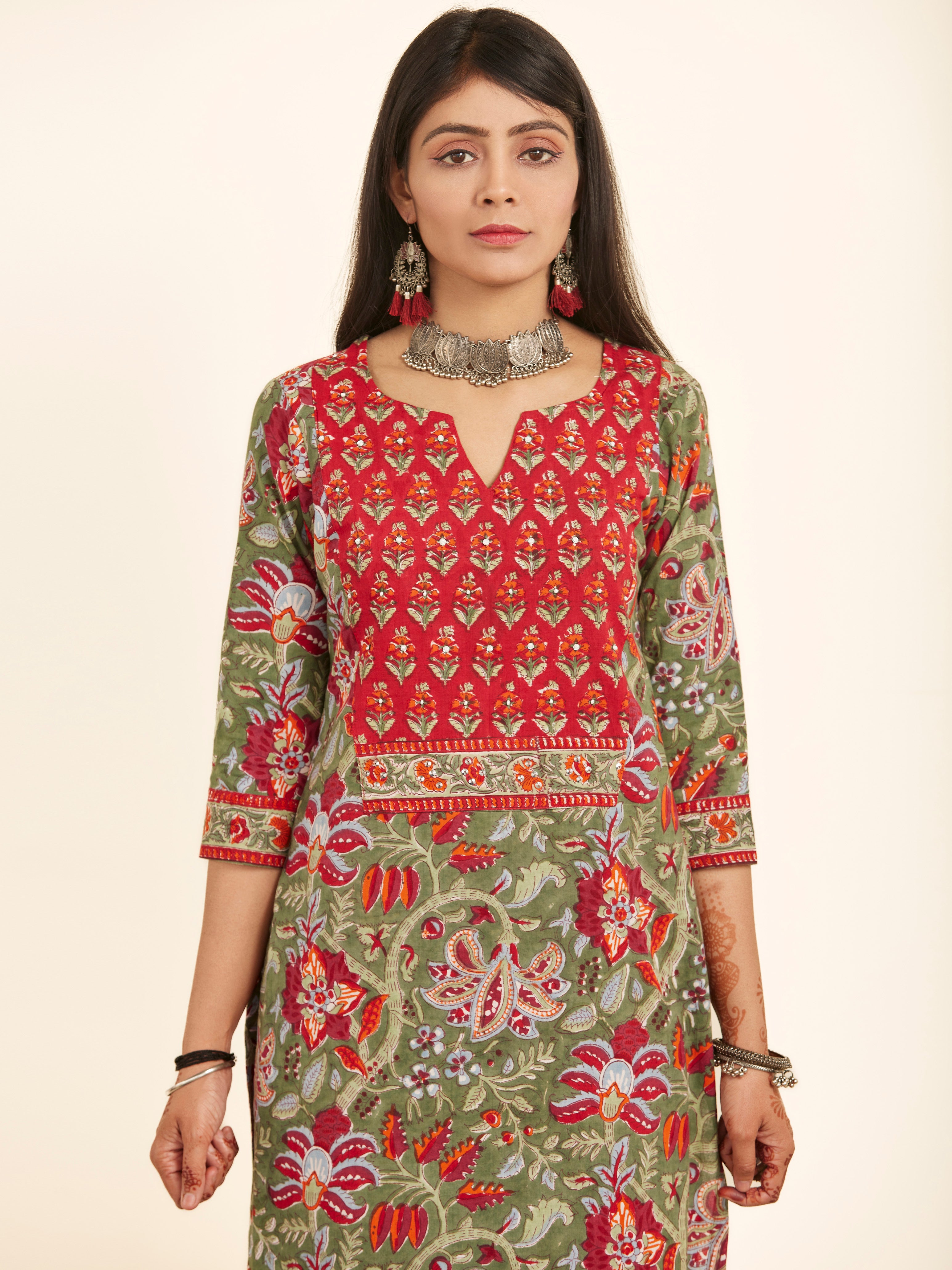 Product: Contains Hand Block Printed Cotton Kurta. Matching Pants/Bottoms and Dupatta are also available separately under BUY THE LOOK section.