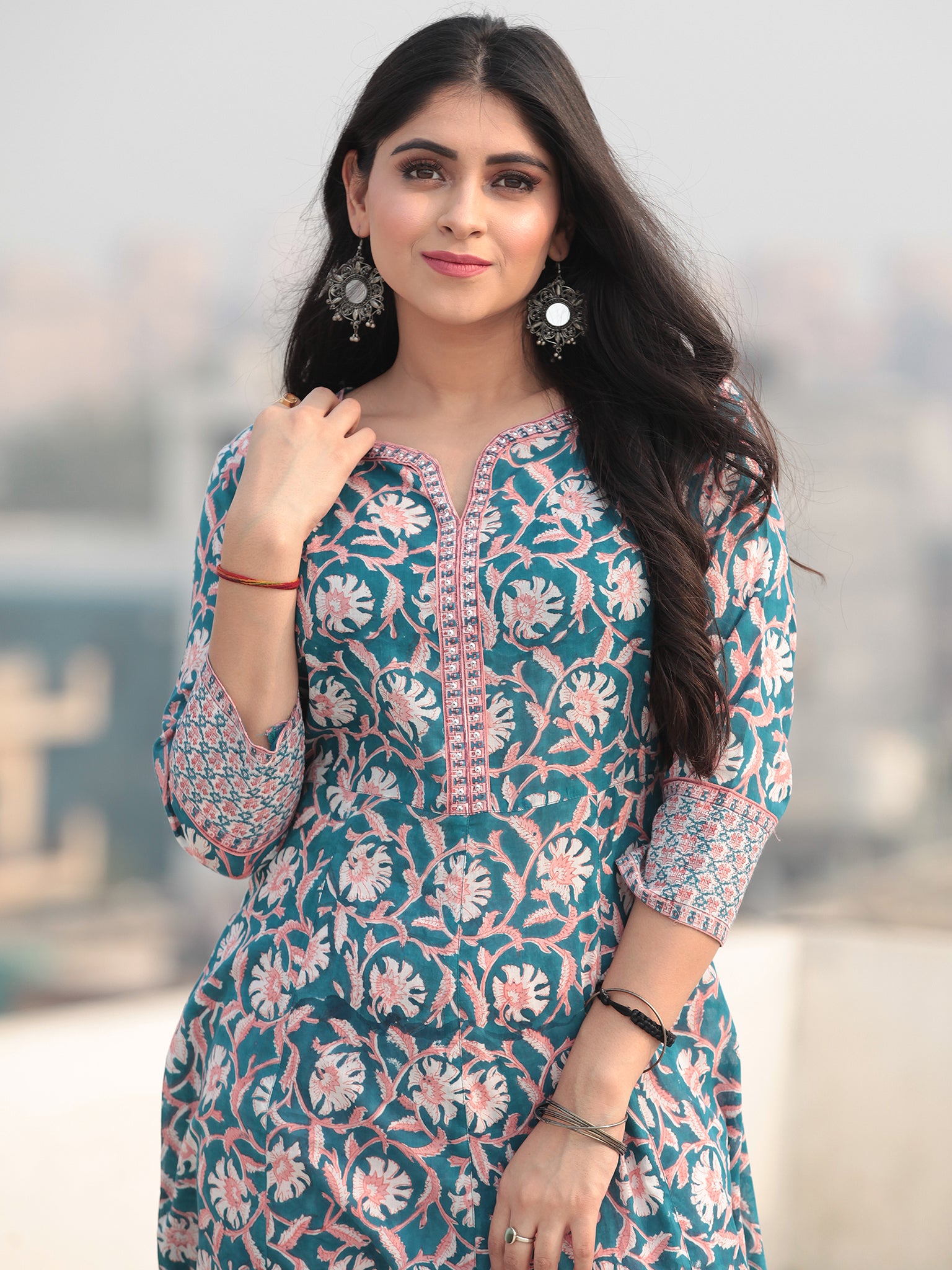 Product: Contains Hand Block Printed Cotton Kurta. Matching Pants/Bottoms and Dupatta are also available separately under BUY THE LOOK section.