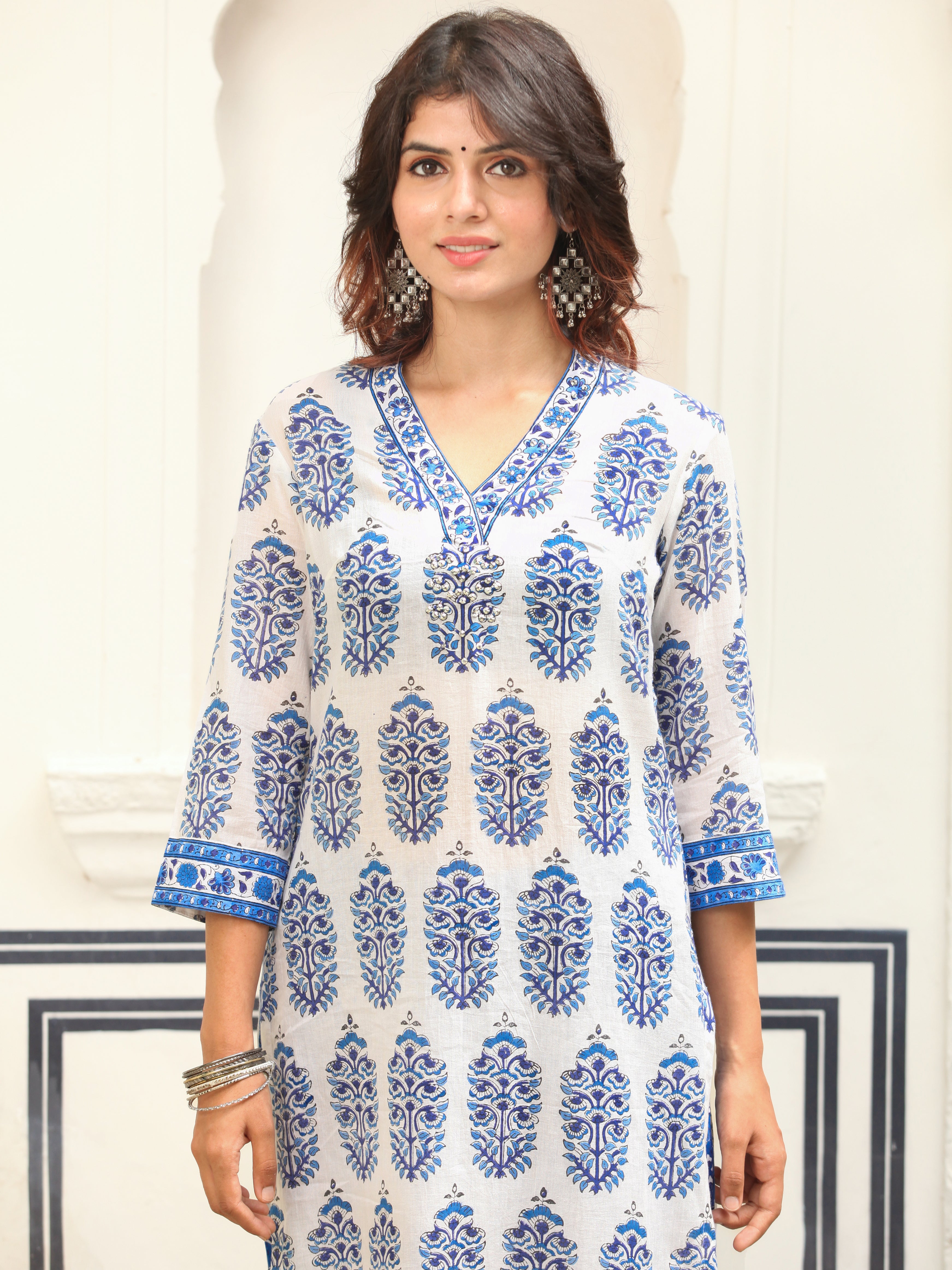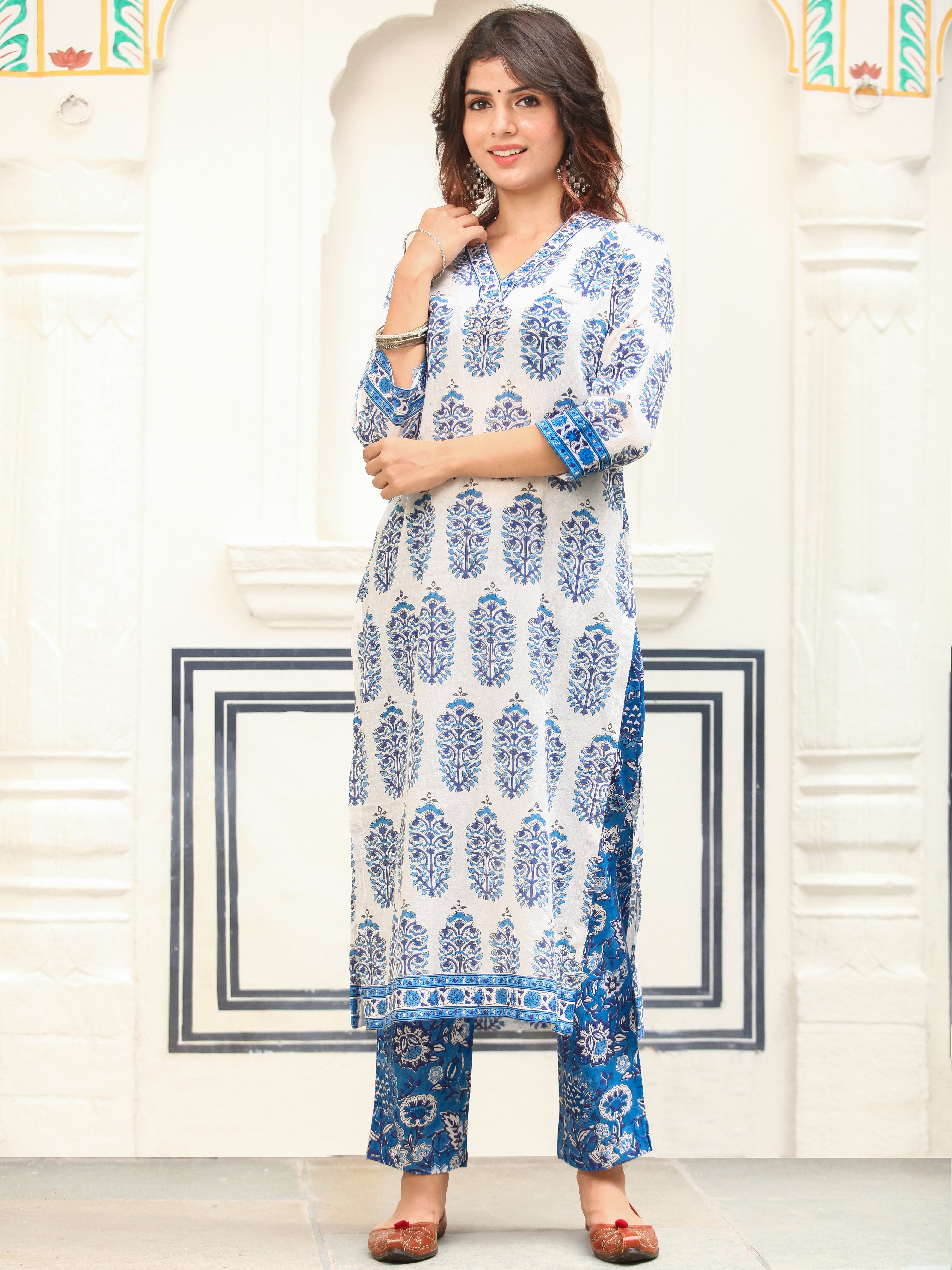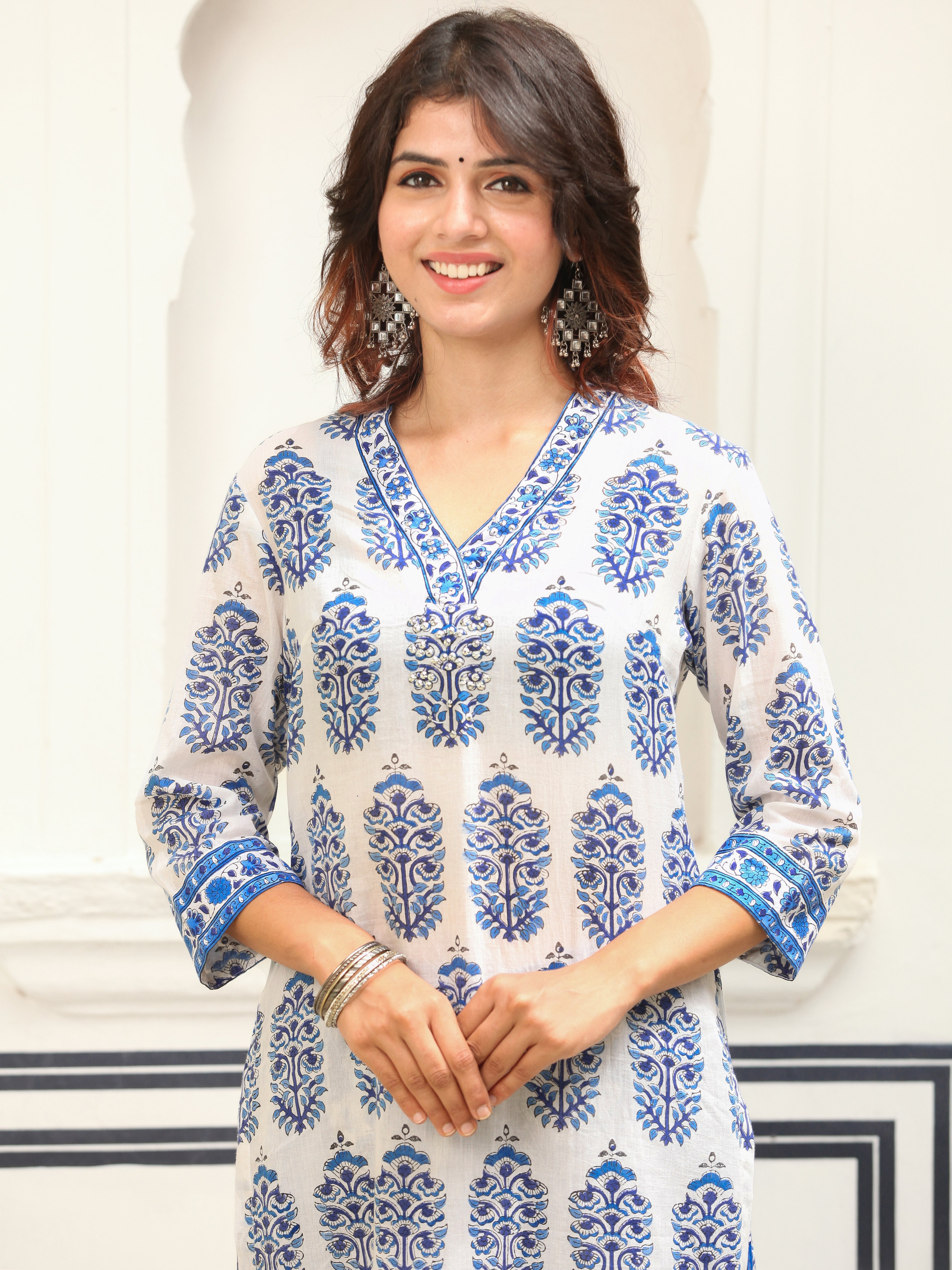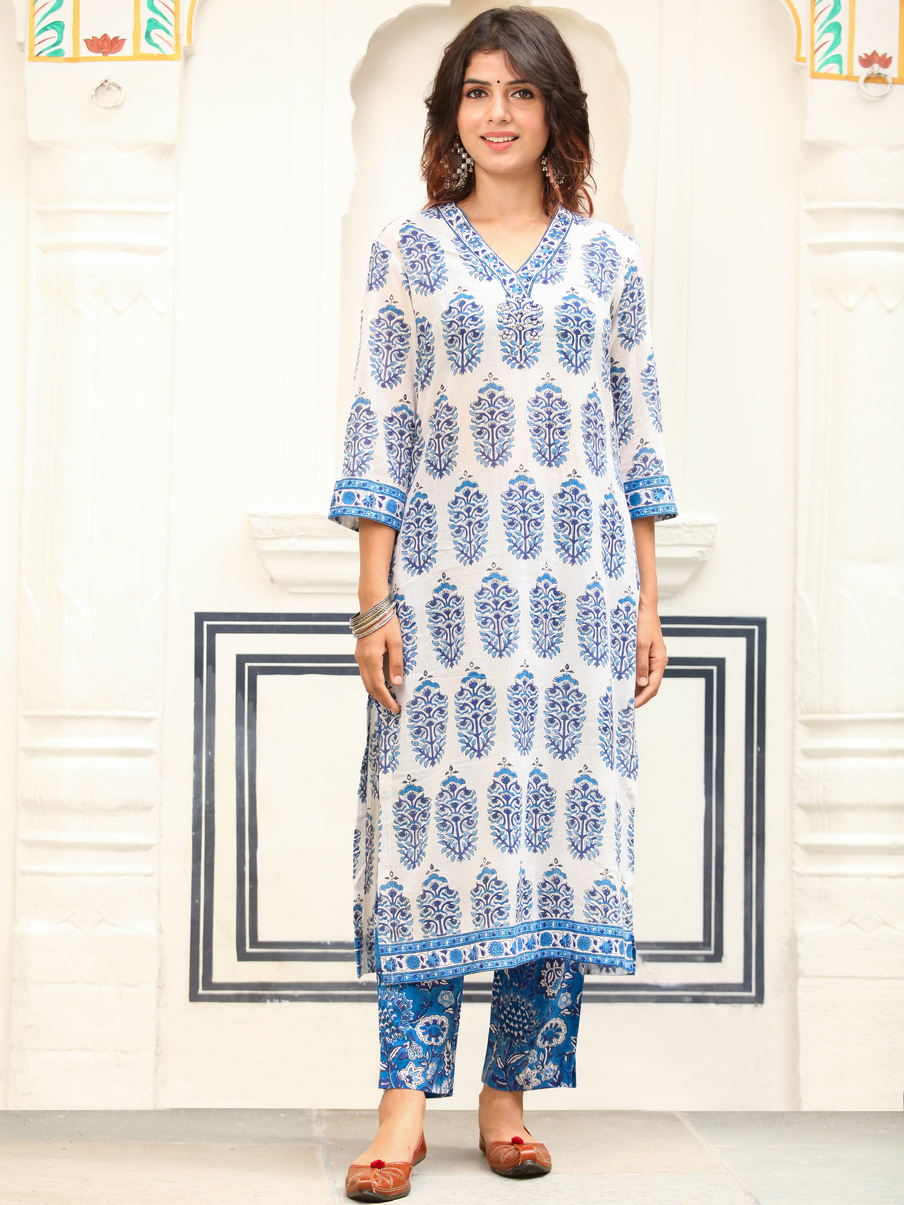 Product: Contains Hand Block Printed Cotton Kurta. Matching Pants/Bottoms and Dupatta are also available separately under BUY THE LOOK section.