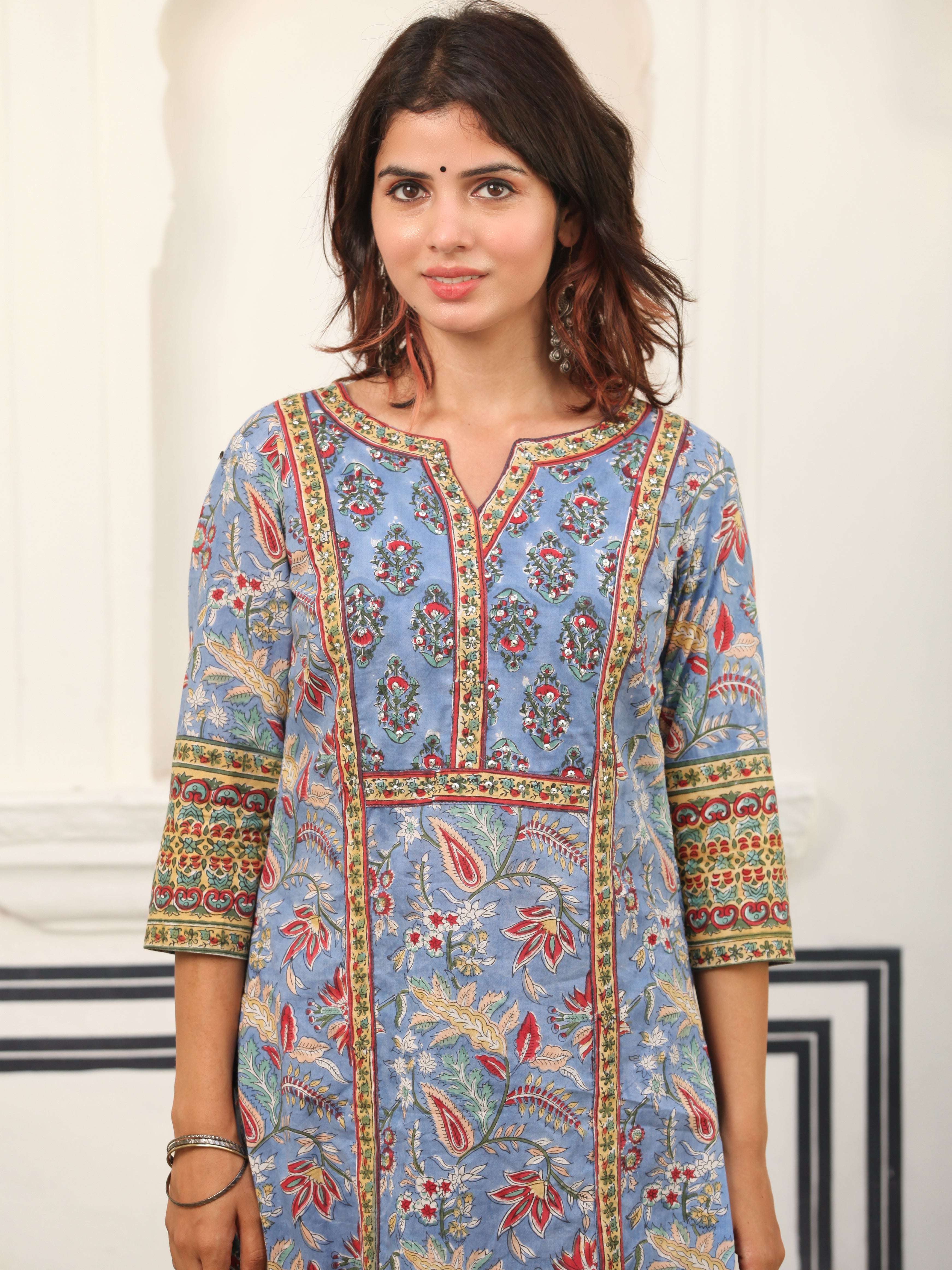 Product: This set contains Handcrafted Sanganeri Premium Cotton Kurta, 100% Cotton Pants and Cotton Dupatta.