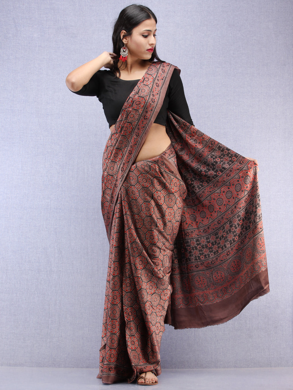 Kashish Beige Black Ajrakh Hand Block Printed Modal Silk Saree - S031704448