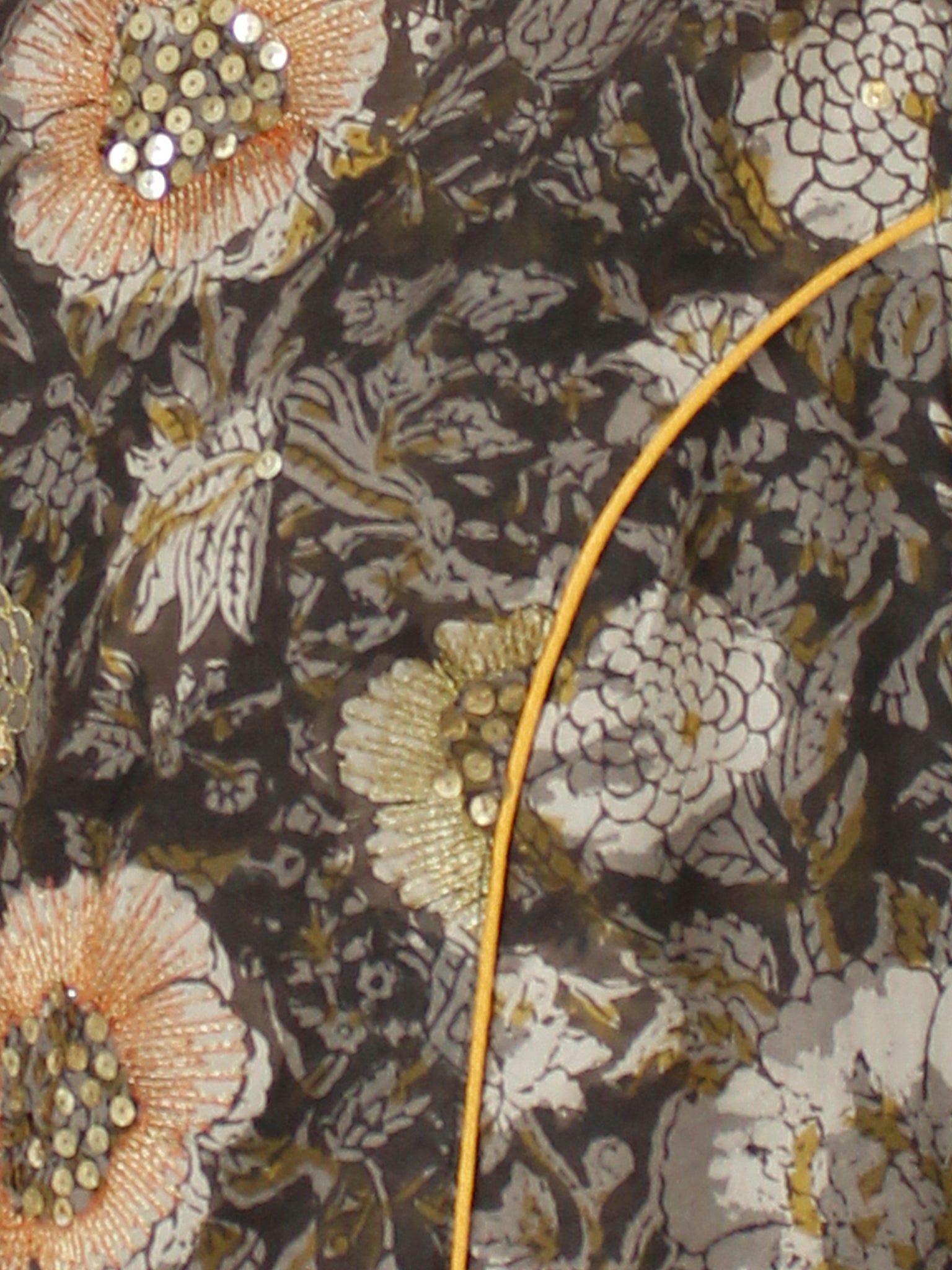 PRODUCT: This Dress has sequence and golden zari embroidery on york and Sleeves . Fabric is 100% pure cotton. Hand Block printed by Artisans in Rajasthan.