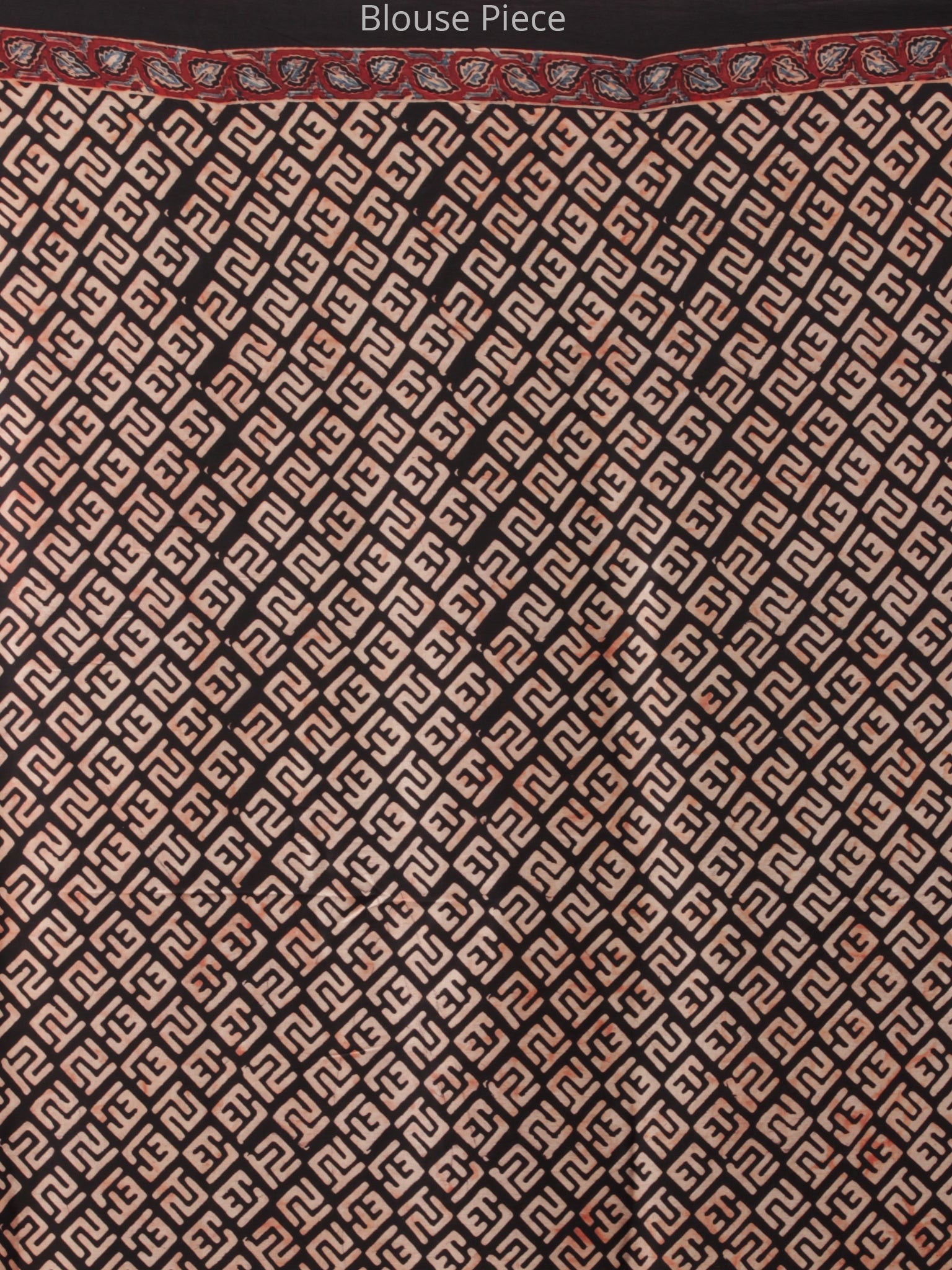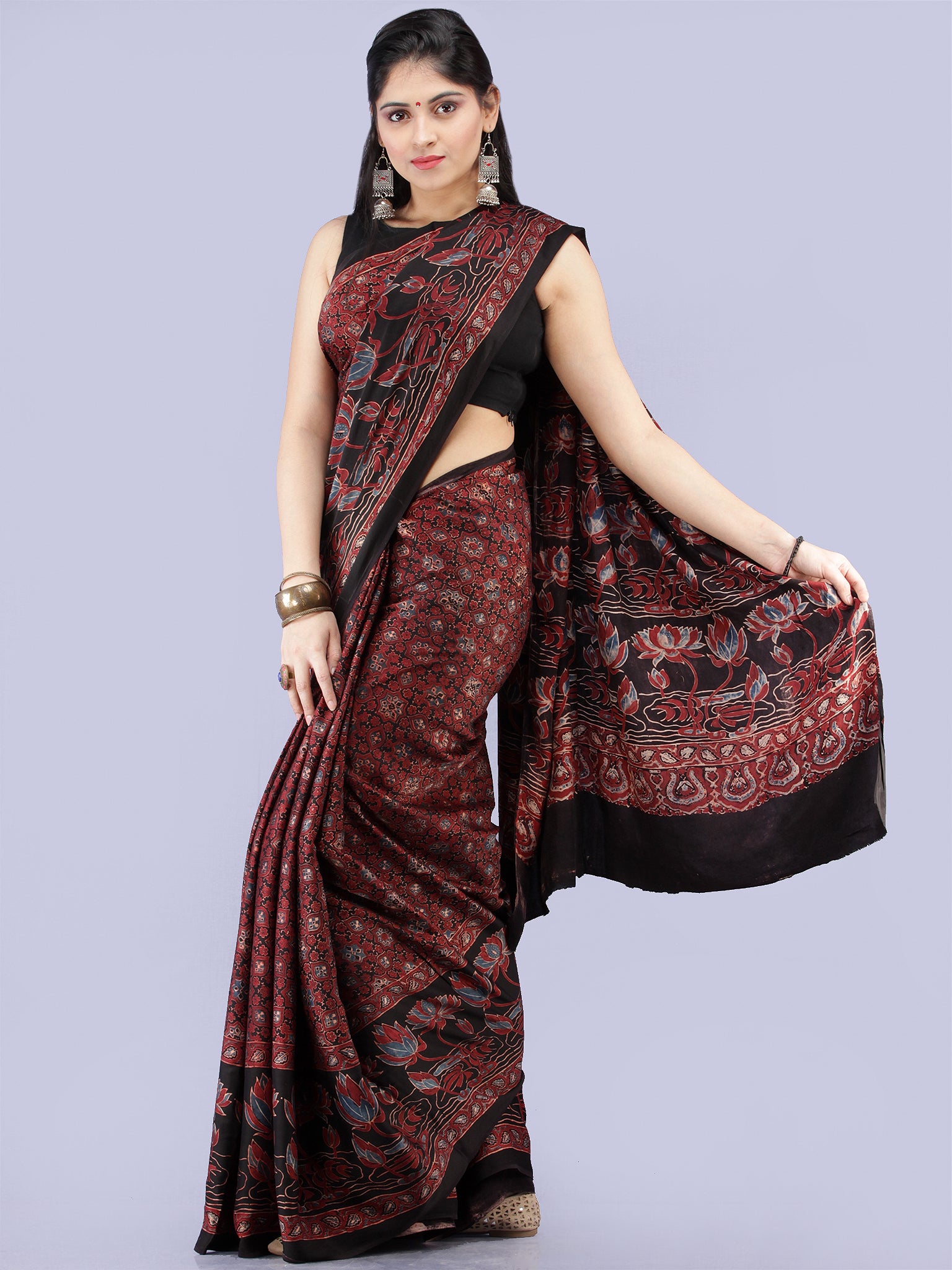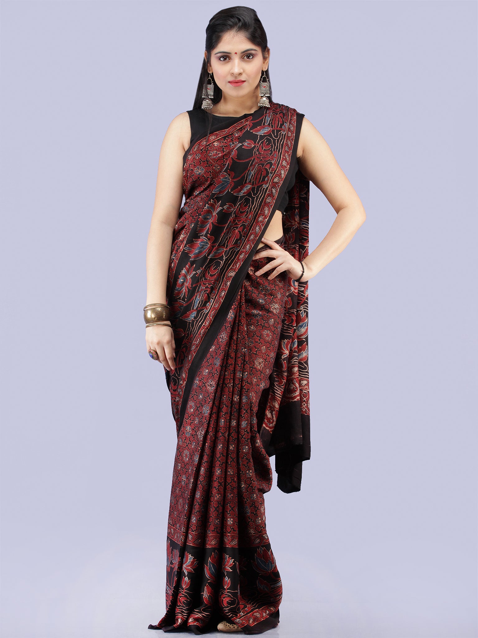 Maroon Black Blue Ajrakh Hand Block Printed Modal Silk Saree - S031704258