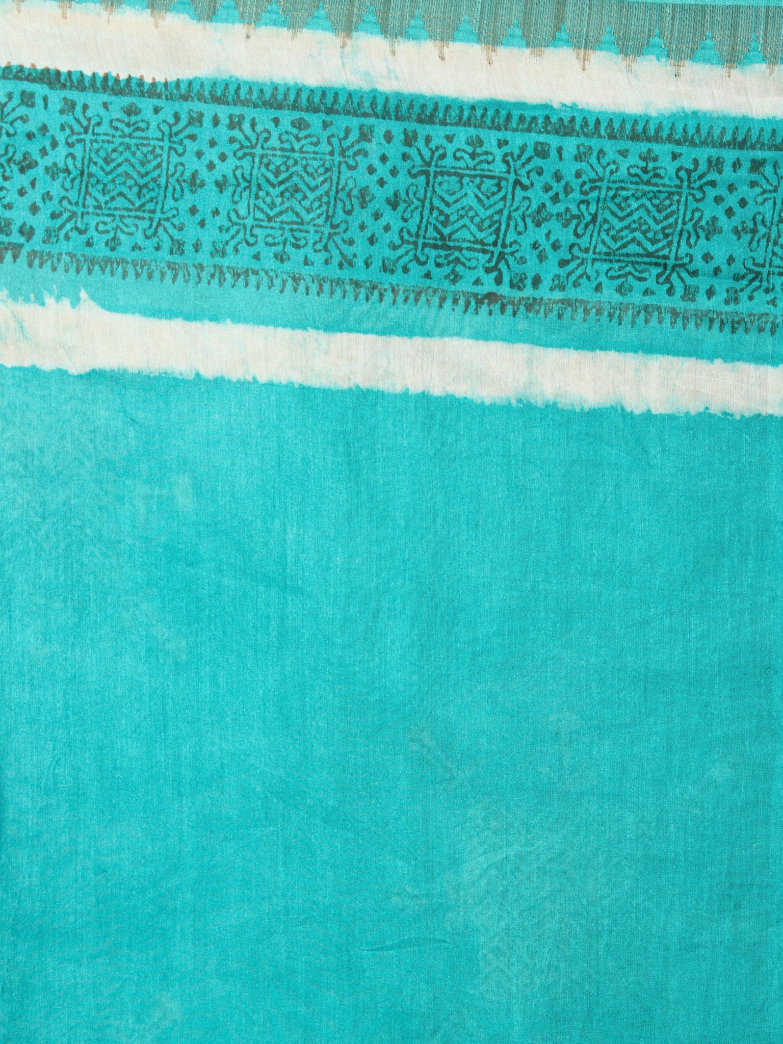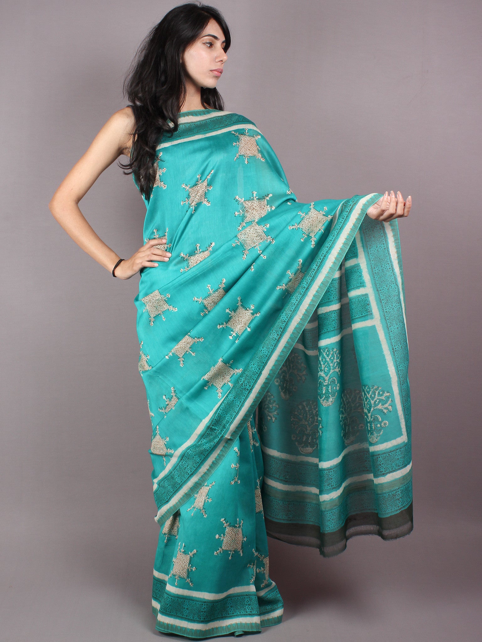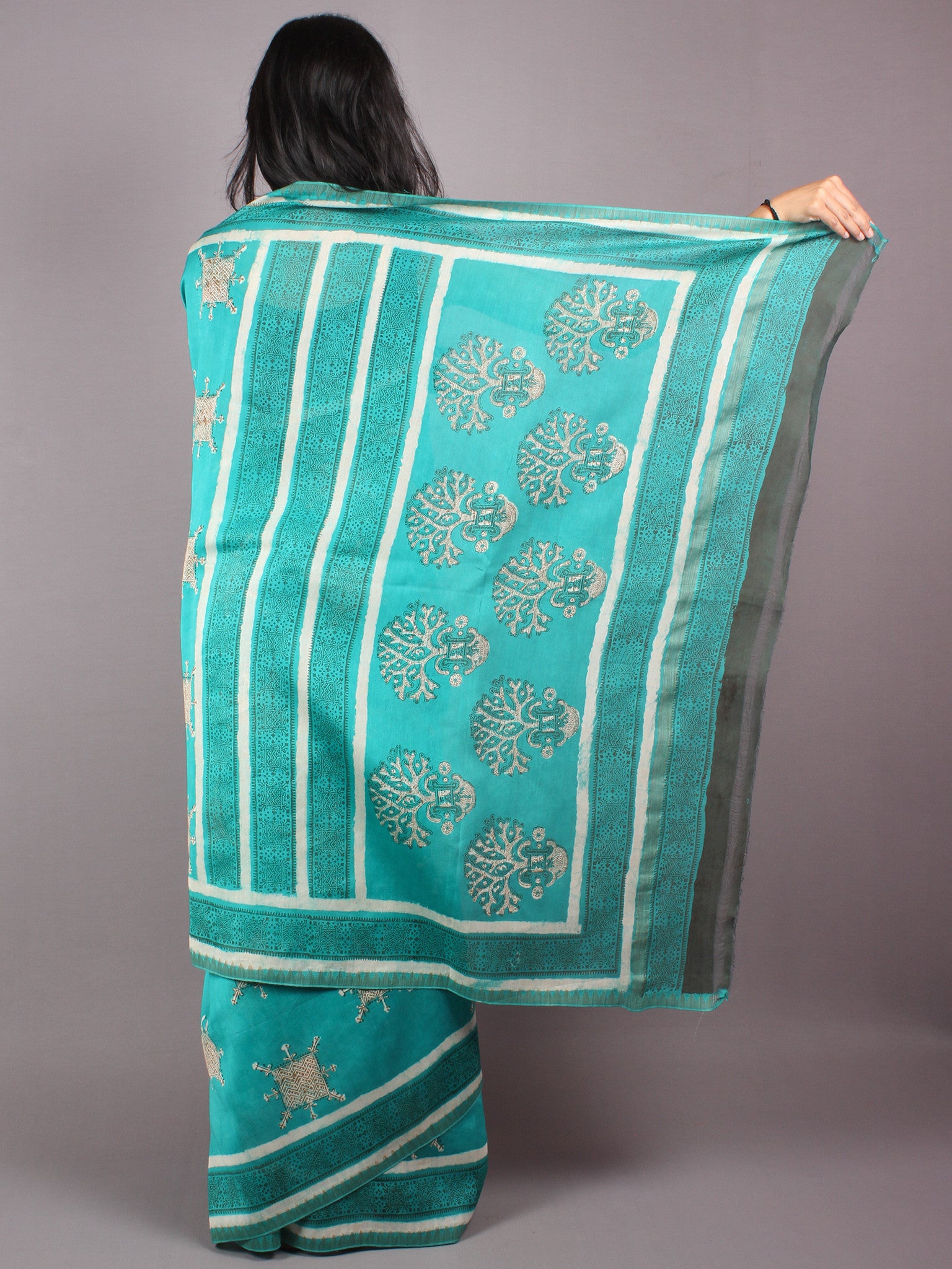 Mint Green Bagru Hand Block Printed Chanderi Saree With Geecha Border - S03170293