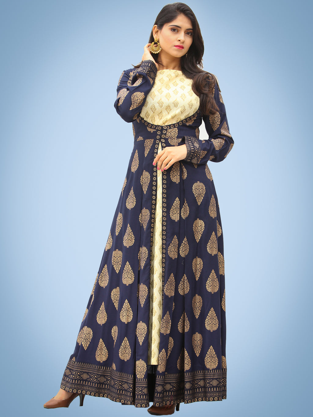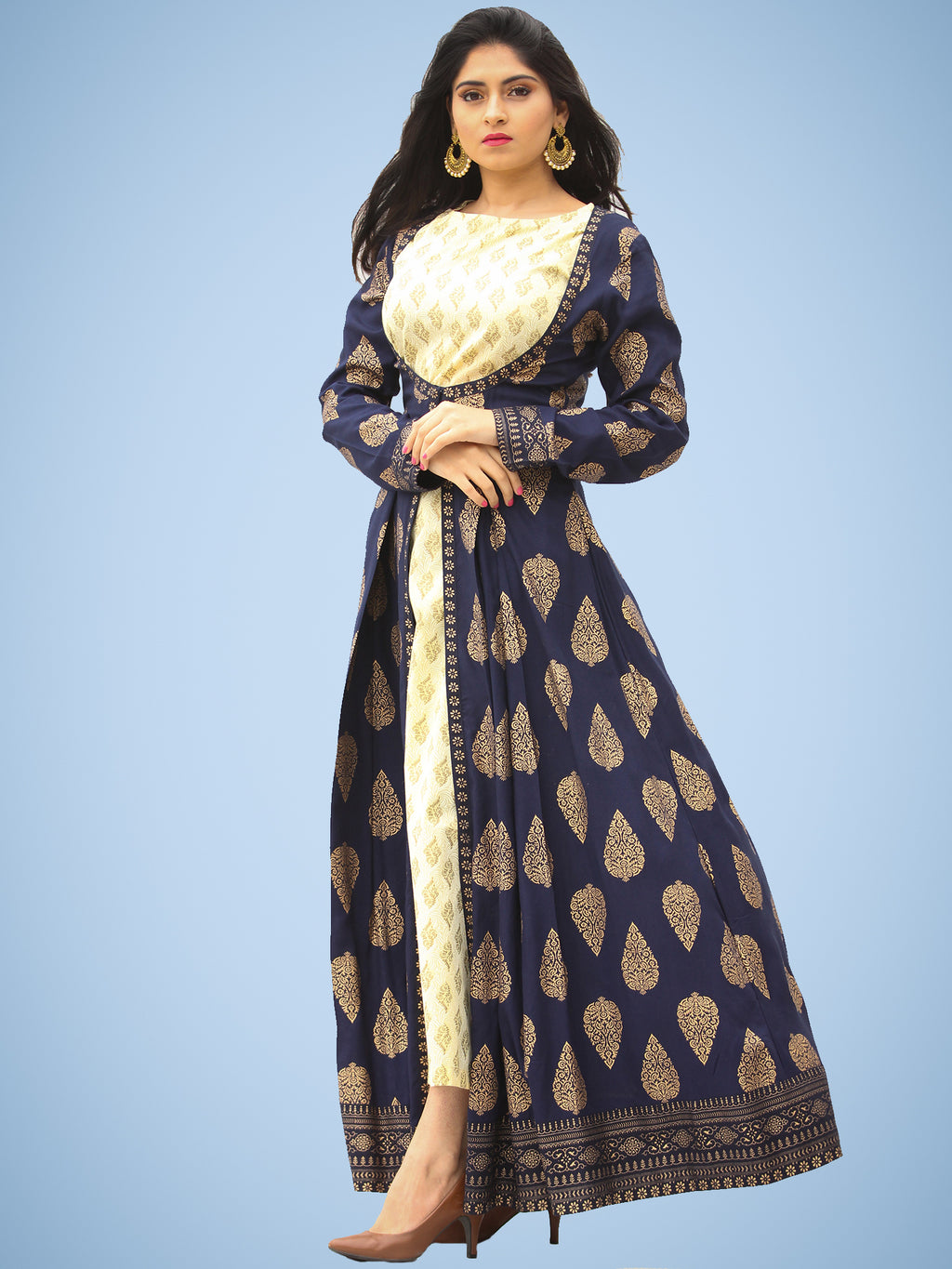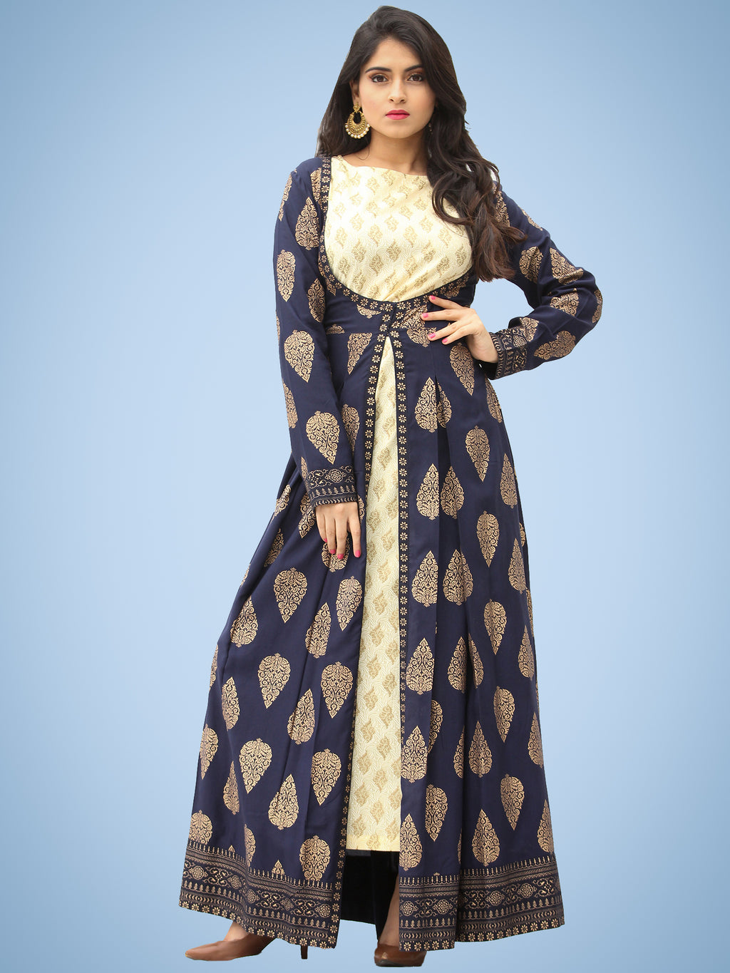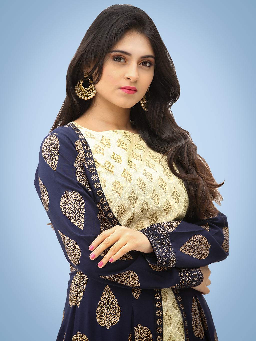 FABRIC/S: Indigo Printed - Rayon Cotton, Beige : Ivory