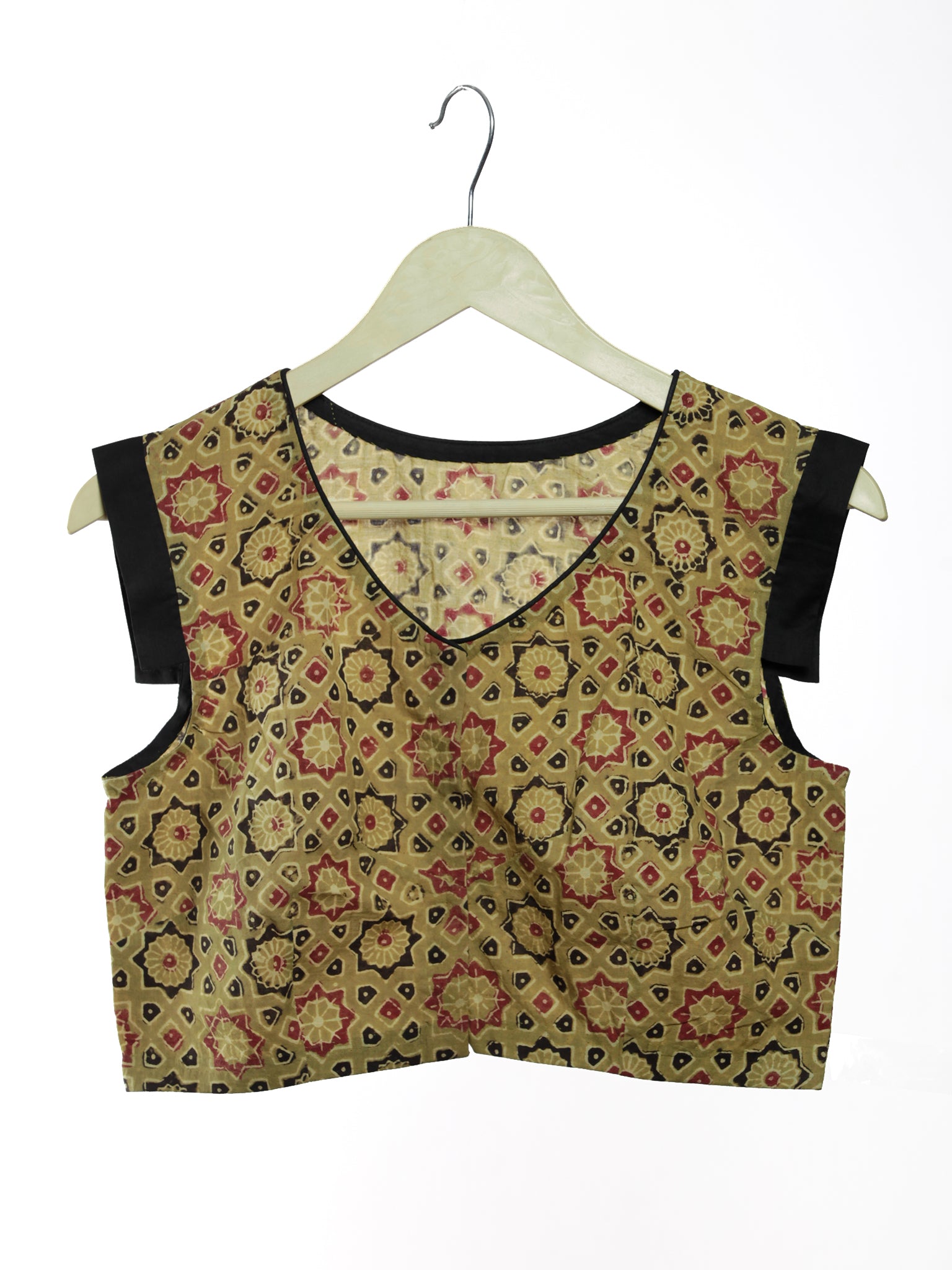 Olive Green Marron Black Ajrakh Hand Printed Cotton Blouse With Cap Sleeves - B06F1592