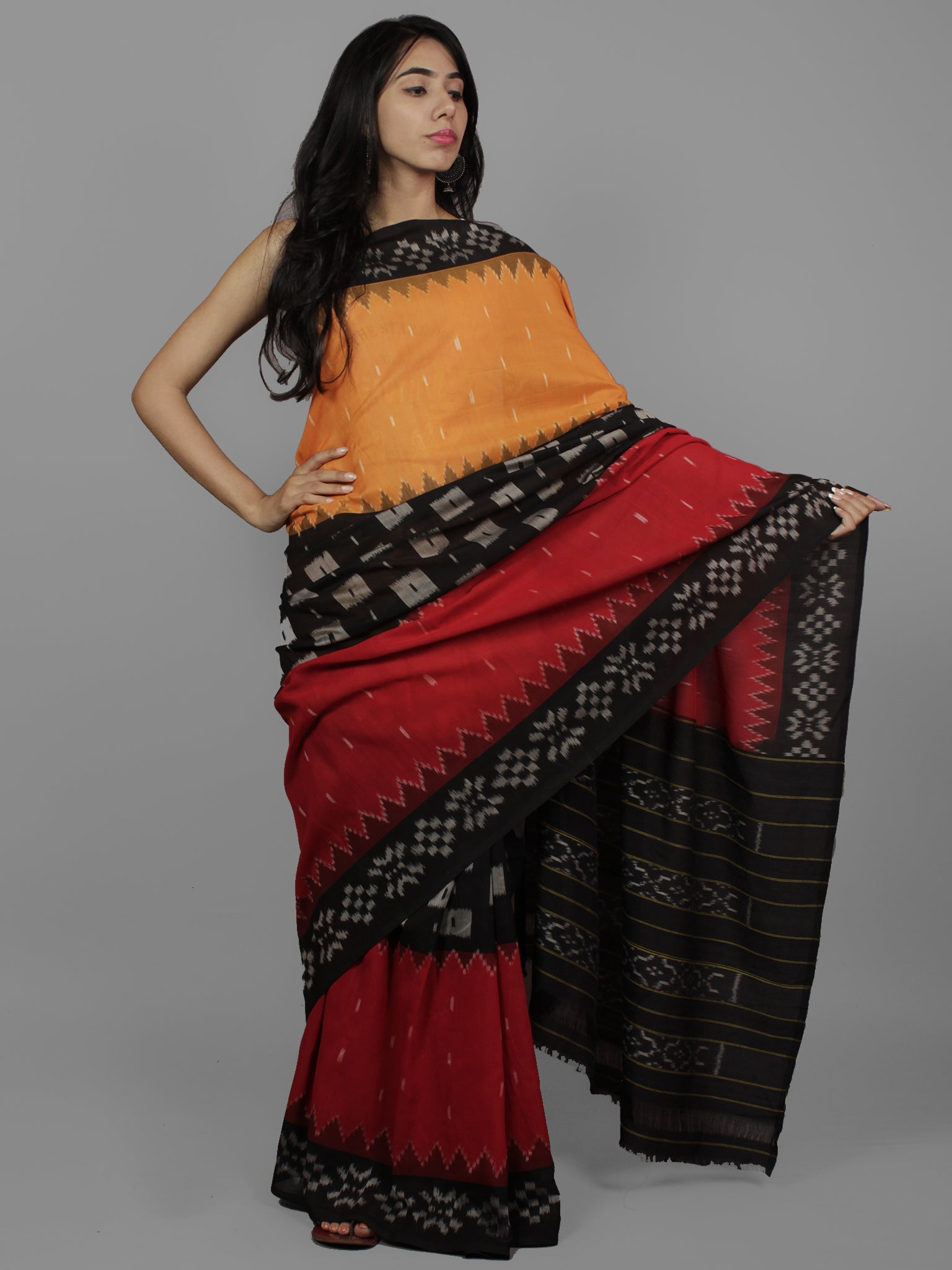 PRODUCT: The fabric of this saree is 100% pure cotton, fully hand-woven in Ikat style of dyeing.