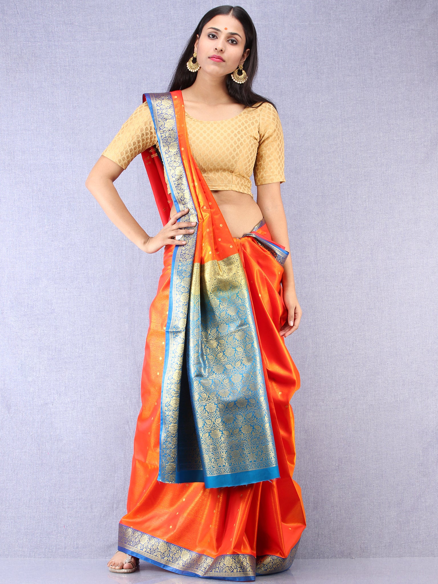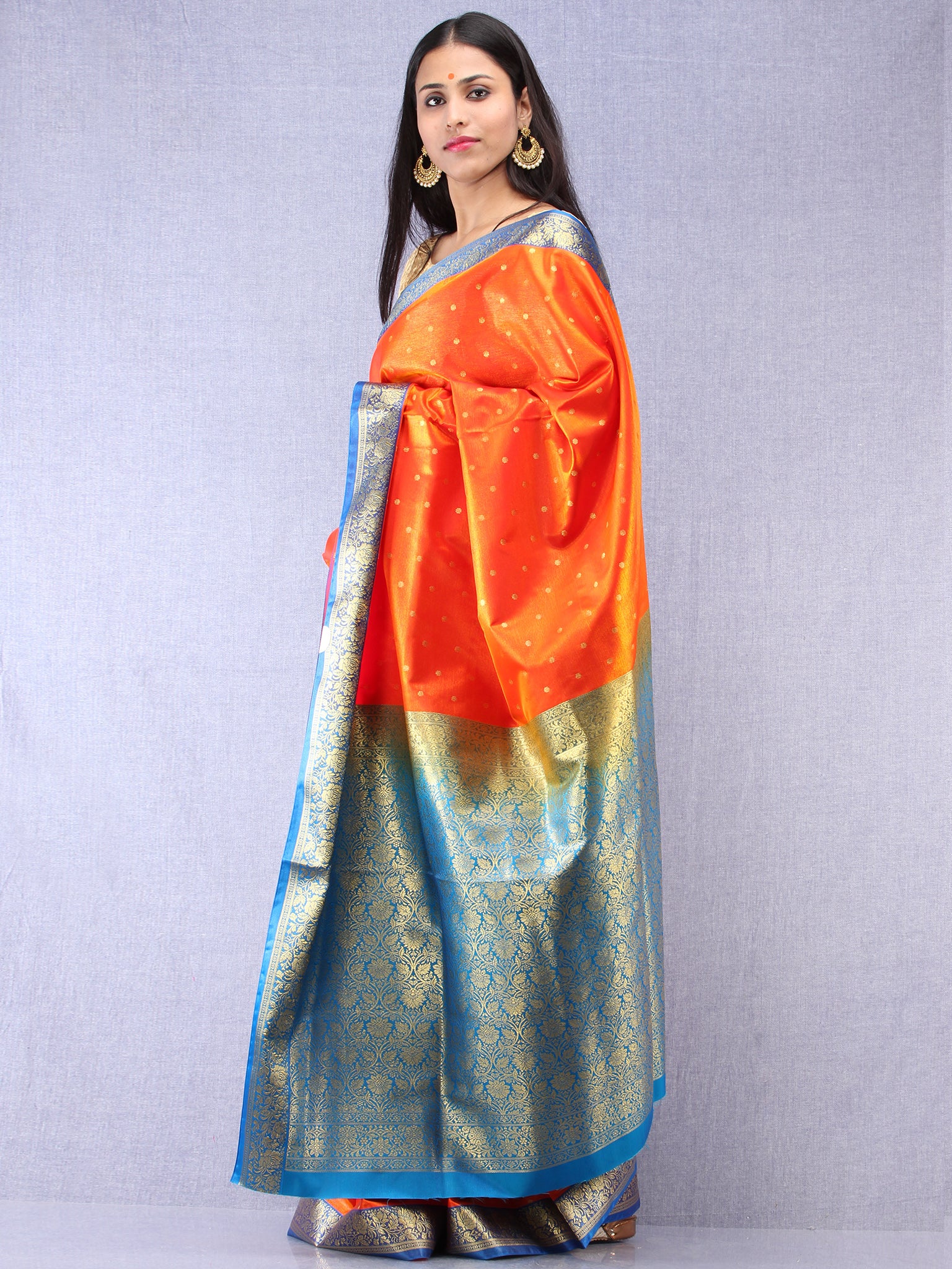 Banarasee Art Silk Self Weave Saree With Zari Work - Orange Sky Blue & Gold - S031704343
