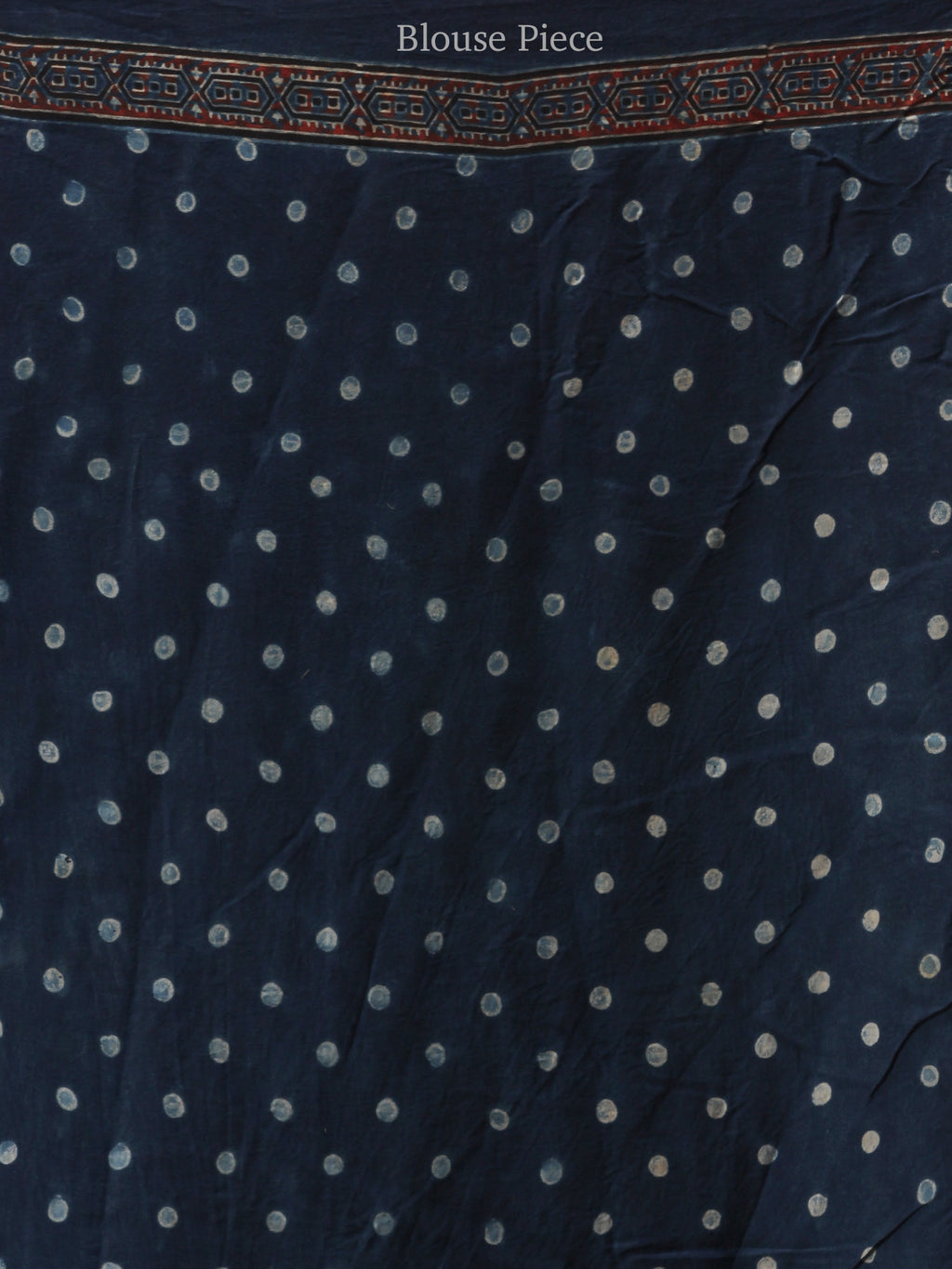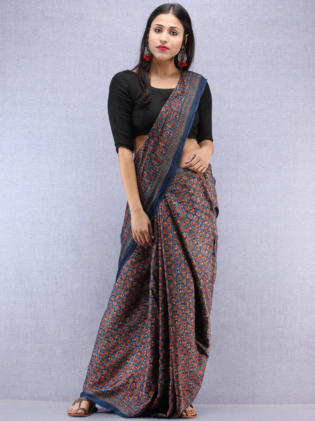 Red Beige Indigo Ajrakh Hand Block Printed Modal Silk Saree - S031704446