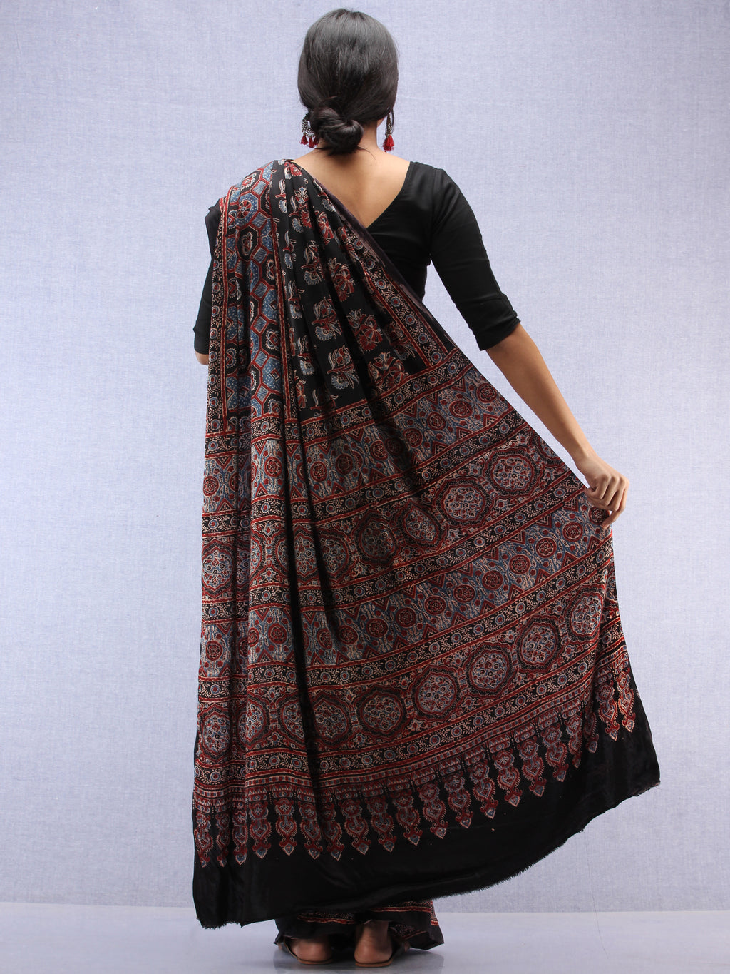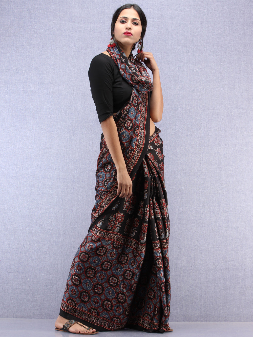Red Black Indigo Ajrakh Hand Block Printed Modal Silk Saree - S031704444