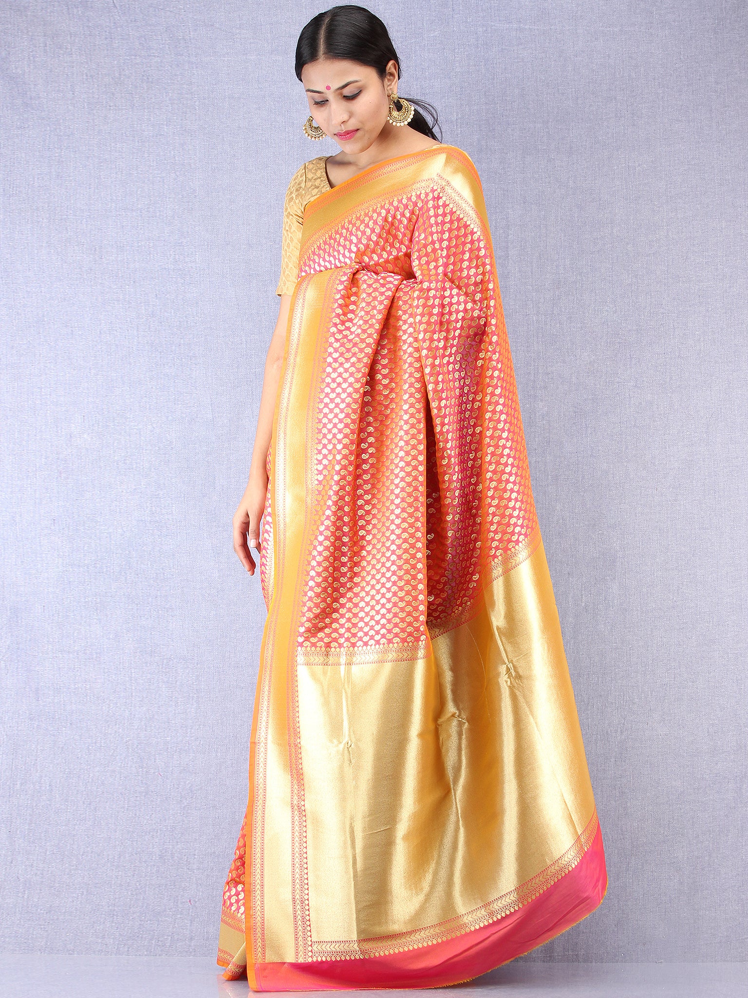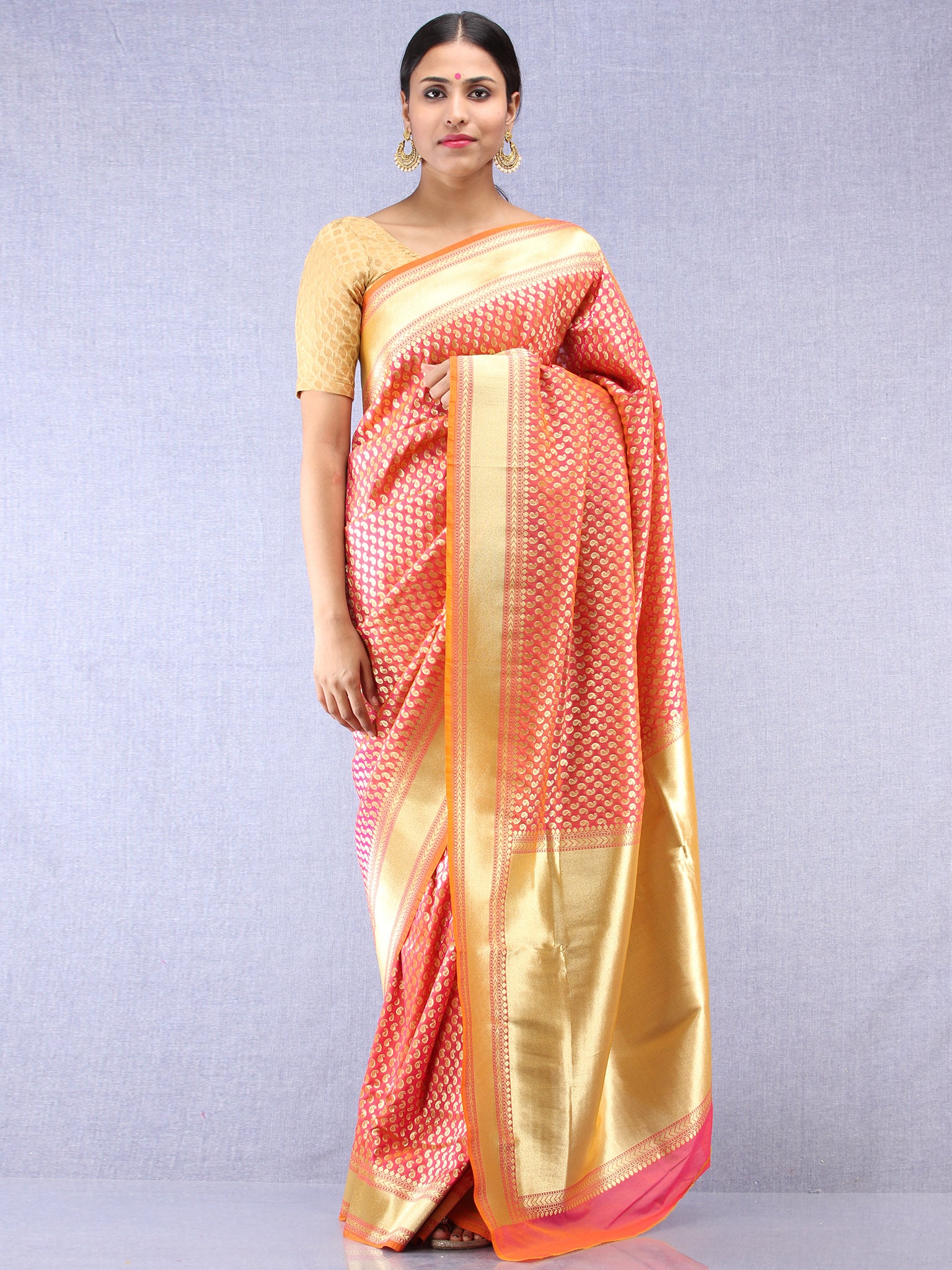 Banarasee Chanderi Silk Paisley Saree With Zari Border - Dual tone Orange Pink & Gold - S031704347