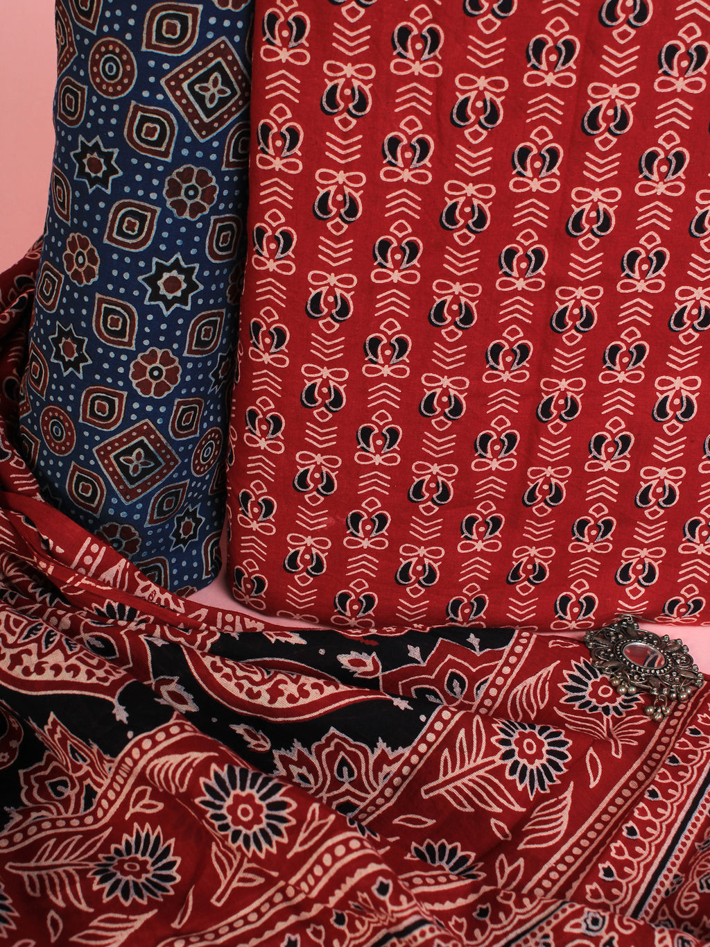 Red Indigo Beige Ajrakh Hand Block Printed Suit Set (Set of 3) - SU01HB464