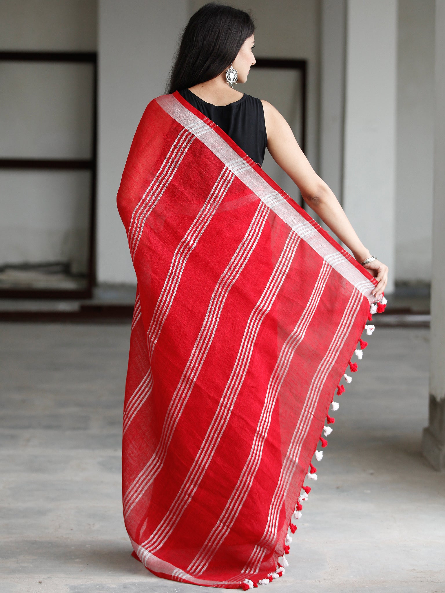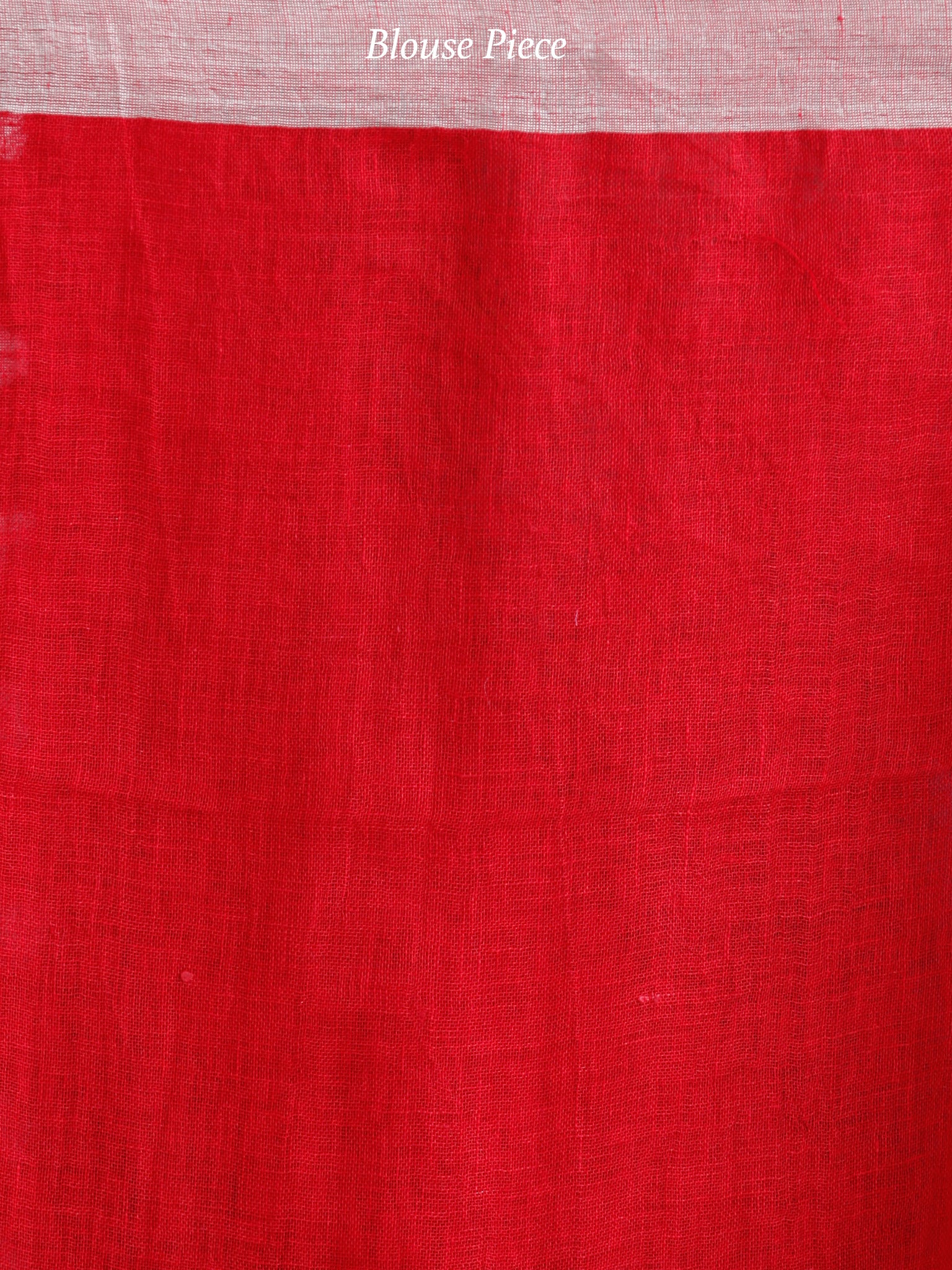 Red Silver Handwoven Linen Saree With Zari Border - S031703741