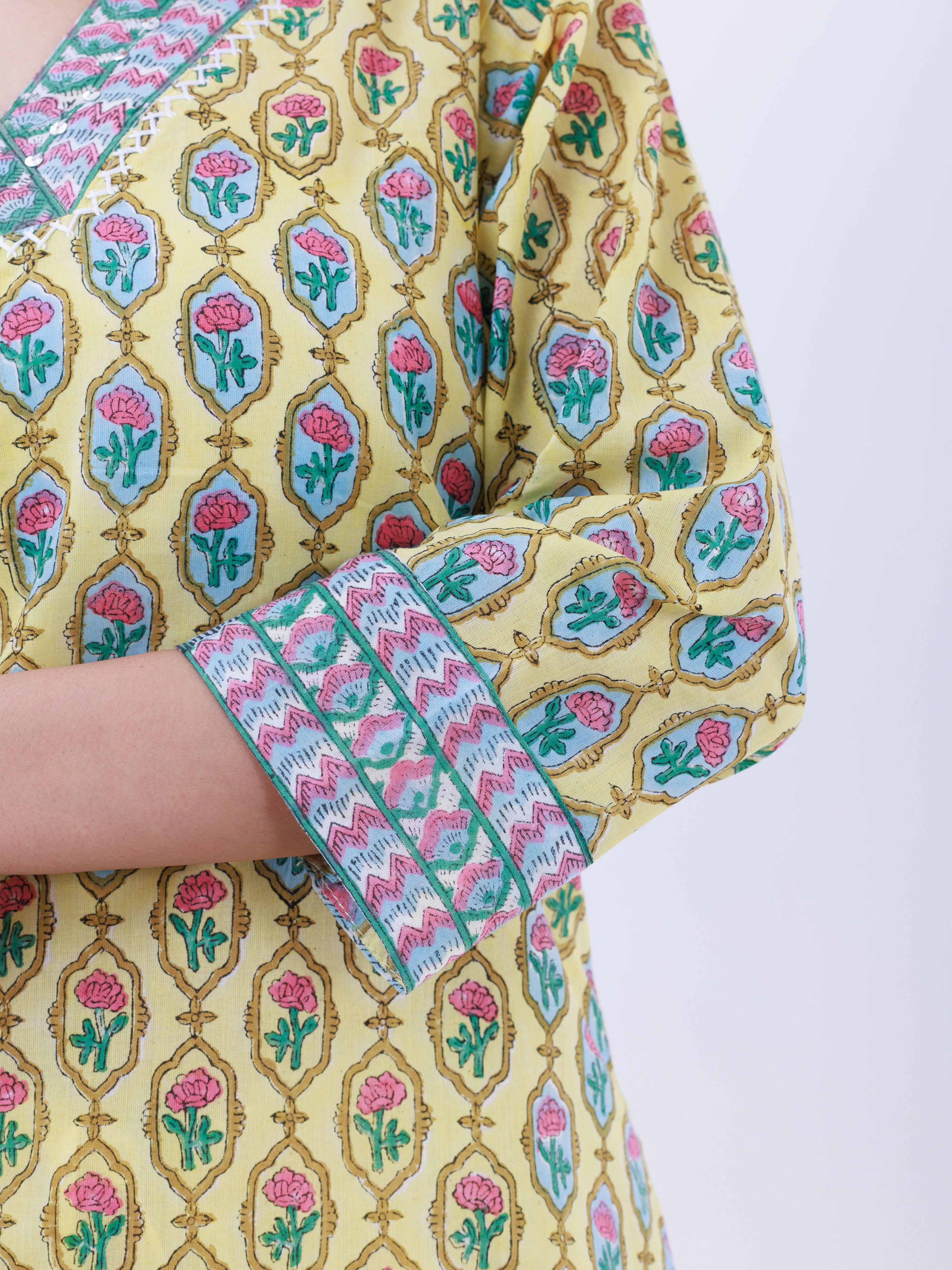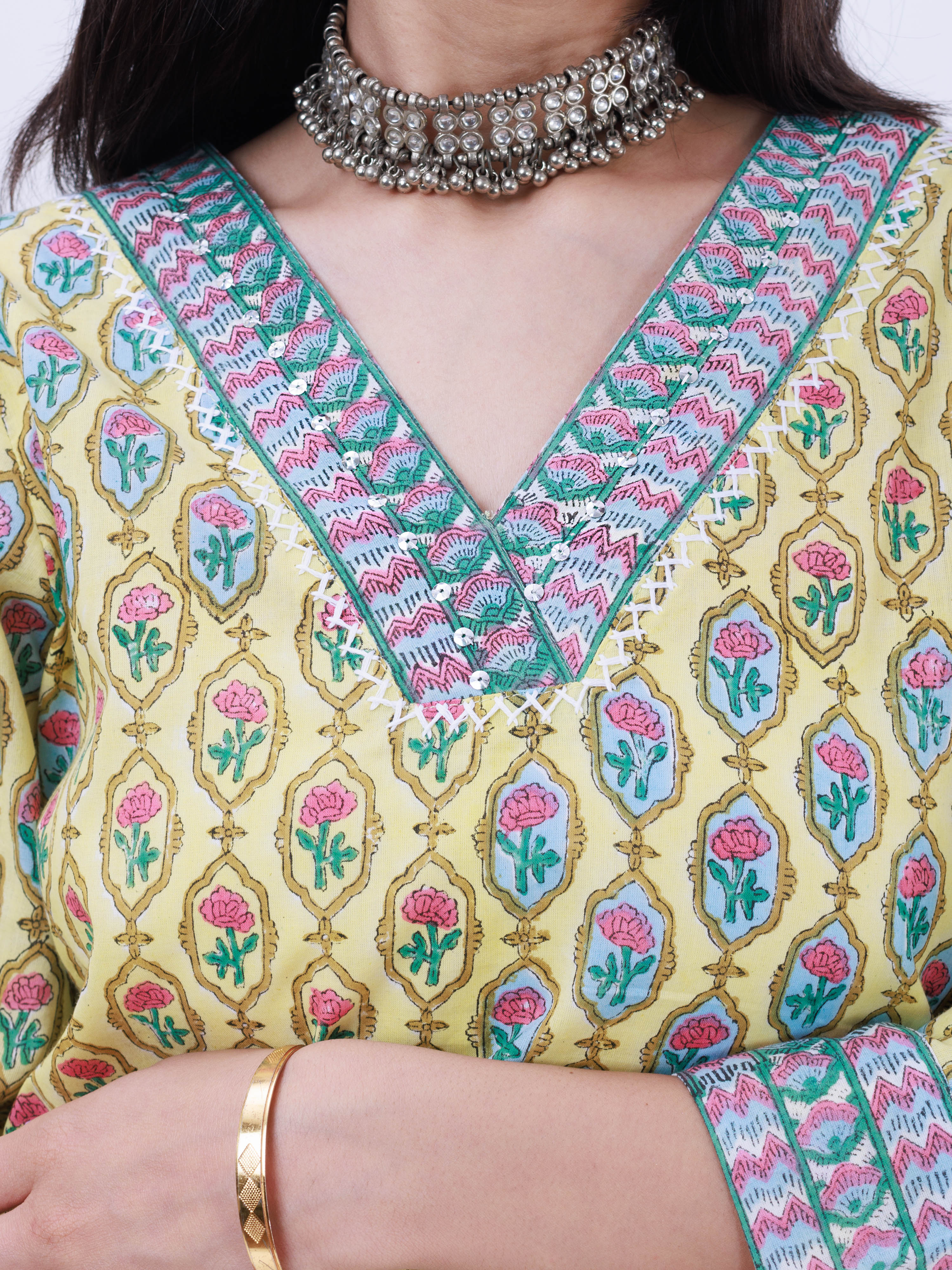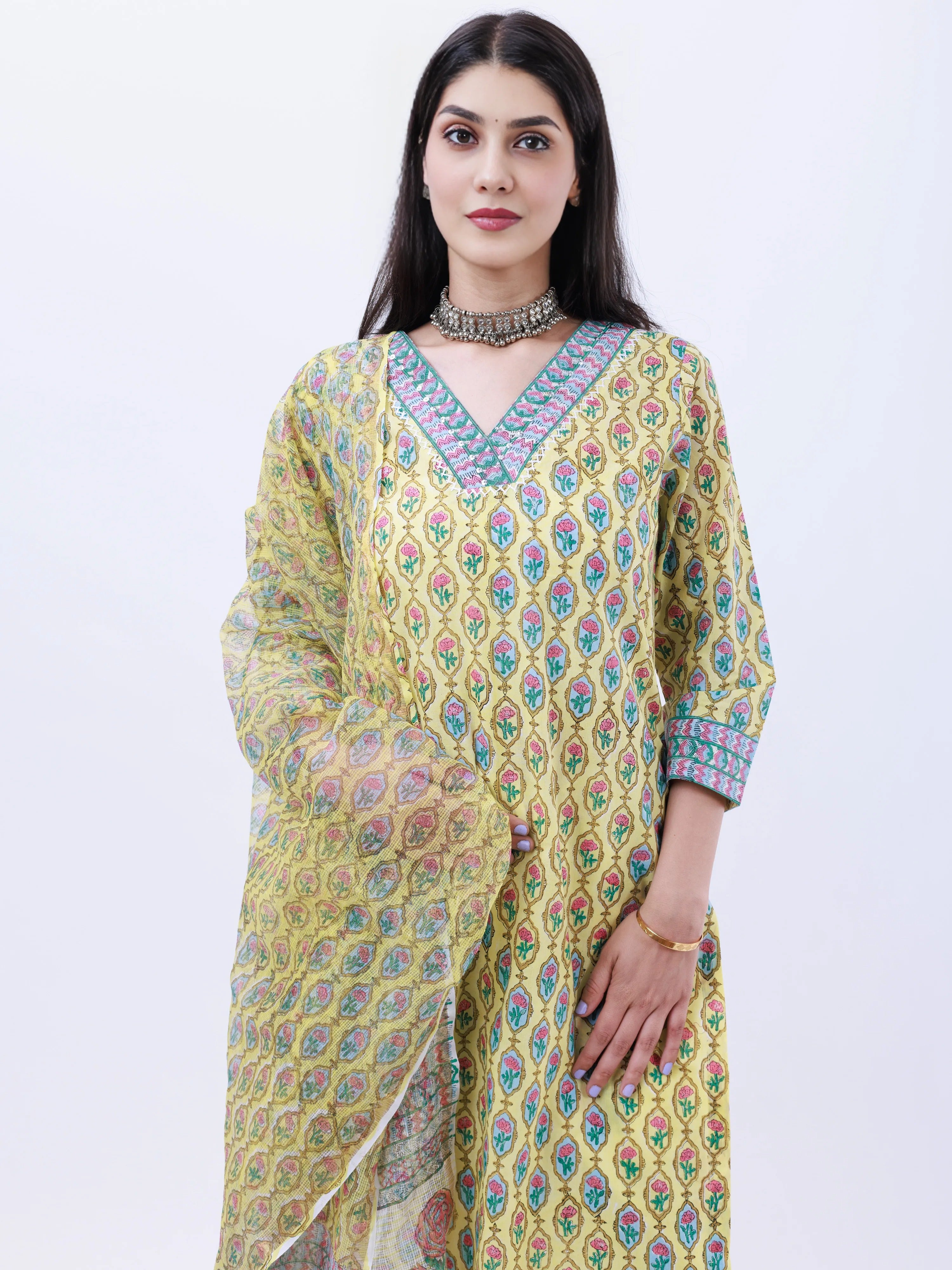 Product: This set contains Handcrafted Sanganeri Premium Cotton Kurta, 100% Cotton Pants and Kota Doria Dupatta.