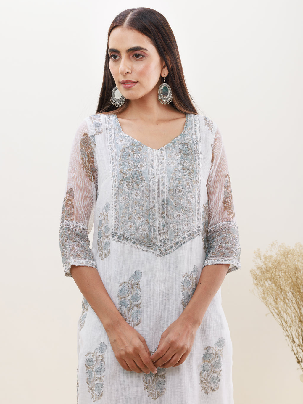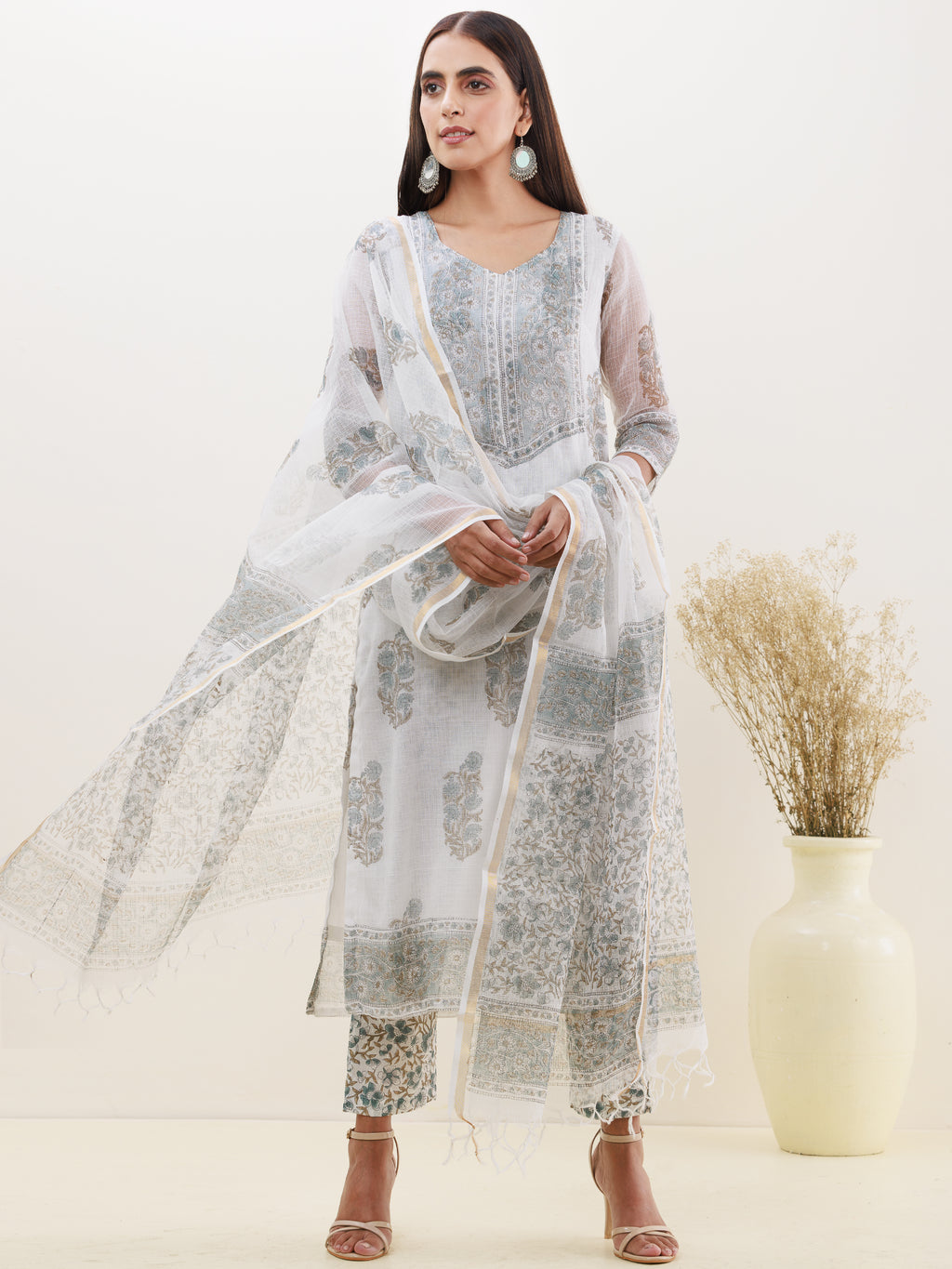 Rozana Tarang Set Of Kota Doria Kurta Pants Dupatta