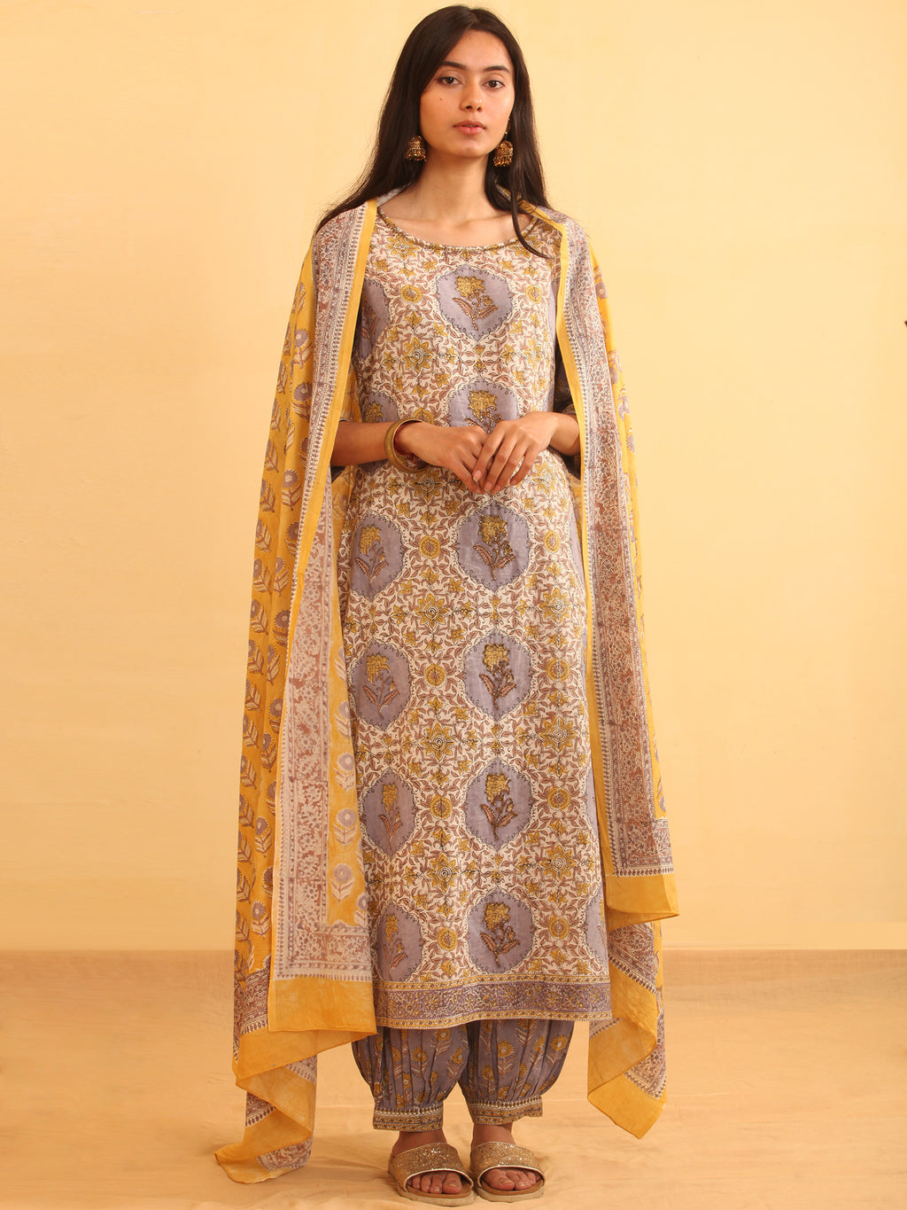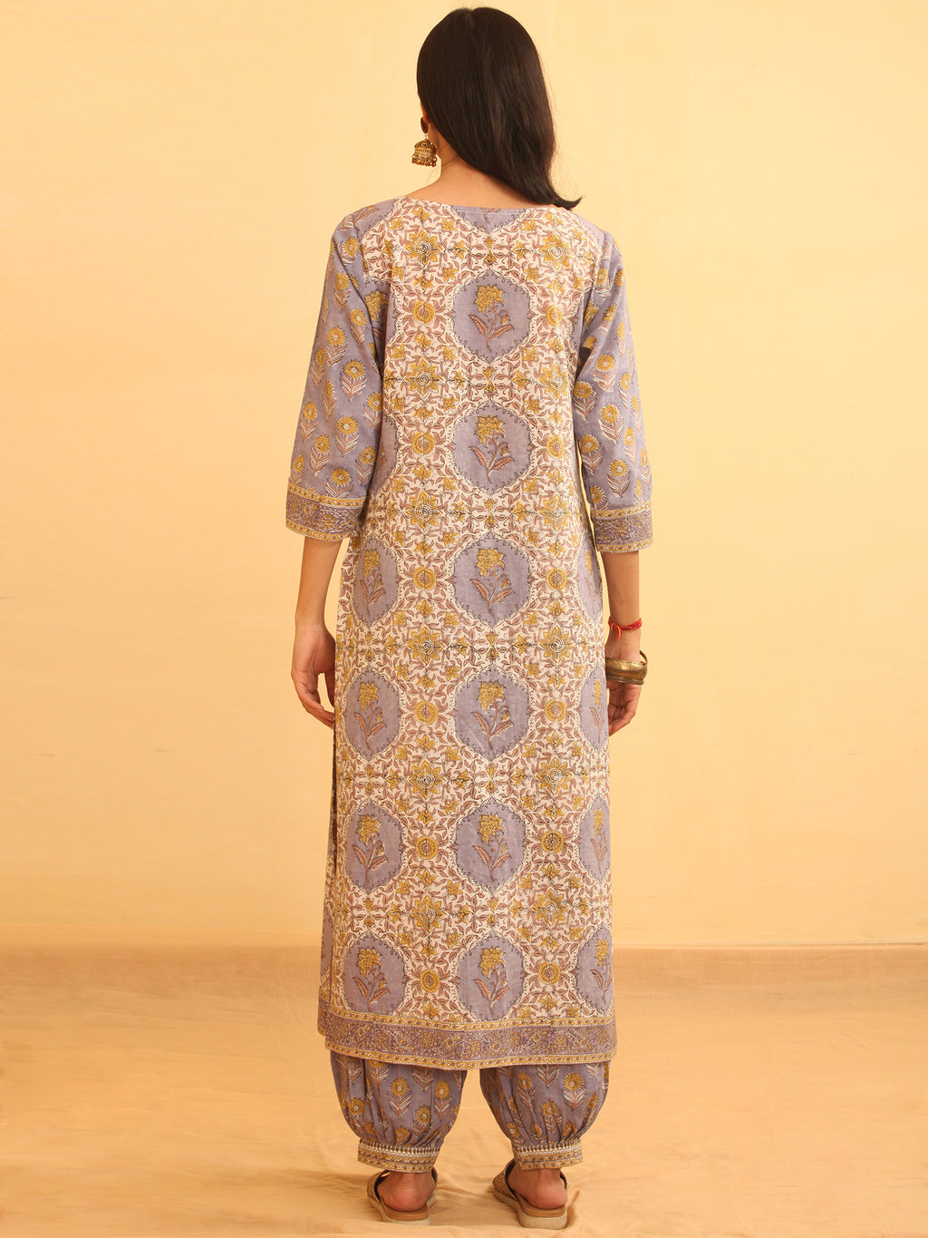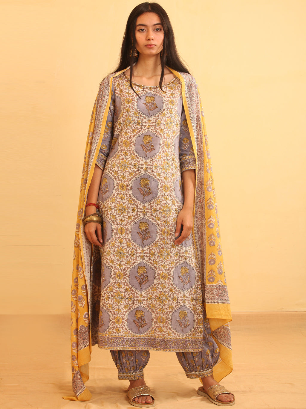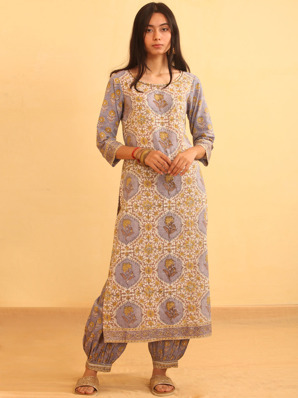 Product: This set contains Handcrafted Sanganeri Premium Cotton Kurta, 100% Cotton Salwar Pants and Cotton Dupatta.