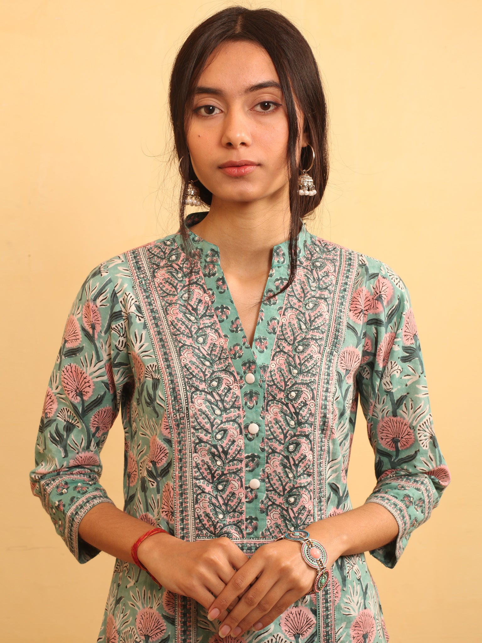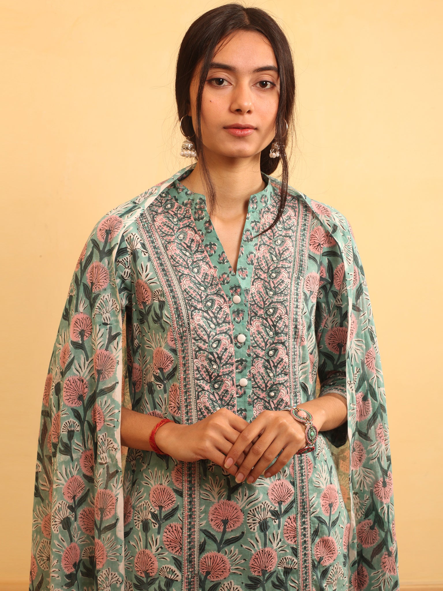 Product: This set contains Handcrafted Sanganeri Premium Cotton Kurta, 100% Cotton Salwar Pants and Cotton Dupatta.