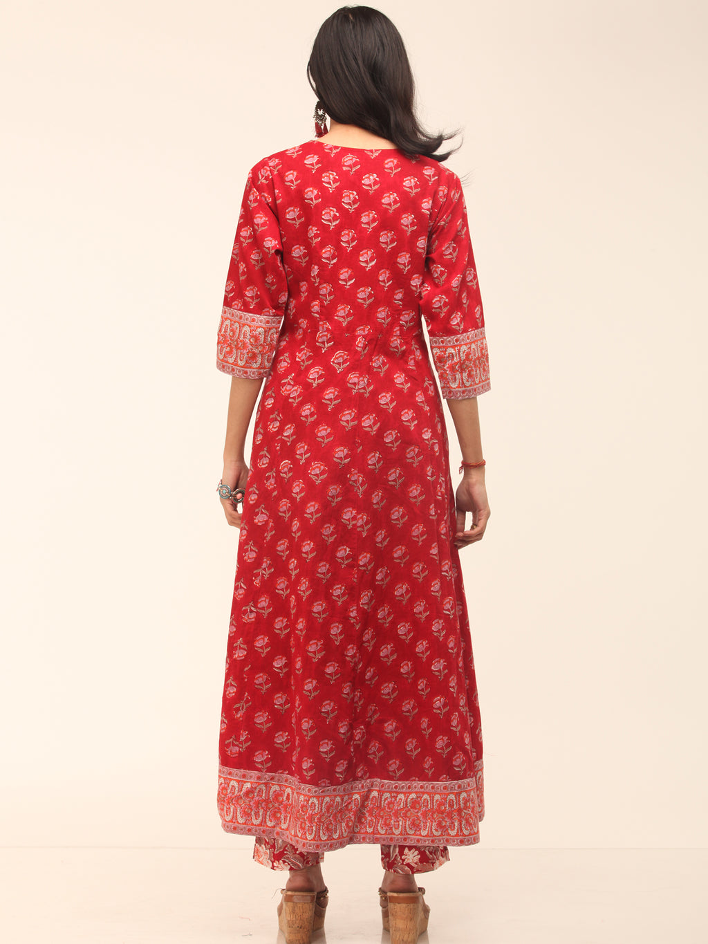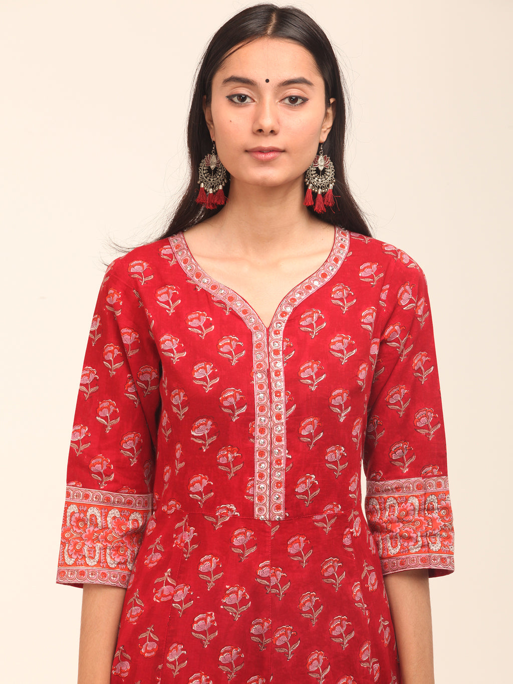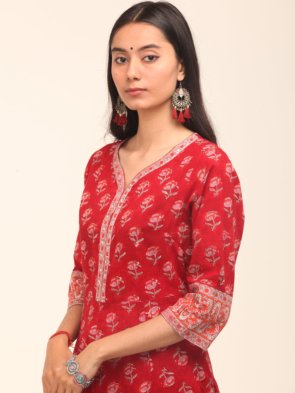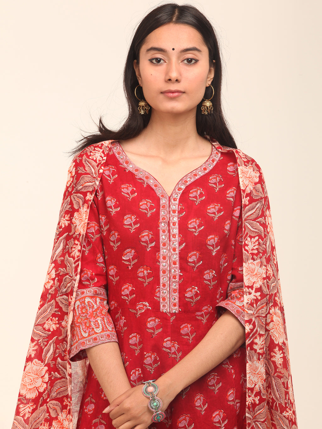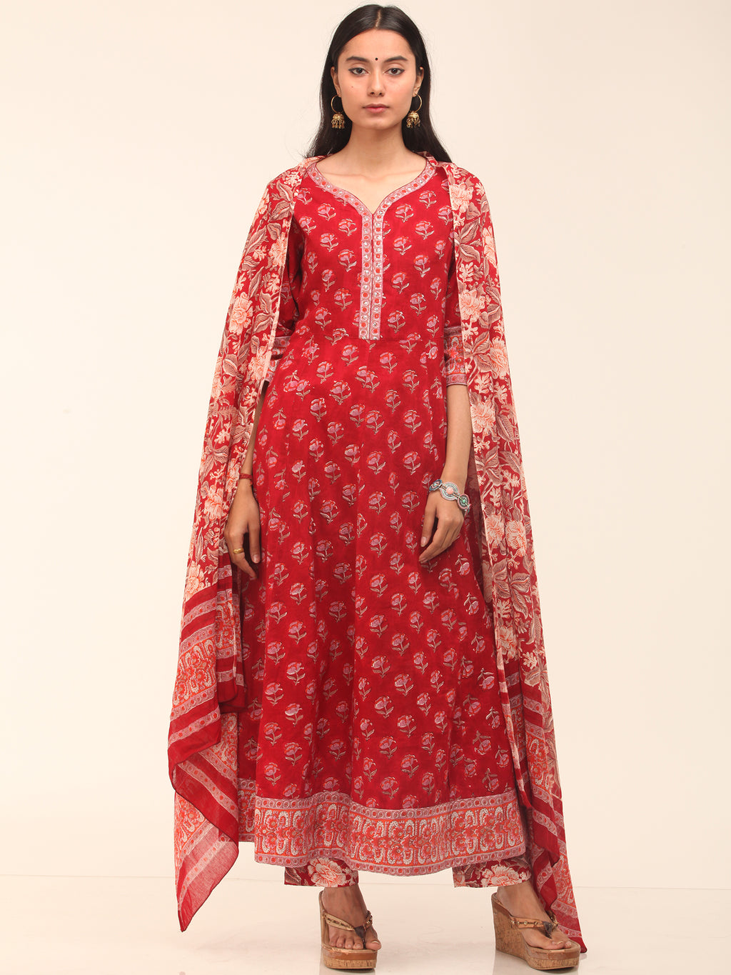 Product: This set contains Handcrafted Sanganeri Premium Cotton Kurta, 100% Cotton Salwar Pants and Cotton Dupatta.