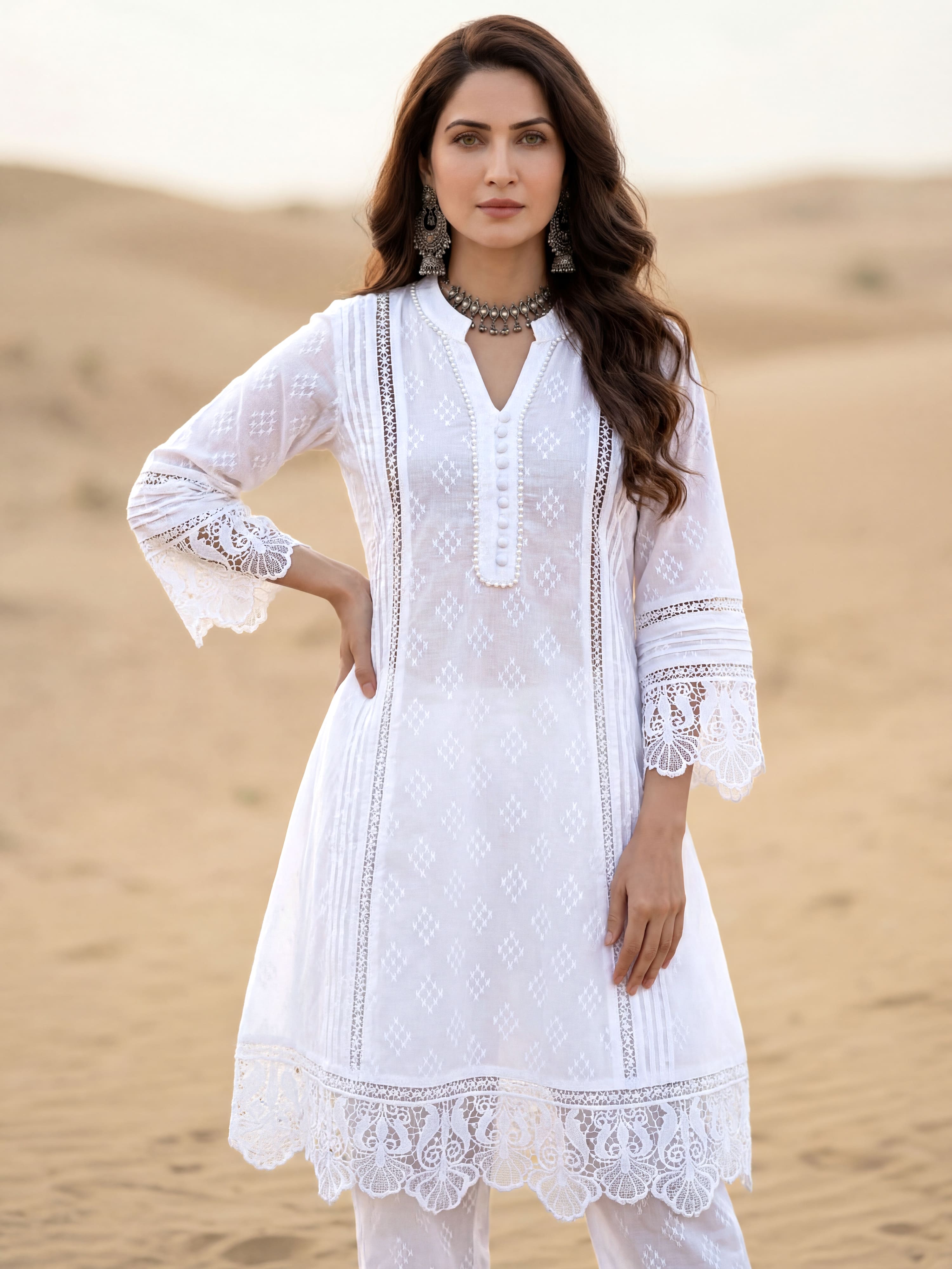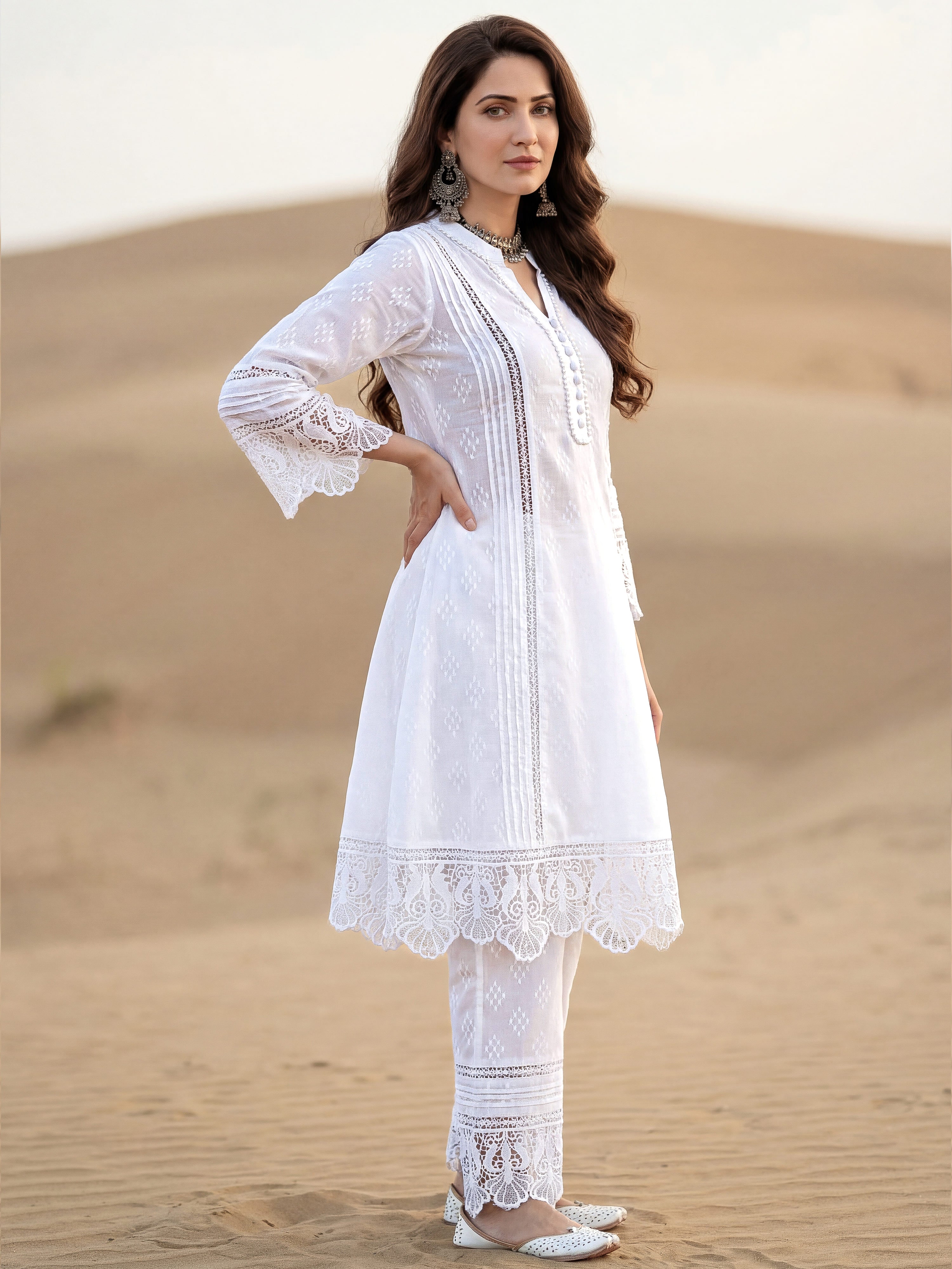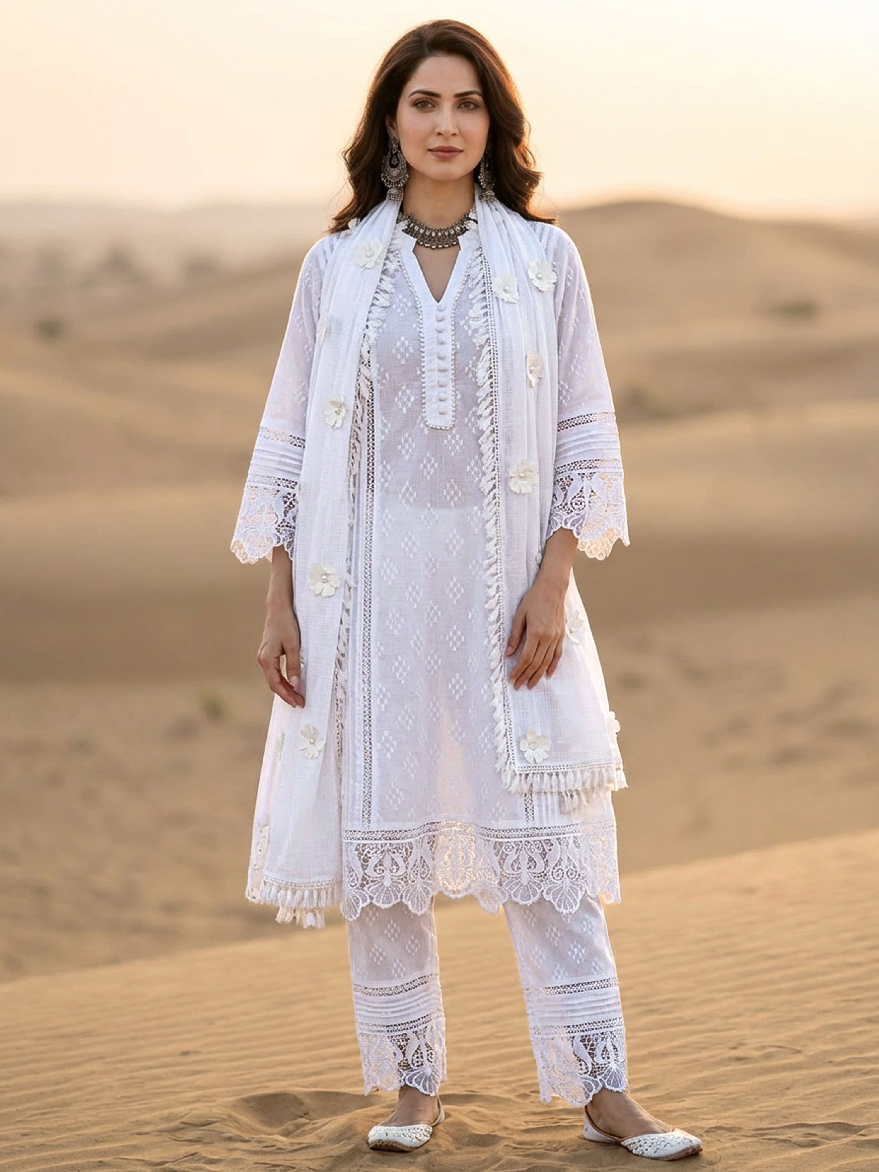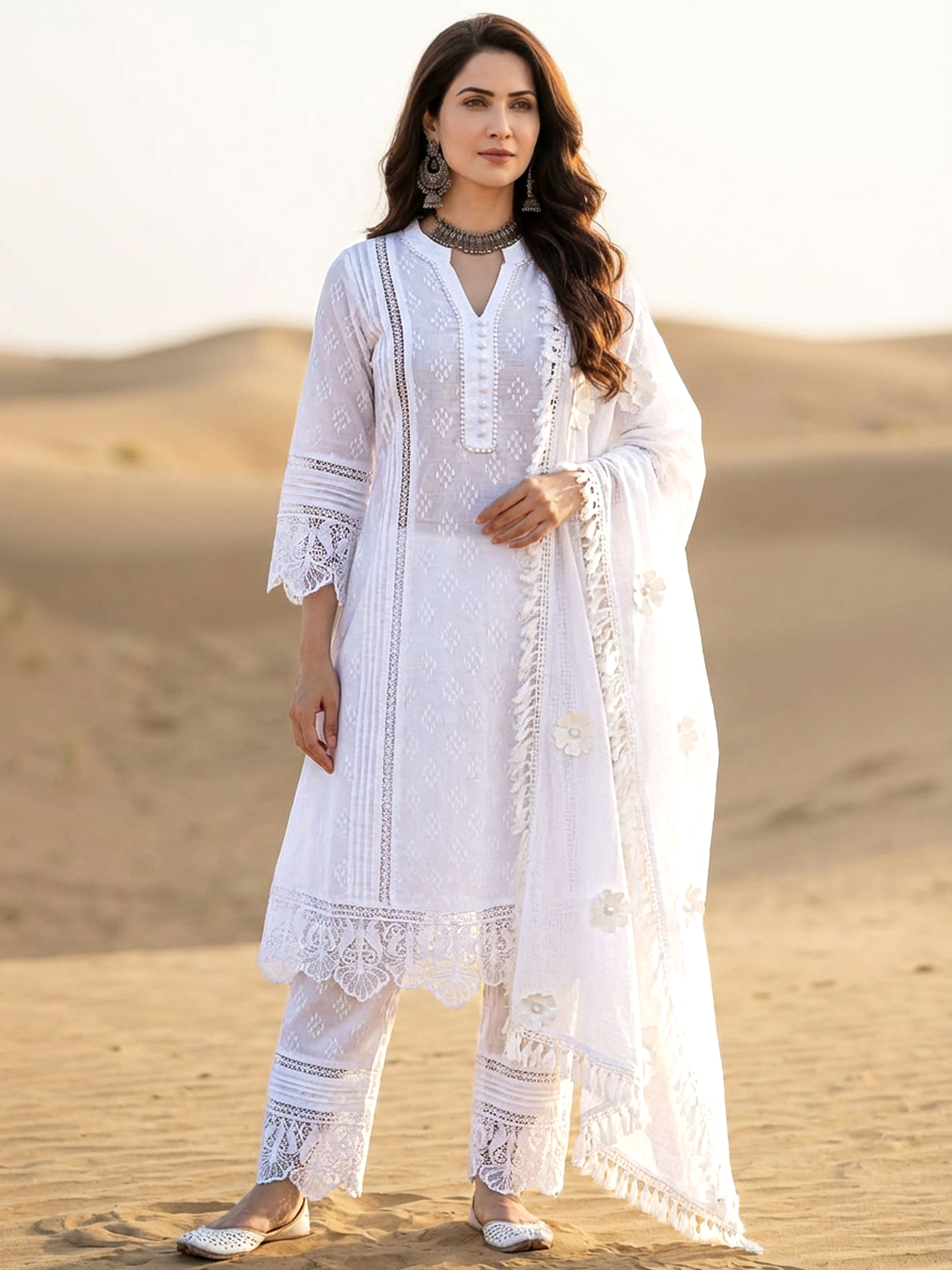 Product: This set contains Hand Block Khadi Printed 100% Premium Cotton White Set of Kurta & Pants with intrinsic lace work and Kota Doria Dupatta.