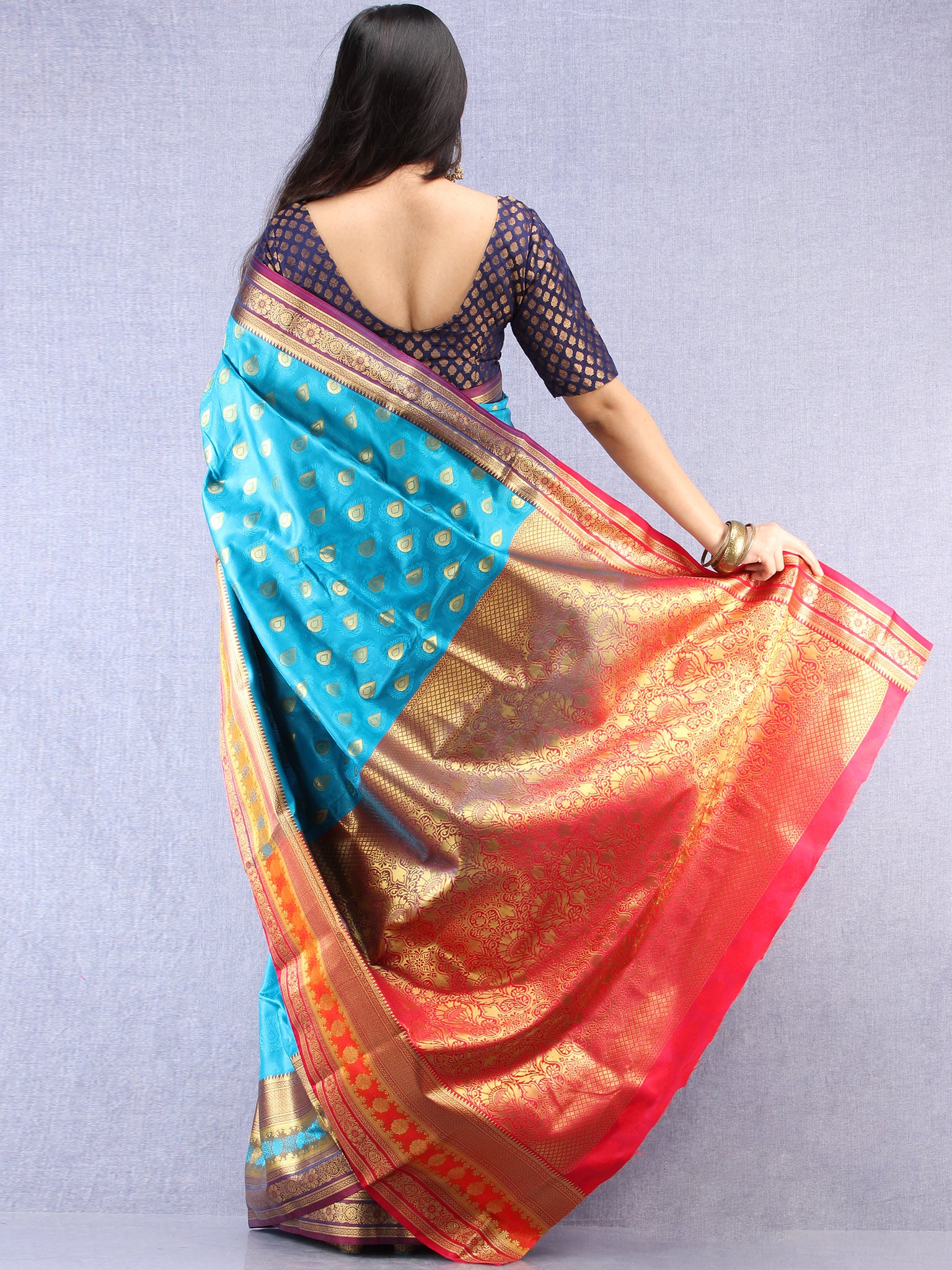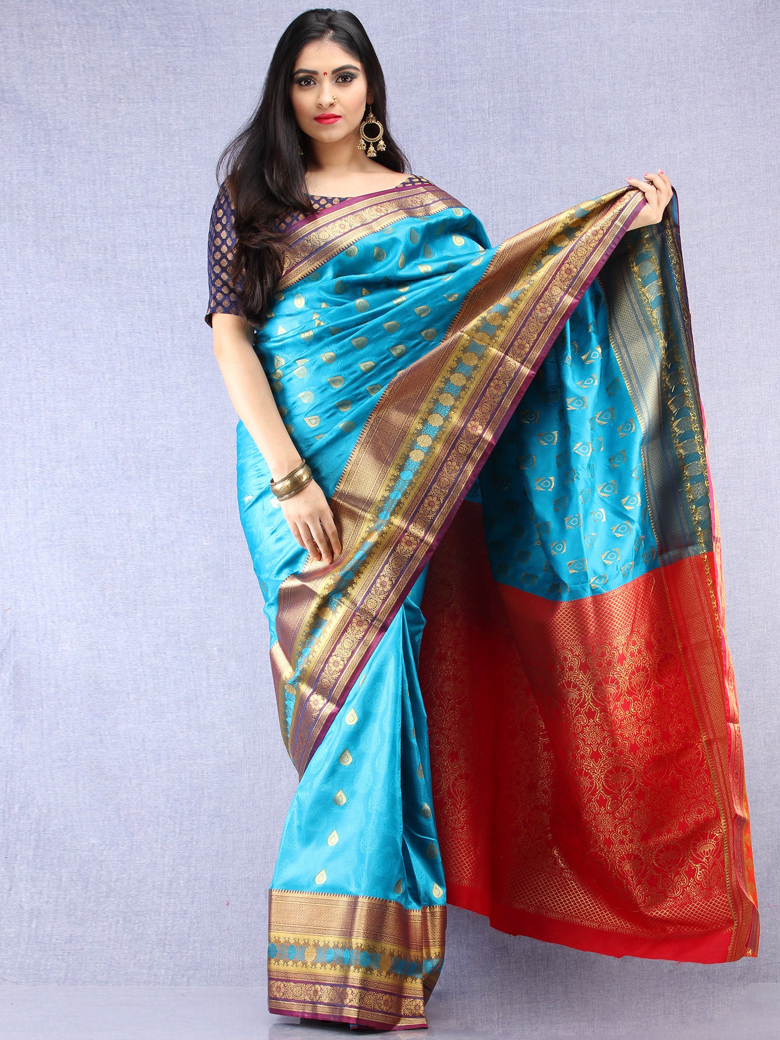 Banarasee Art Silk Saree With Resham Zari Weave - Sky blue Red & Gold - S031704380