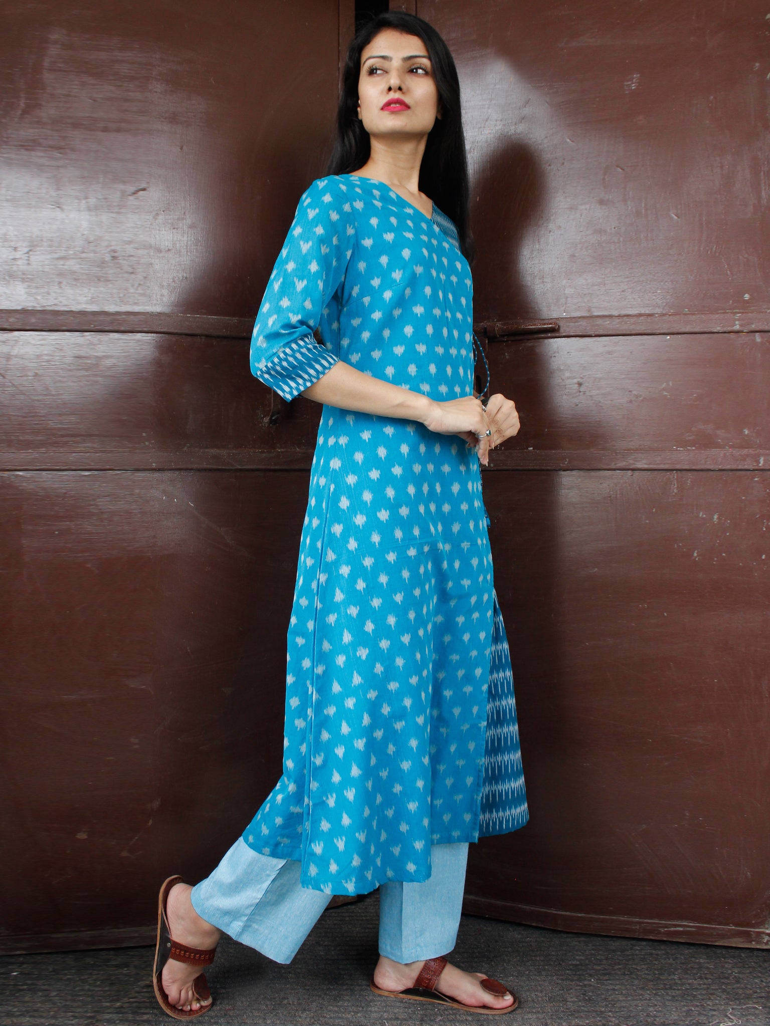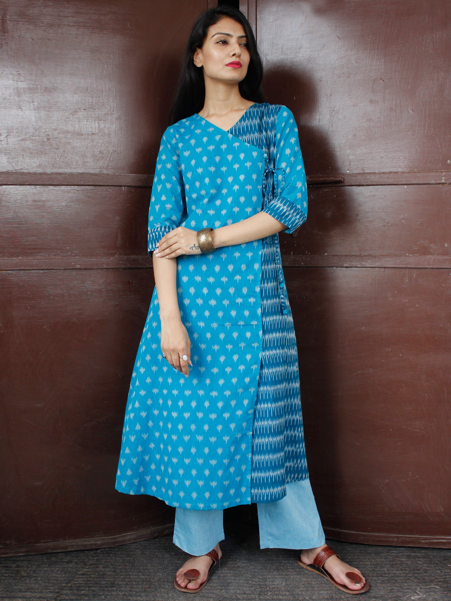 PRODUCT: This Set Contains Hand Woven Silk Cotton Ikat Angrakha Kurta and Straight Pant . The fabric of this dress is 100% pure cotton, fully hand-woven in Ikat style of dyeing.