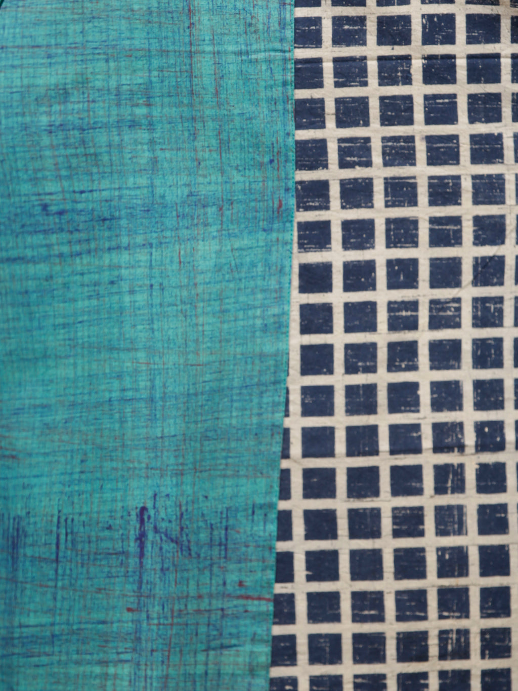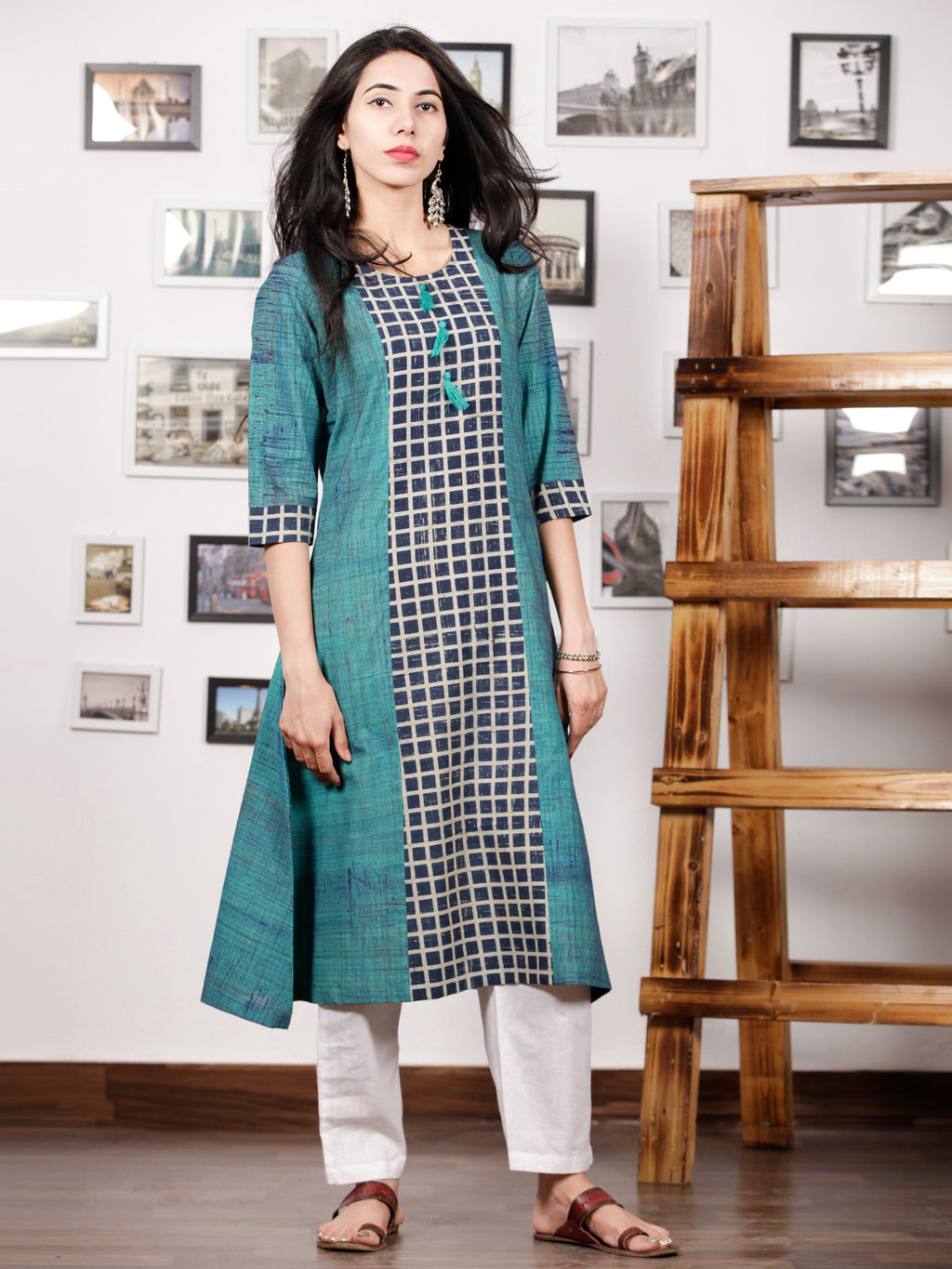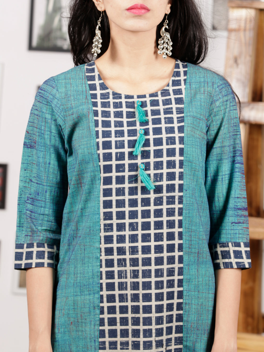 Teal Green Indigo White Hand Printed Ajrakh Kurta With Tassels - K72F1542
