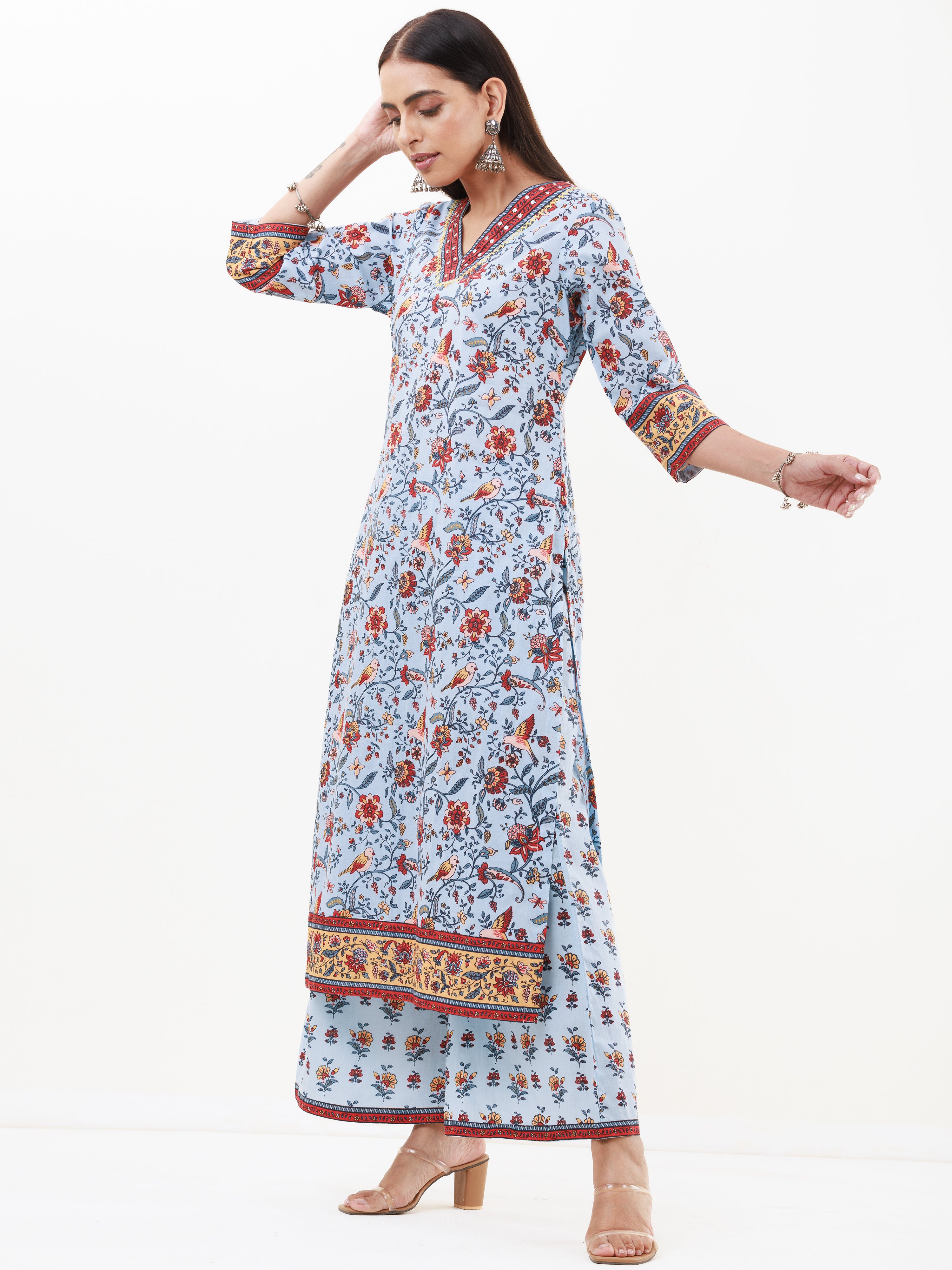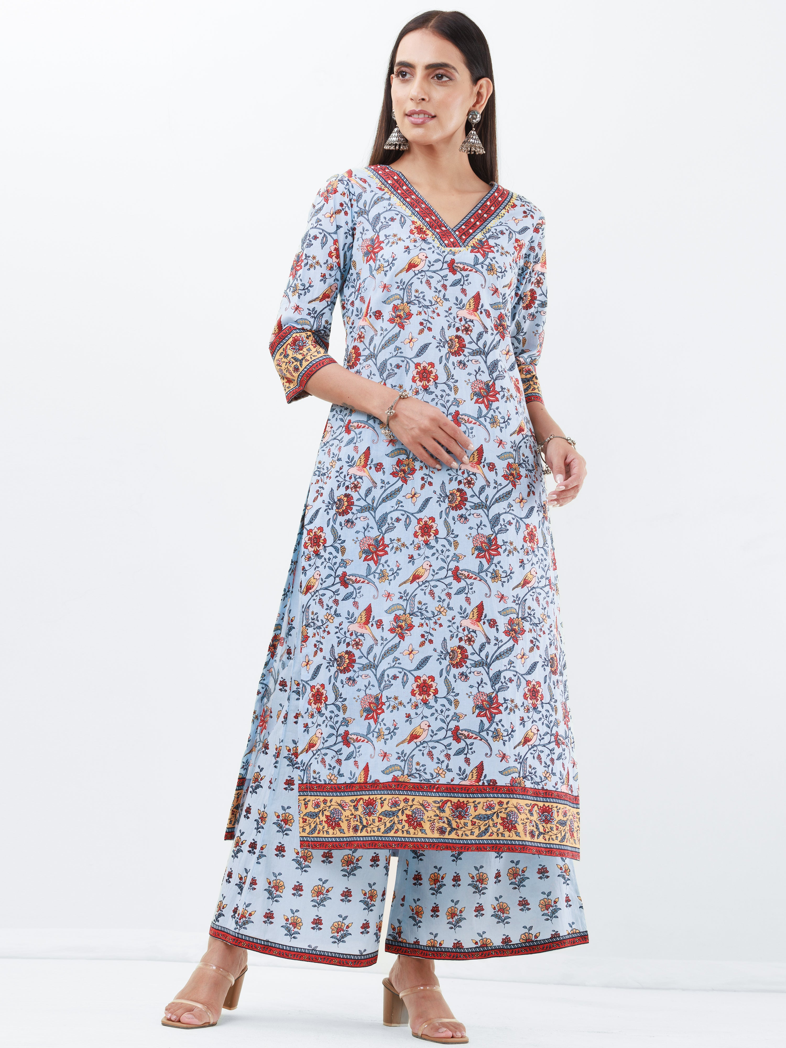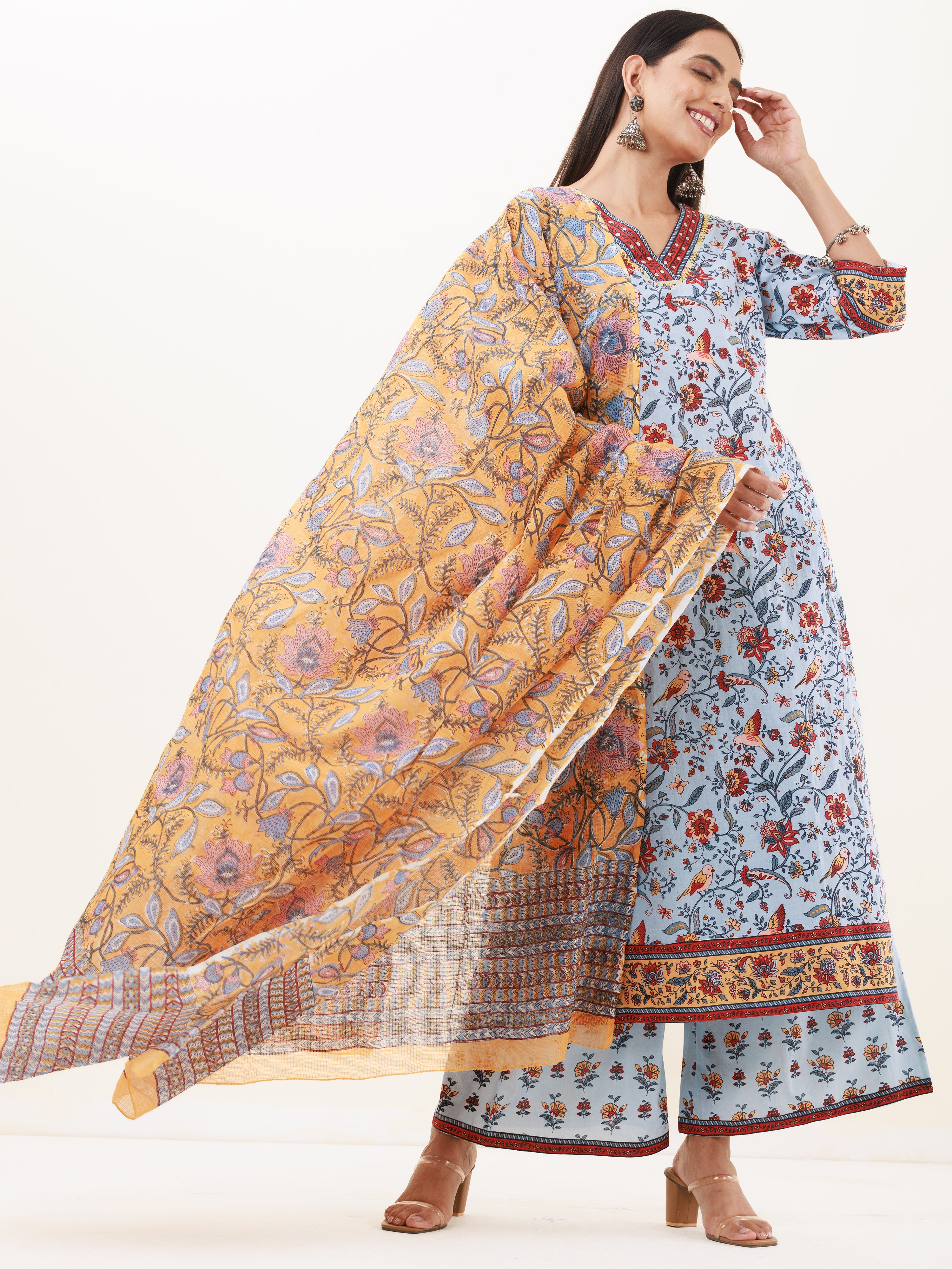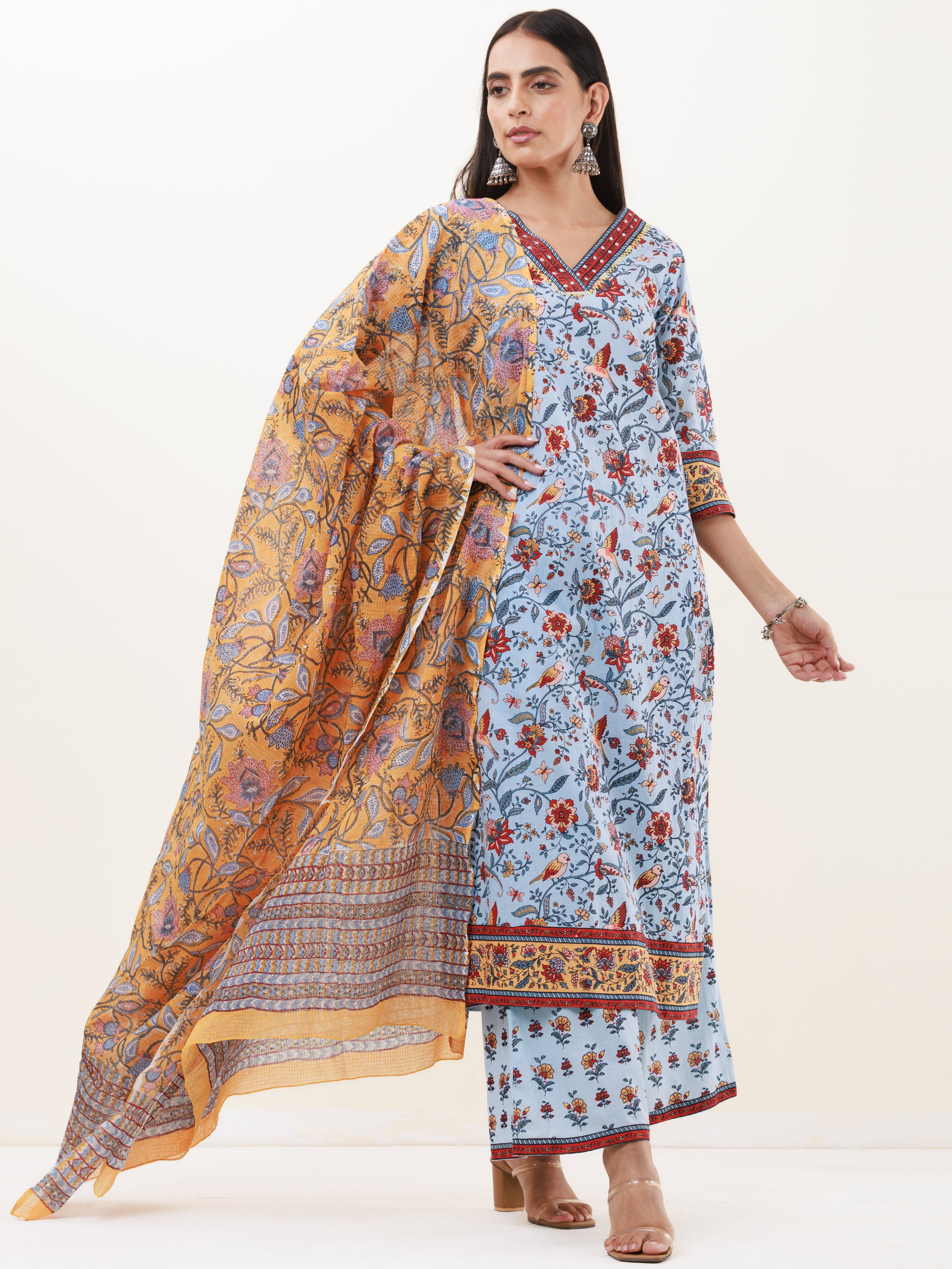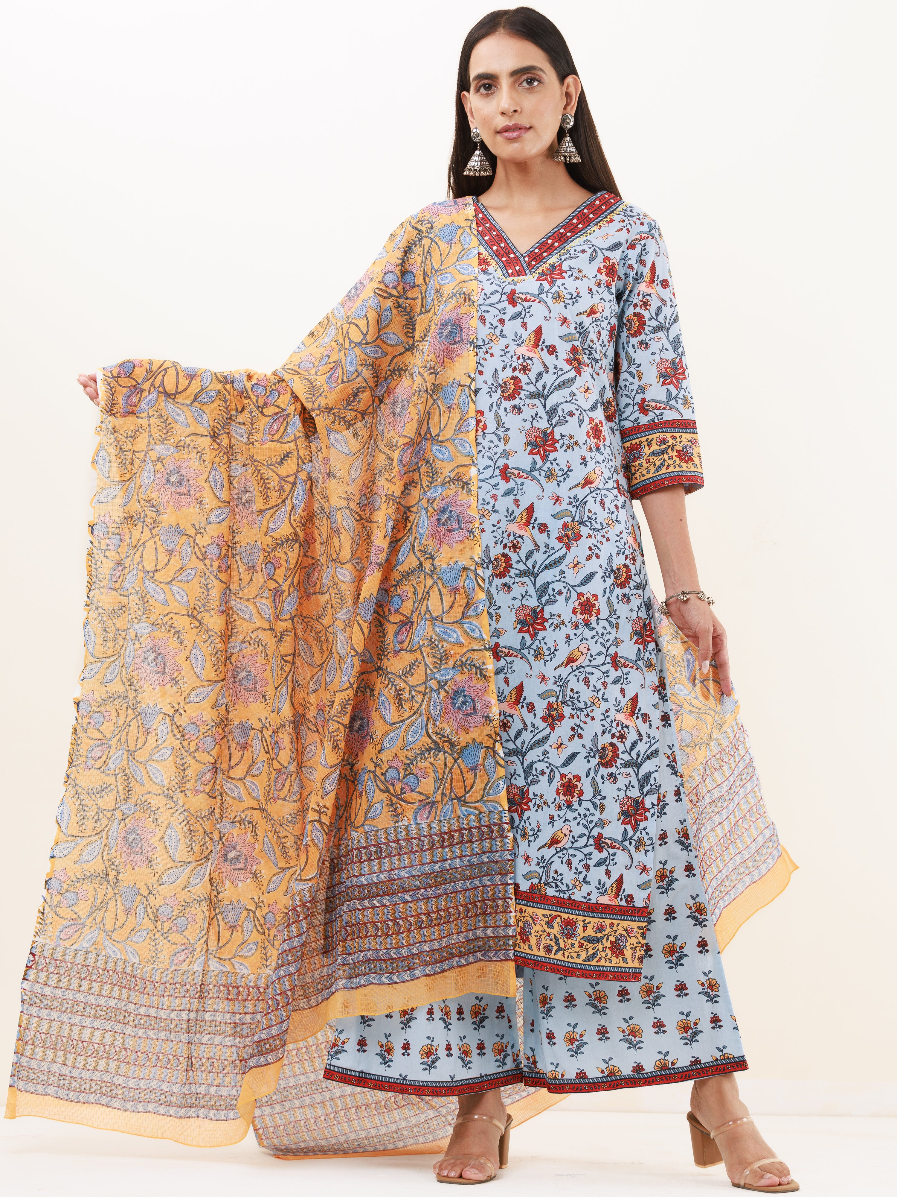 Product: This set contains Handcrafted Sanganeri Premium Cotton Kurta, 100% Cotton Pants and Kota Doria Dupatta.
