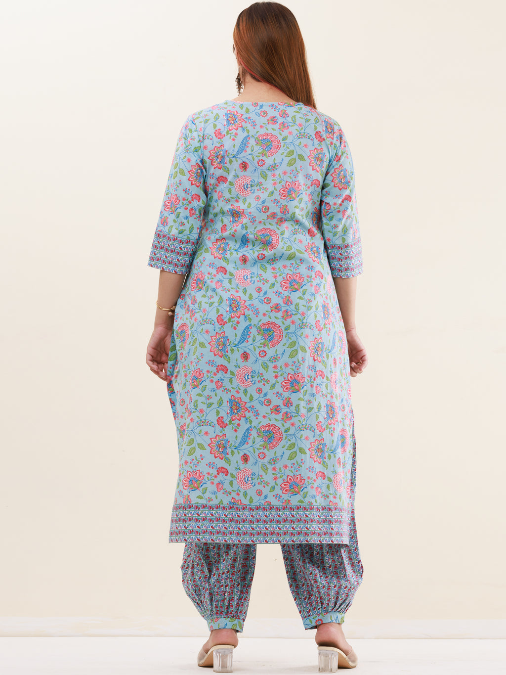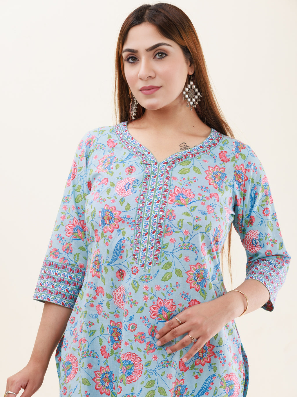 Product: This set contains Handcrafted Sanganeri Premium Cotton Kurta, 100% Cotton Pants and Kota Doria Dupatta.