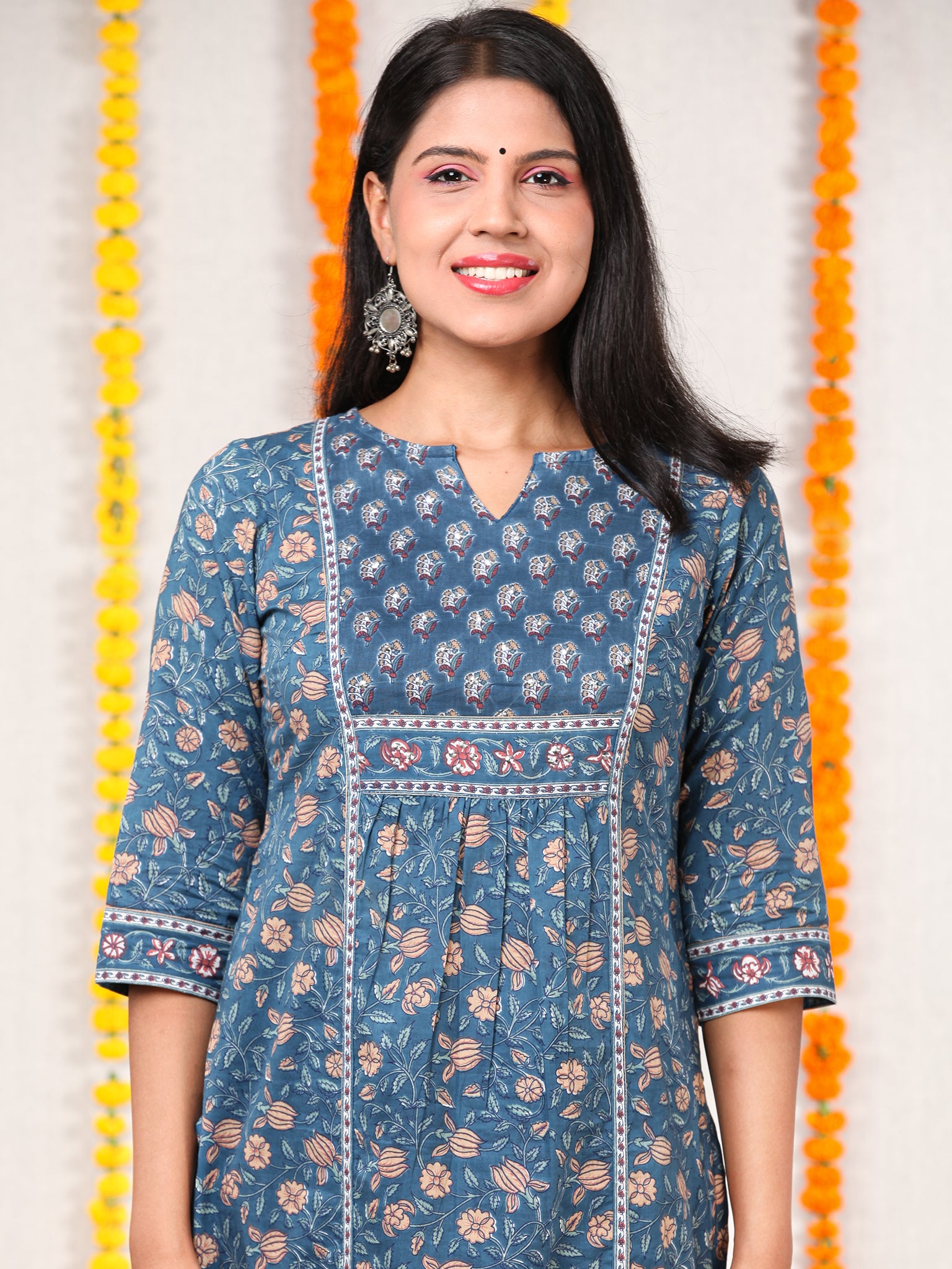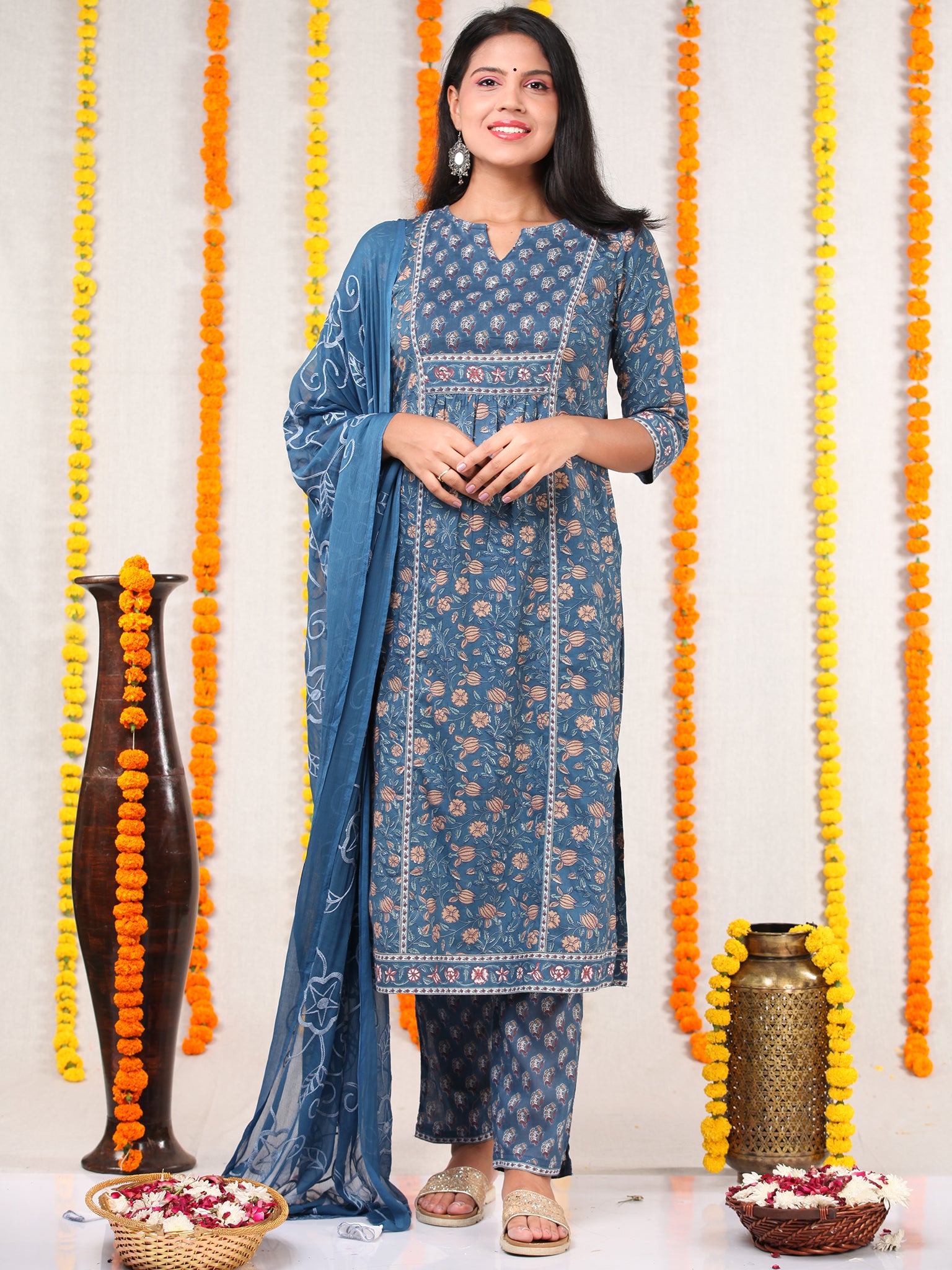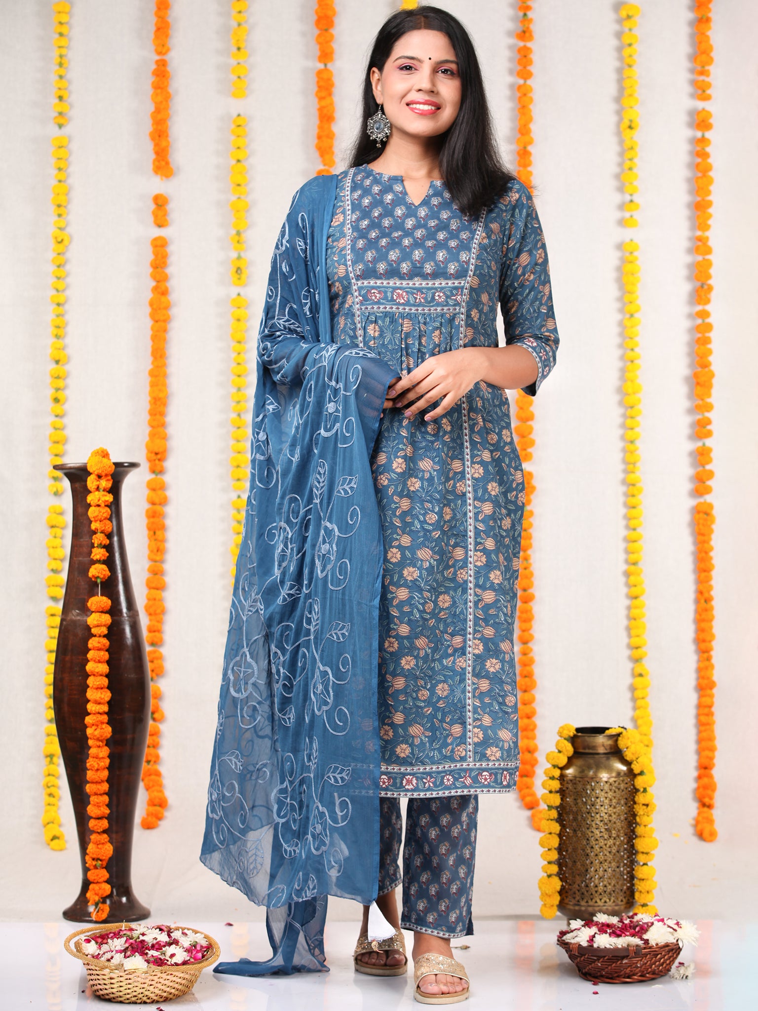 Product: This set contains Handcrafted Sanganeri Premium Cotton Kurta, 100% Cotton Pants and Cotton Dupatta.