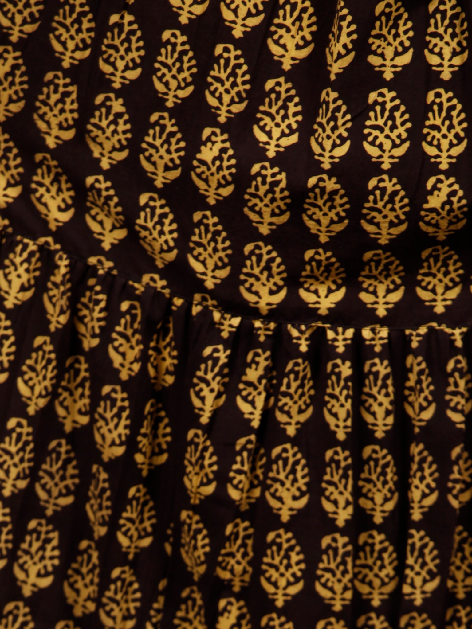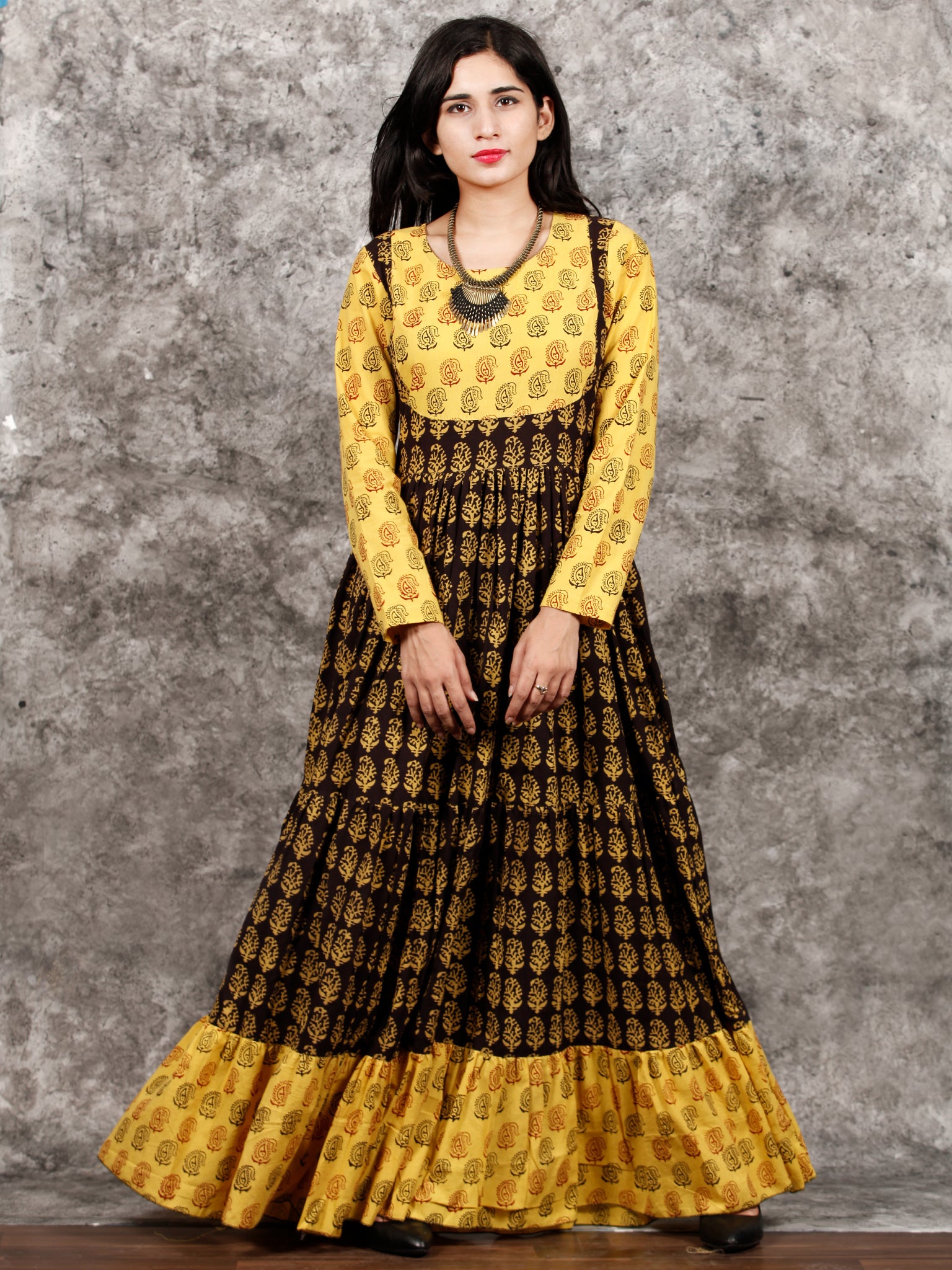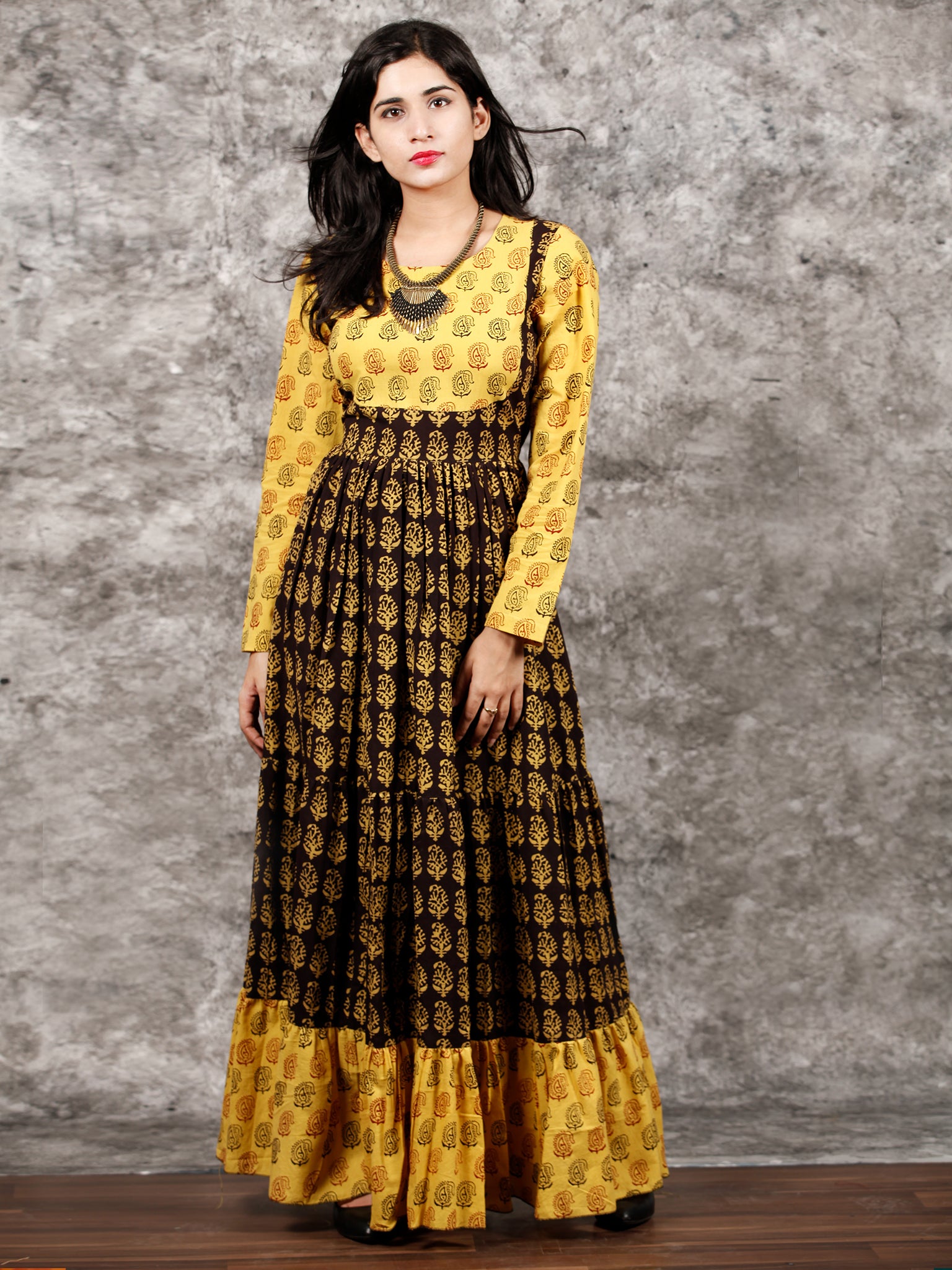 Yellow Black Maroon Bagh Printed Cotton Long Tier Dress - D135F1701