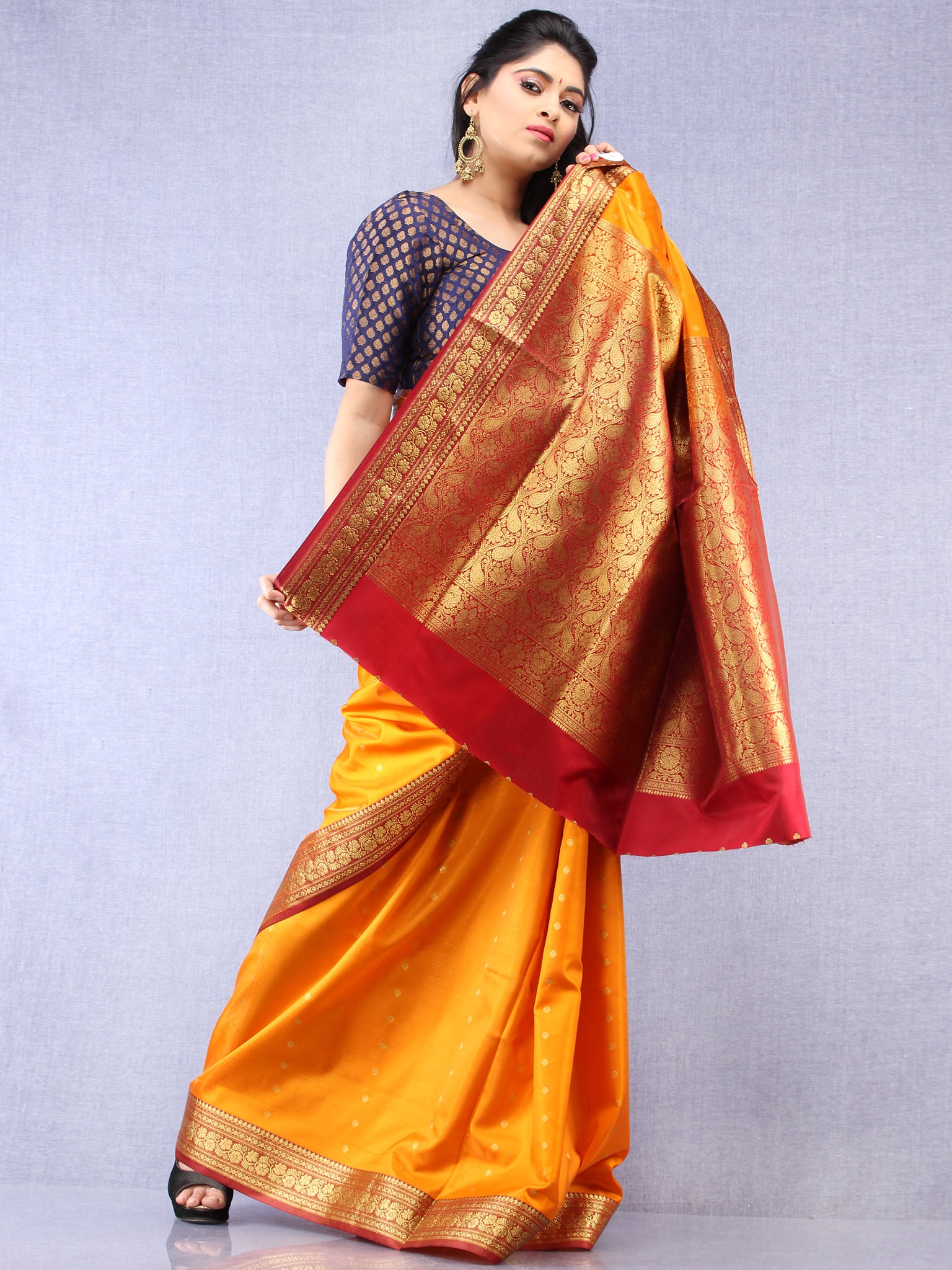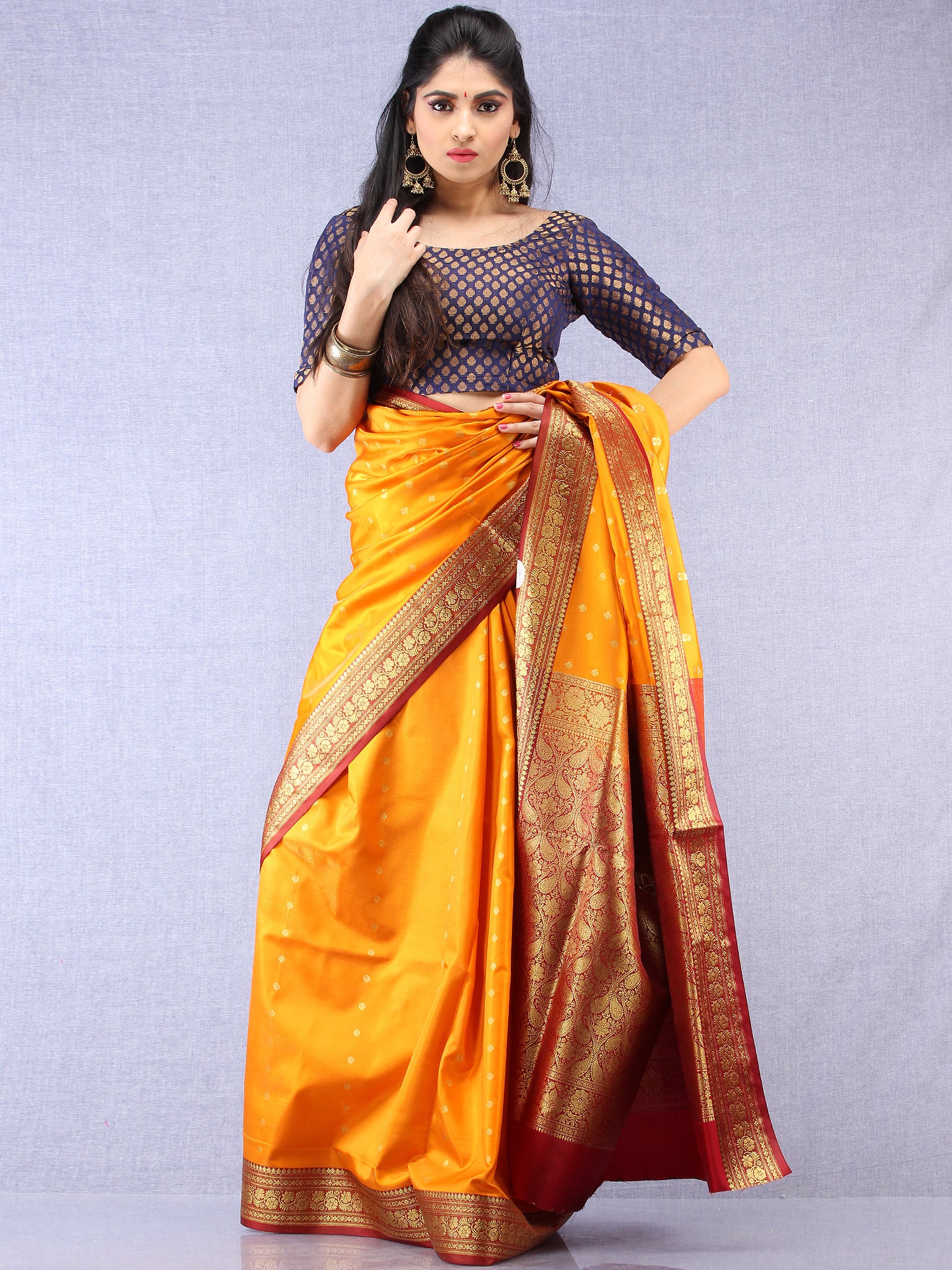 Banarasee Art Silk Self Weave Saree With Zari Work - Mustard Yellow Red & Gold - S031704340